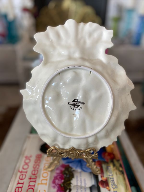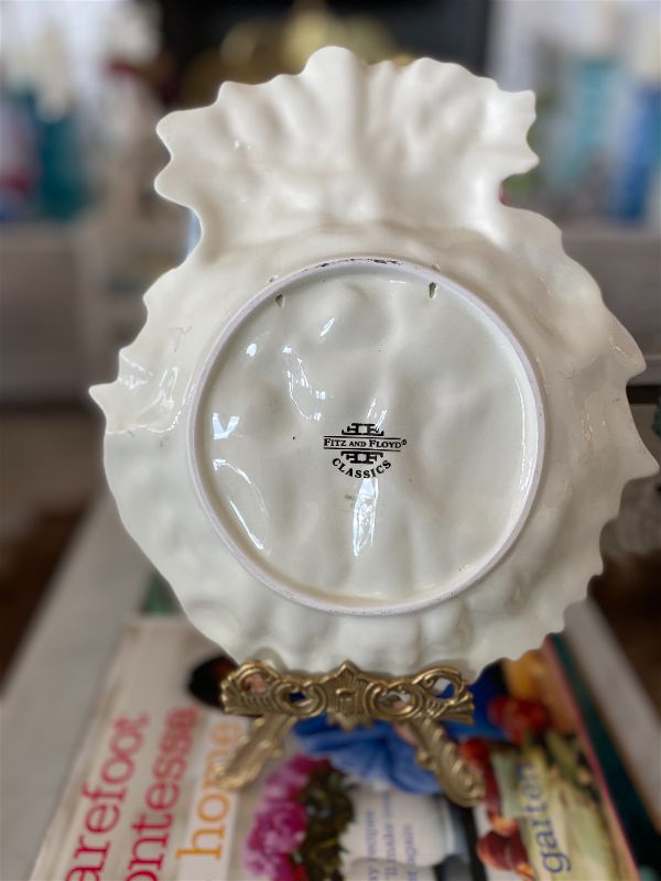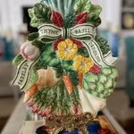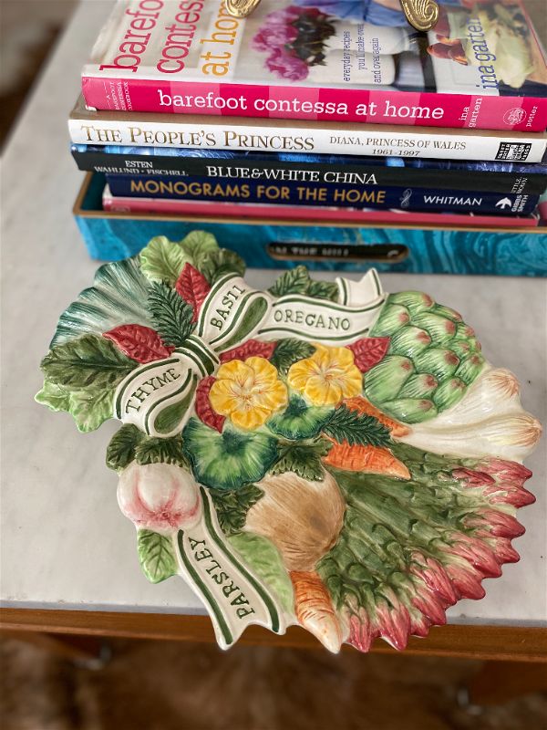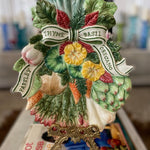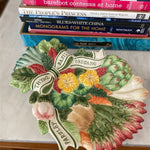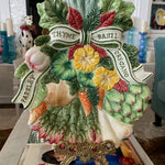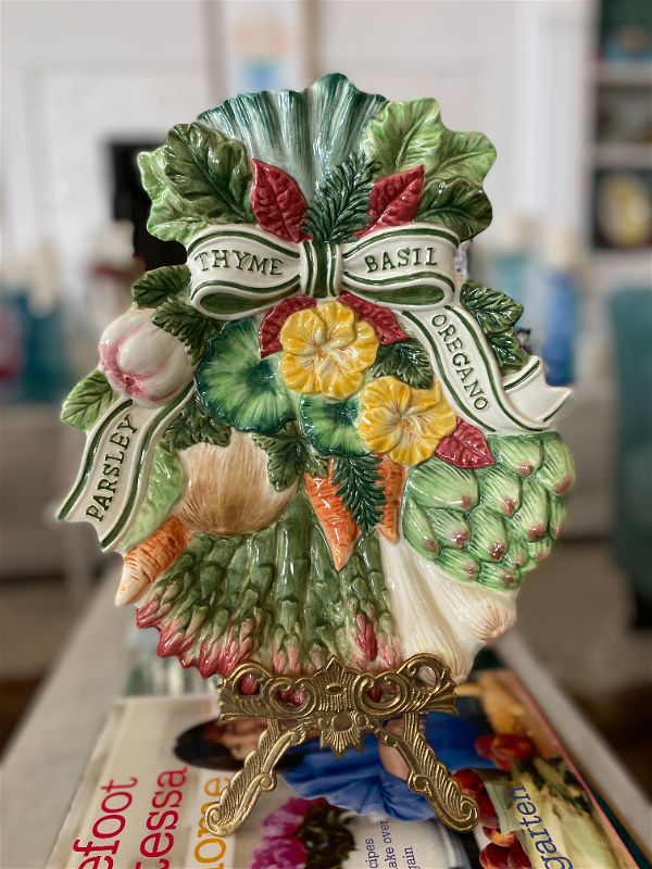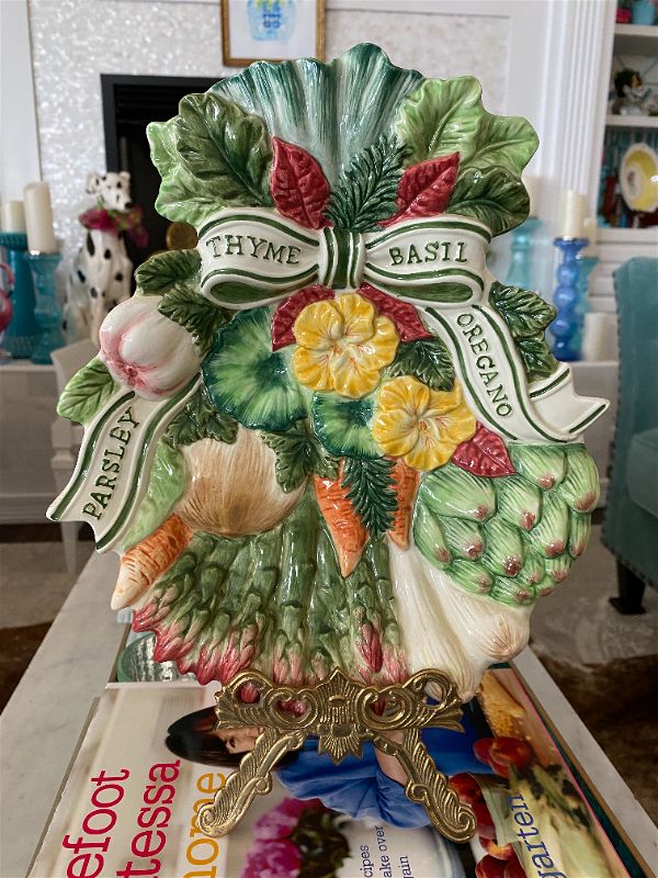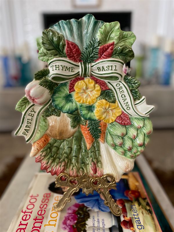 If you love vintage Fitz & Floyd you’ll love this plate. Detailed porcelain with fruits and vegetables. Featuring herbs basil, thyme, parsley and basil. There’s a place to add a wire for hanging. Place it on a stand for display as well.
