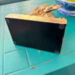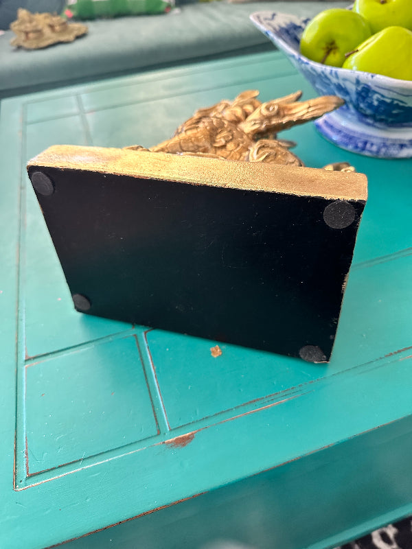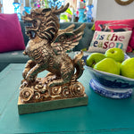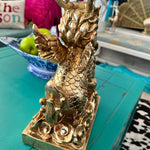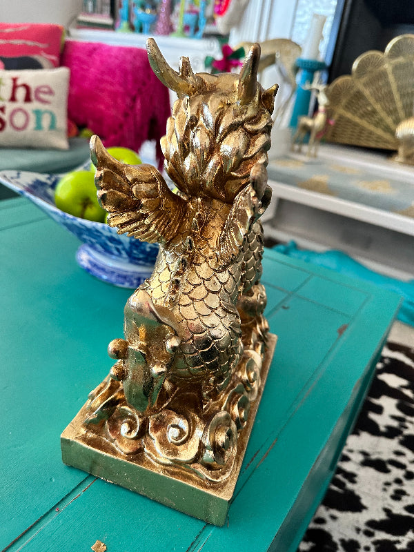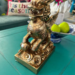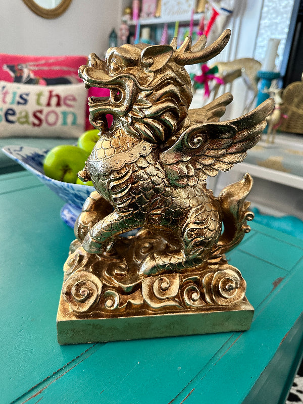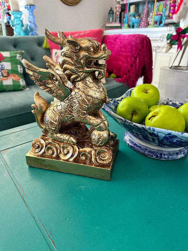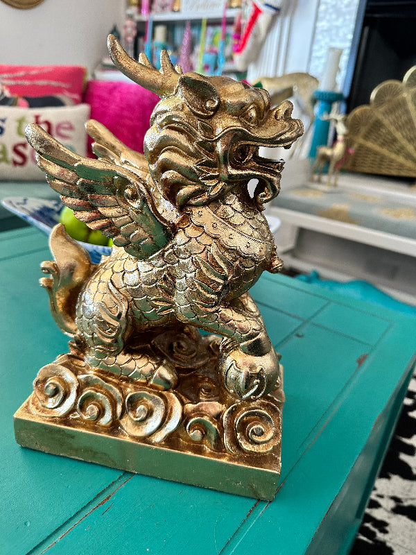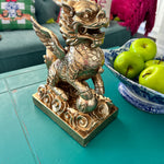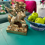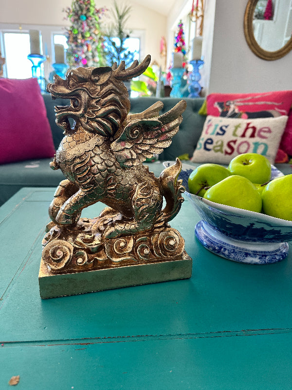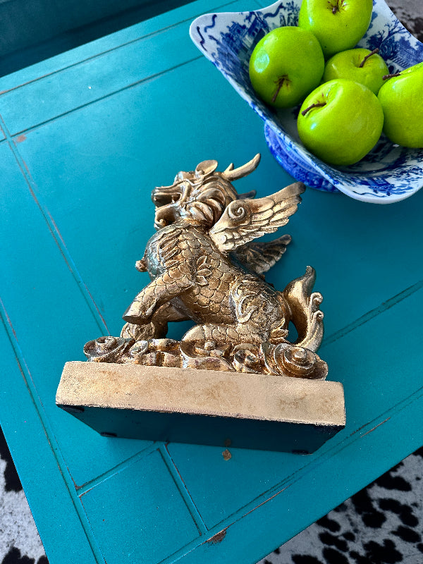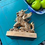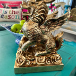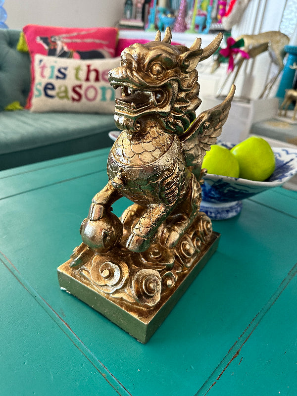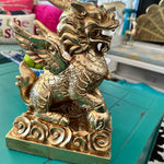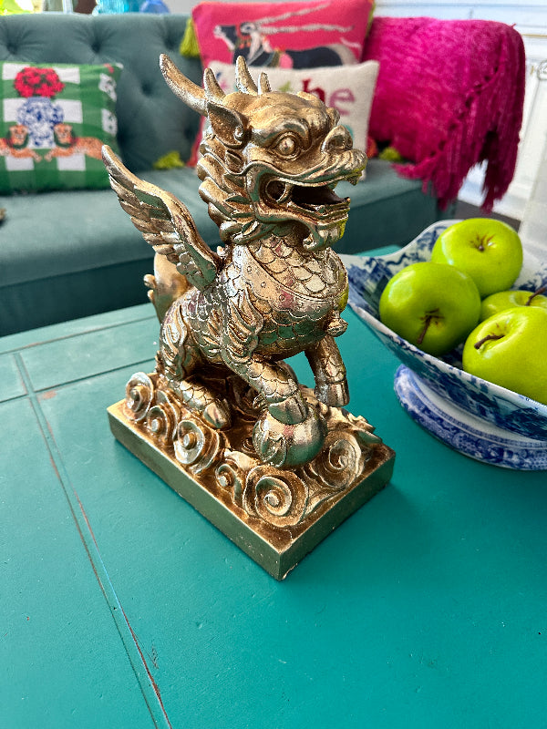 This Foo has wings! It's all in the details with this beauty. I love the swirls on the base, the scales and necklace around its neck and he has deer horns and wings. There is a ball under the right foot and it has a nice rectangular base. Shiny and perfect for a bookend, table vignette or shelf. Add it to your foo dog collection! Great condition. This is a newer piece.