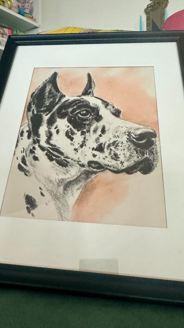 Showcasing the elegance and strength of one of the world’s most iconic breeds, this framed Great Dane print by celebrated animal artist Diana Thorne, dated 1944, is a timeless piece of vintage canine art. Thorne’s signature attention to detail and expressive style beautifully captures the noble presence and graceful stature of the Great Dane. Professionally framed and ready to display, this print makes a distinguished addition to traditional interiors, offices, libraries, or any dog lover’s collection. A wonderful piece for collectors of vintage prints and classic animal illustrations.
