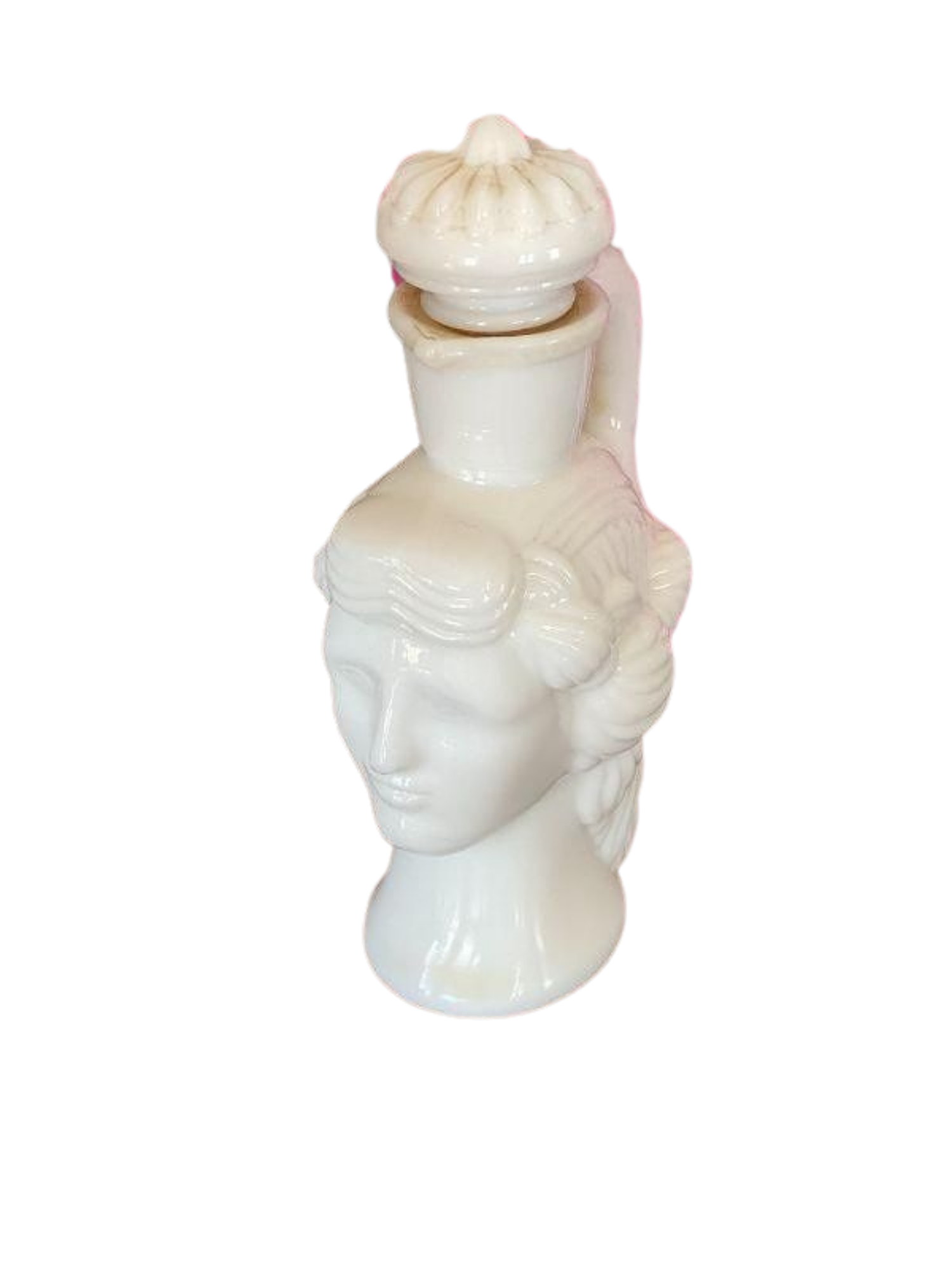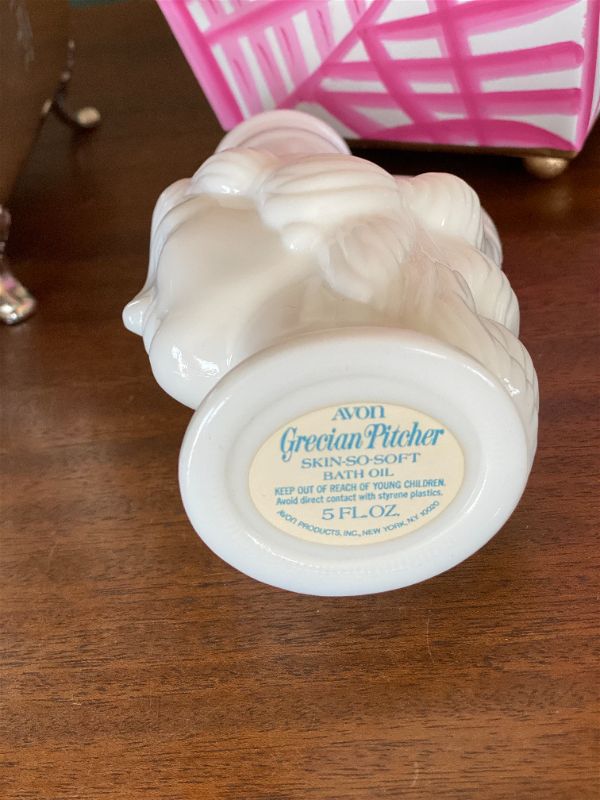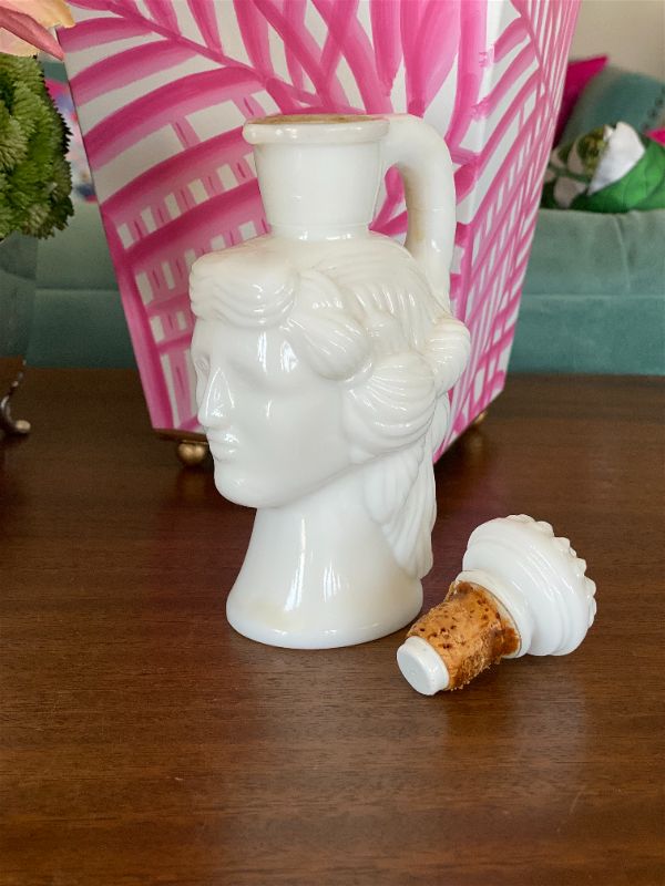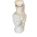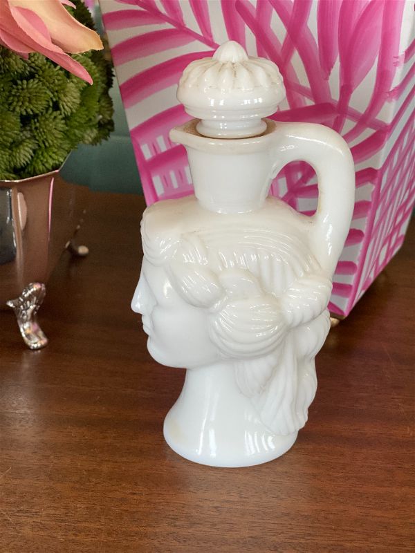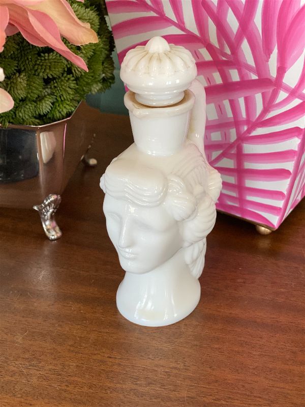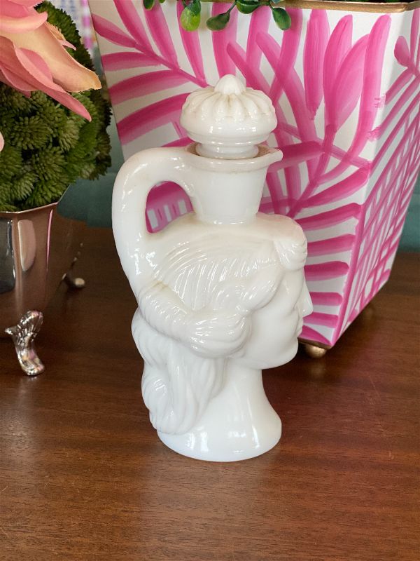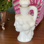 This is a rare and collectible Avon Milk glass lady perfume bottle. Originally for Skin so Soft. Grecian ladyhead. A wonderful collectible to display on a vanity tray. Put in your favorite bath oil or perfume. See picture details as they are part of the description.