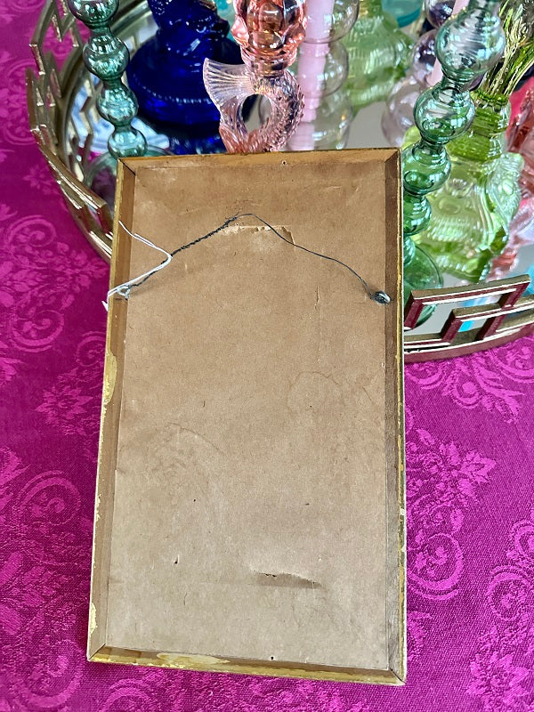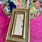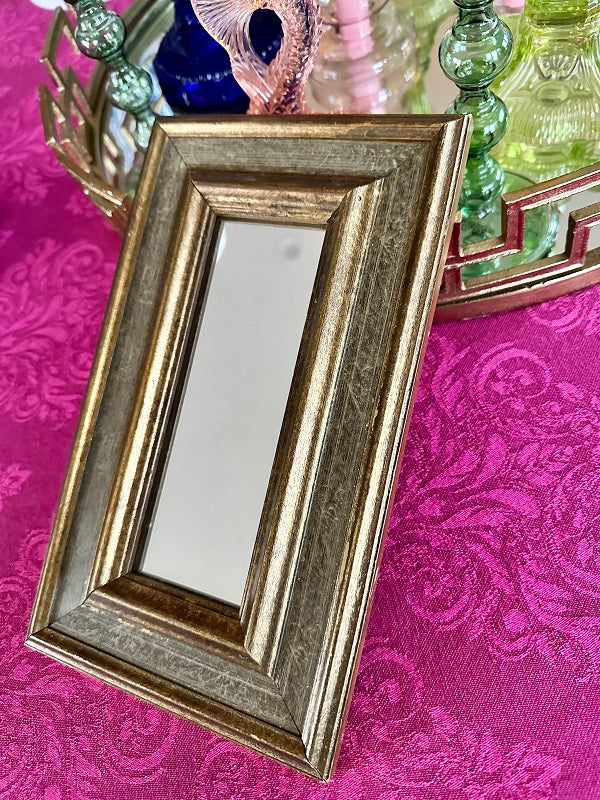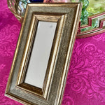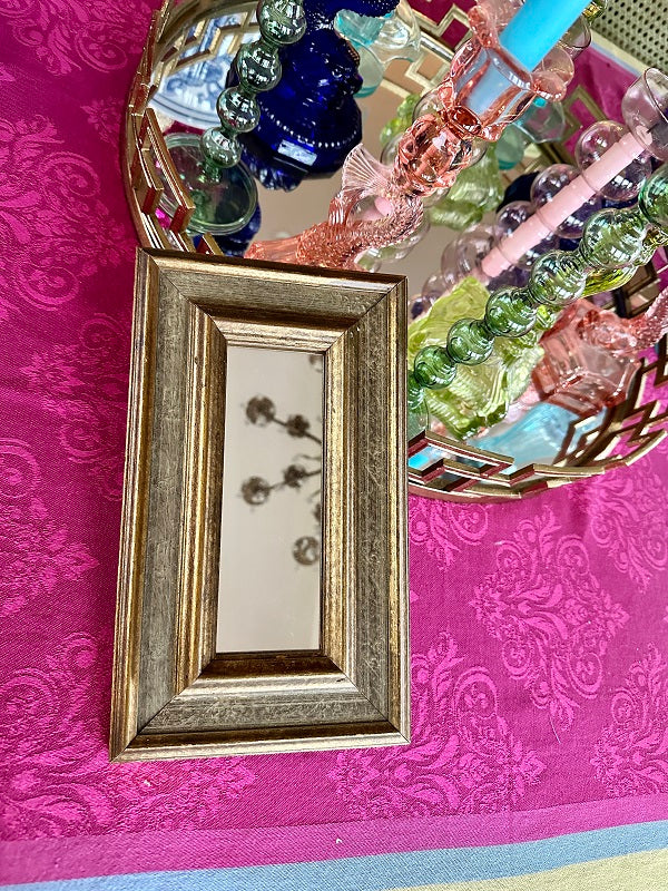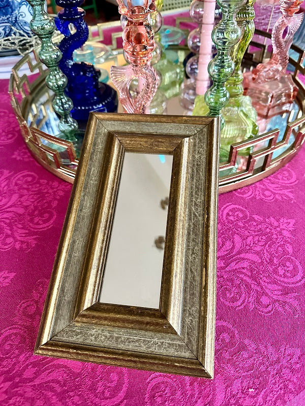 This lovely wooden mirror has a gray and gold tone to it. A nice smaller size makes it perfect for a gallery wall or smaller space. There is wire attached ready for hanging. Grouping small mirrors on a wall can make a grand statement, too. Great vintage condition.