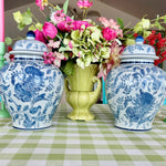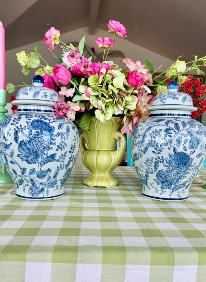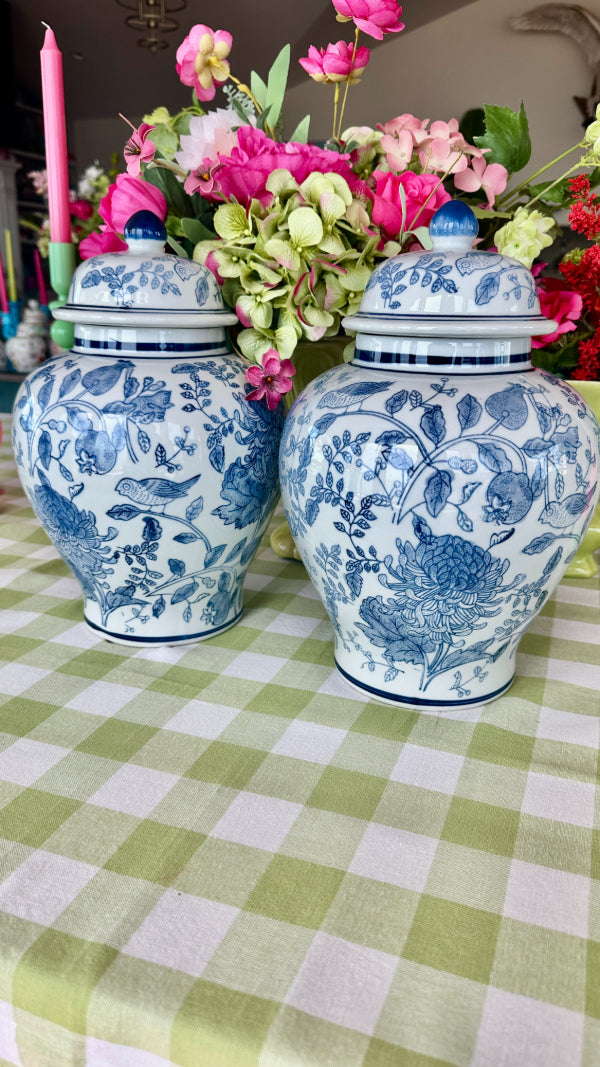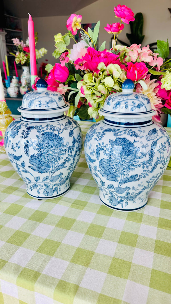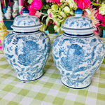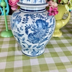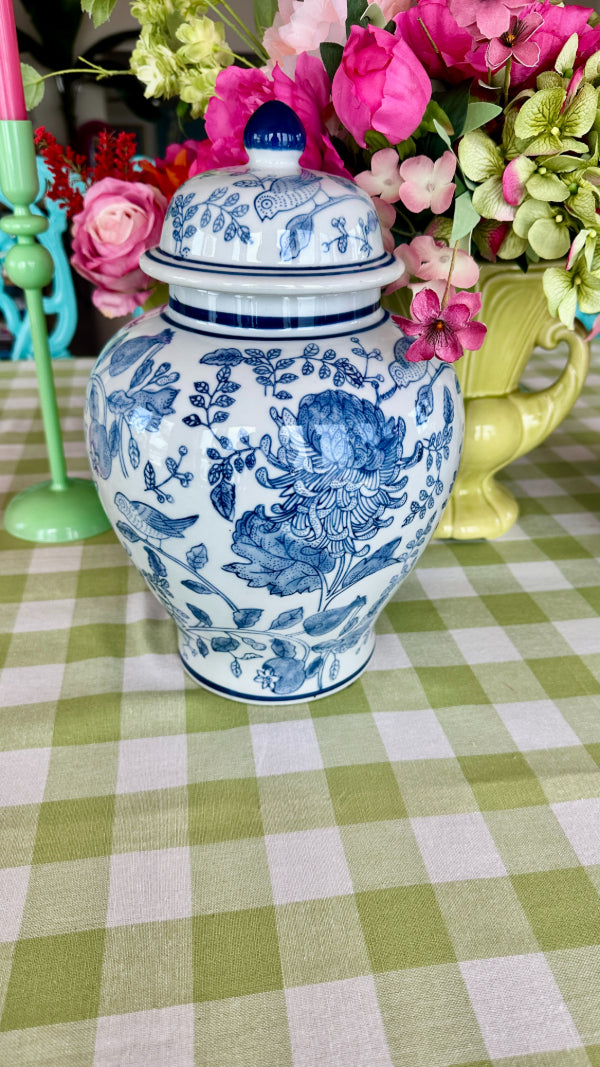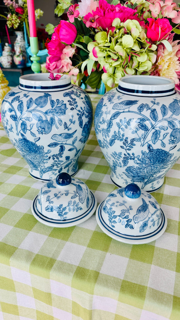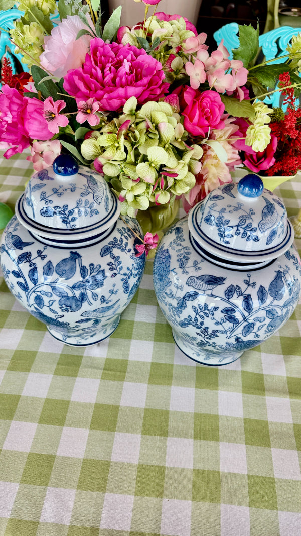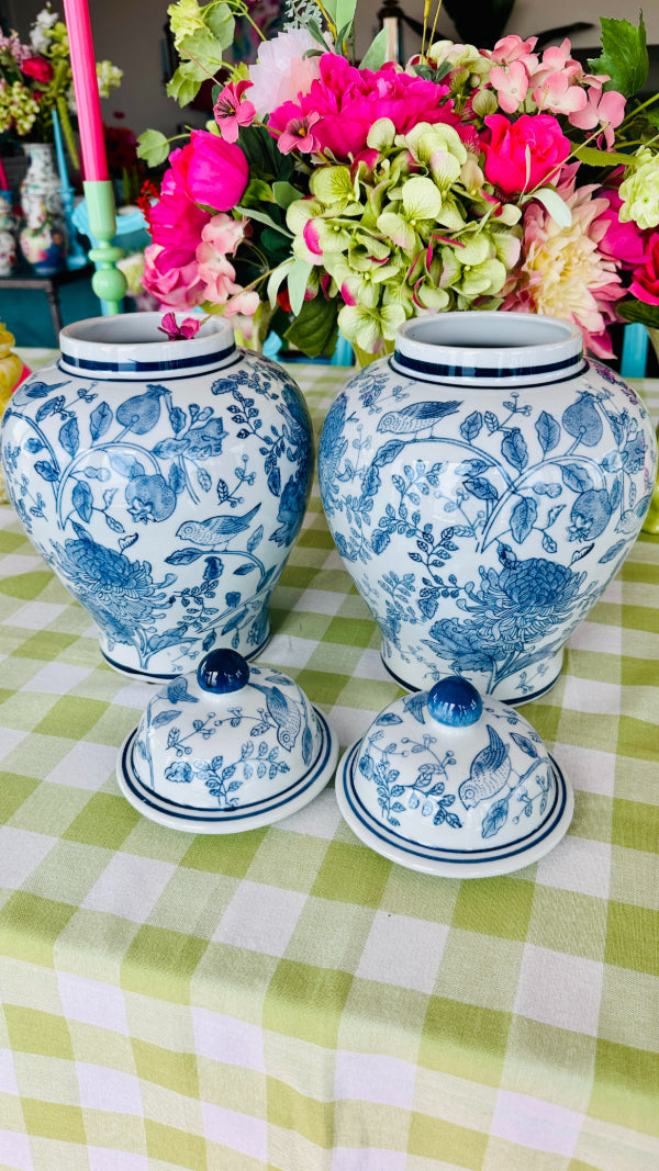 Add elegance and charm to your space with this Blue and White Ginger Jar, featuring a beautifully detailed bird and floral design. The classic blue-and-white porcelain contrasts perfectly with the motifs of birds amidst blooming flowers, creating a serene and timeless aesthetic. Each jar is sold separately, allowing you to collect and display them individually or in a coordinated set. Perfect for enhancing any room with a touch of traditional beauty.
