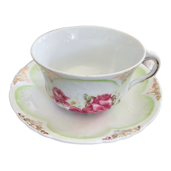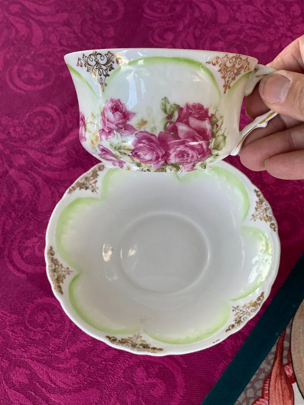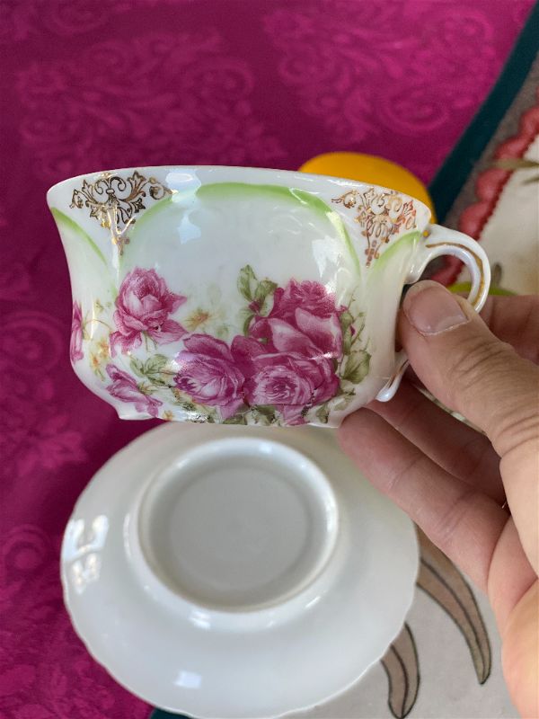 This beautiful bone china set most likely dates to late 1800s early 1900s, is a perfect piece to display, use or give as a gift. A bit of paint wear typical with age. Fade green scallop detail, gold trim and enhancement with bright pink roses. No markings on bottom.