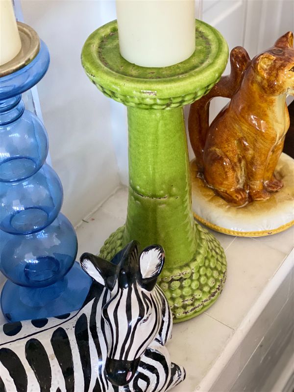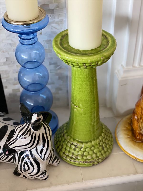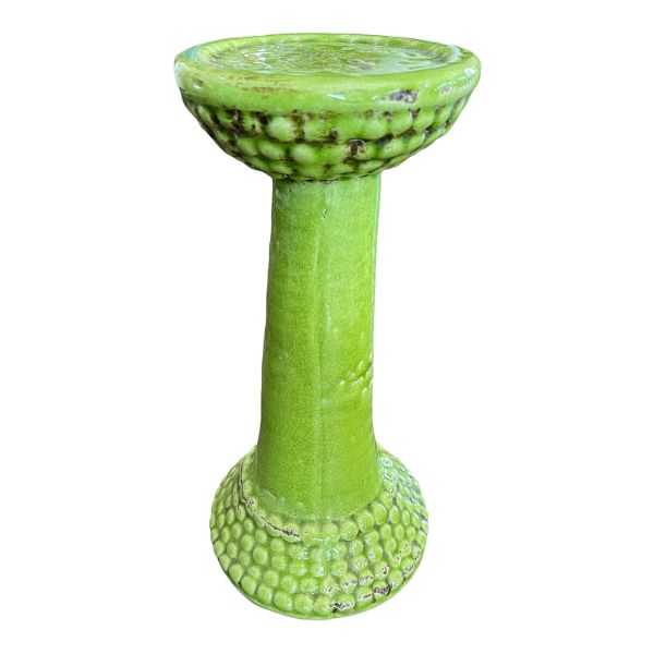 This piece is textured, beaded with a lime green glaze. There's an area where the glaze didn't seem to cover properly but doesn't take away from form or function. Perfect for a pop of color! See pictures as they are part of the description.