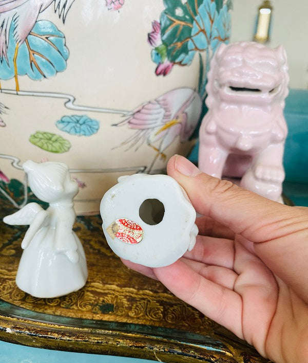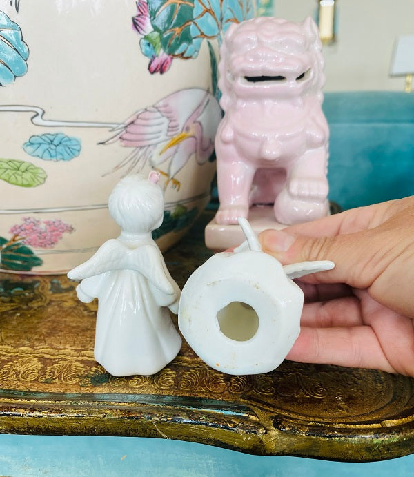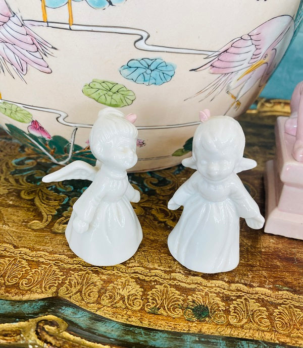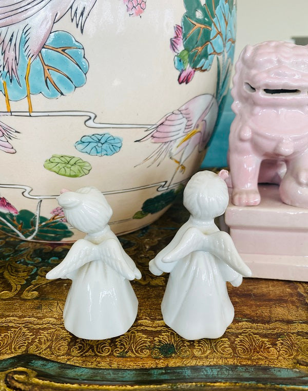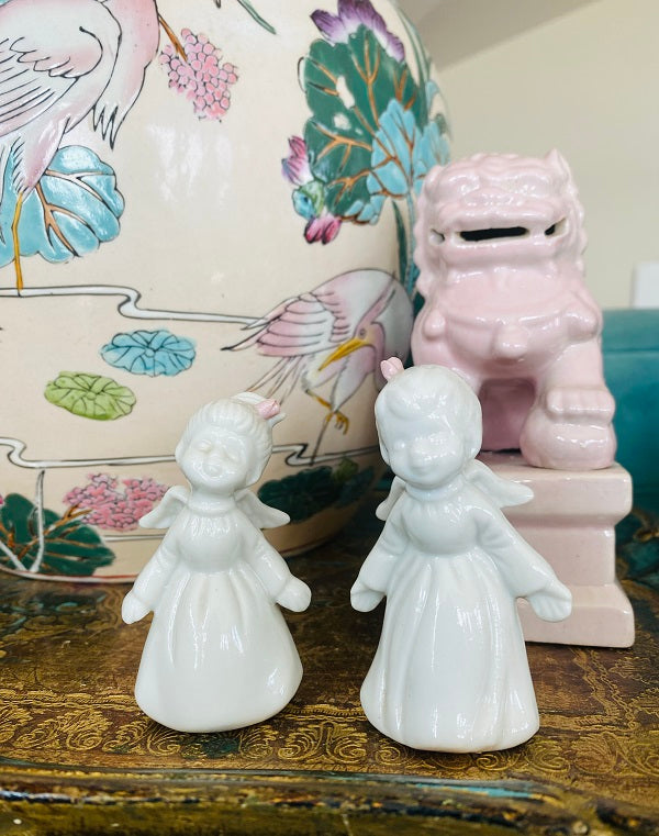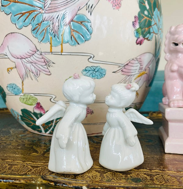 Collecting vintage, porcelain angels has always been a hobby for me since I was a child. Enesco always made some of the best ones. These sweet boy and girl angel with a pink rose accent in their hair are a great addition to your collection. Place them on your mantle with other collected angels, use them in a holiday vignette, or gift them to a friend or family member. There is a sticker still in tact on the bottom. In great vintage condition.