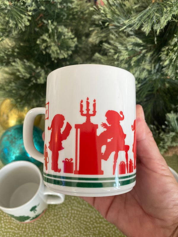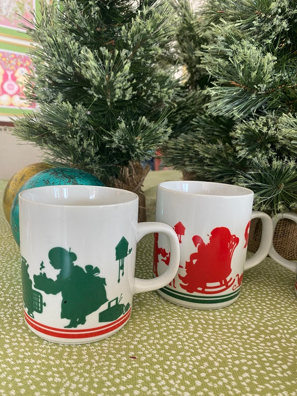 So these Vintage Avon mugs remind me of my childhood. The red and green silhouettes with Mr. and Mrs. Claus actually have a modern feel. These are fun for kids to use to make hot cocoa on a cold Winter day. They are in great condition and have Avon 1984 marked on the bottom. Add them to your morning coffee routine during the holiday season. See picture details as they are part of the description.
