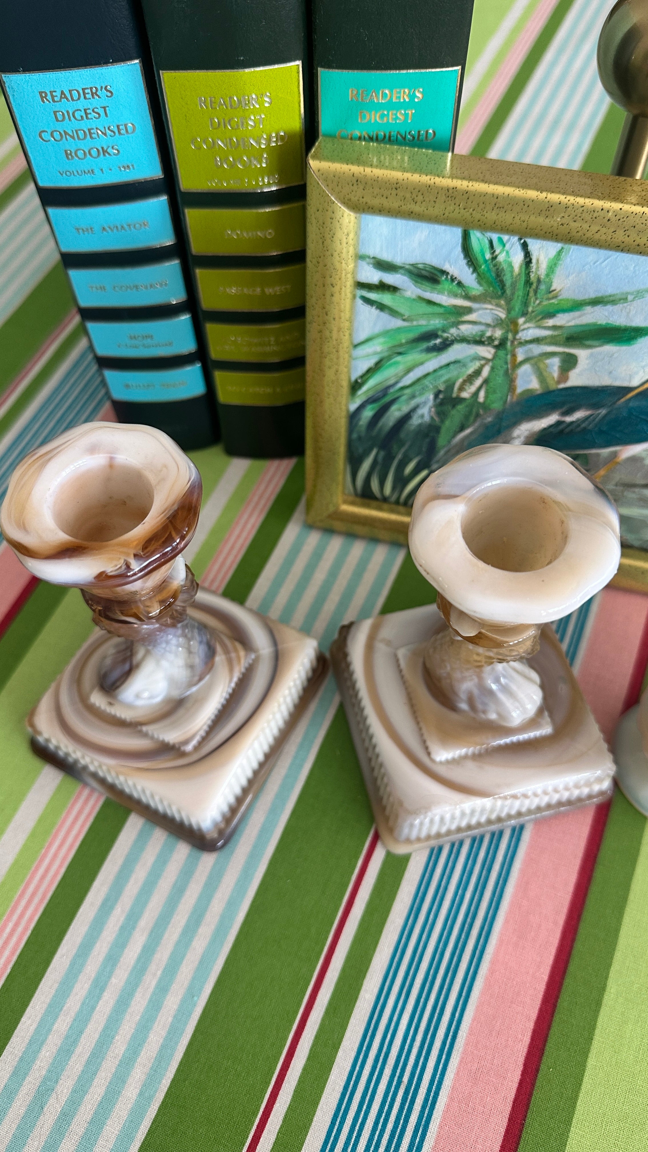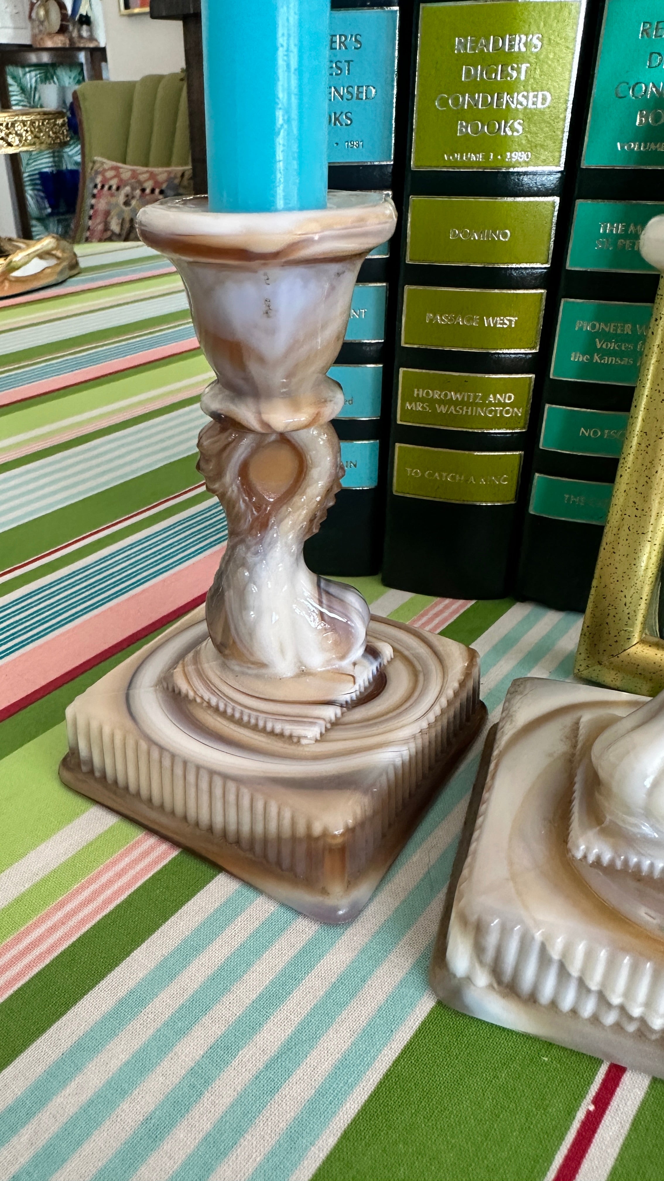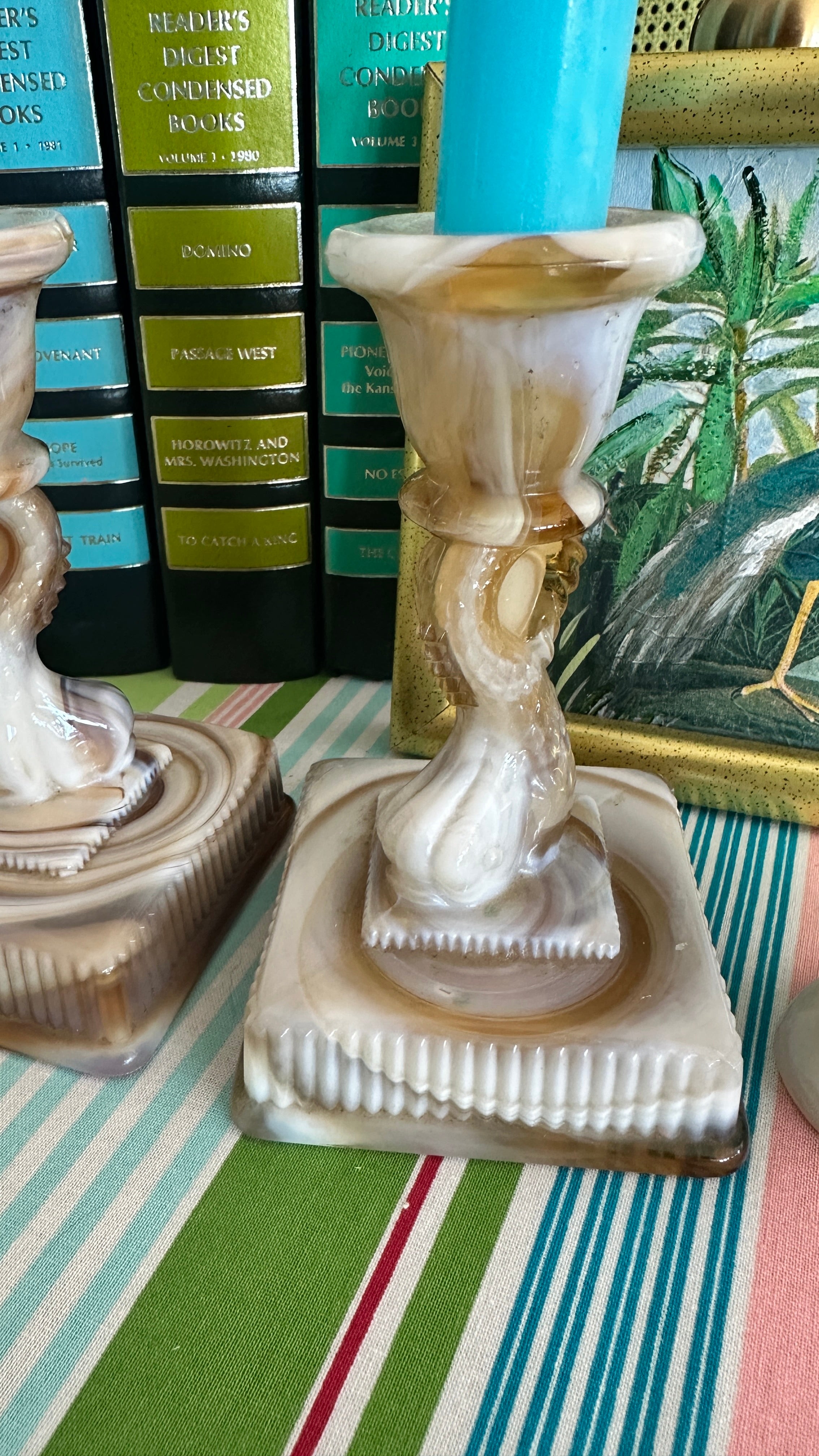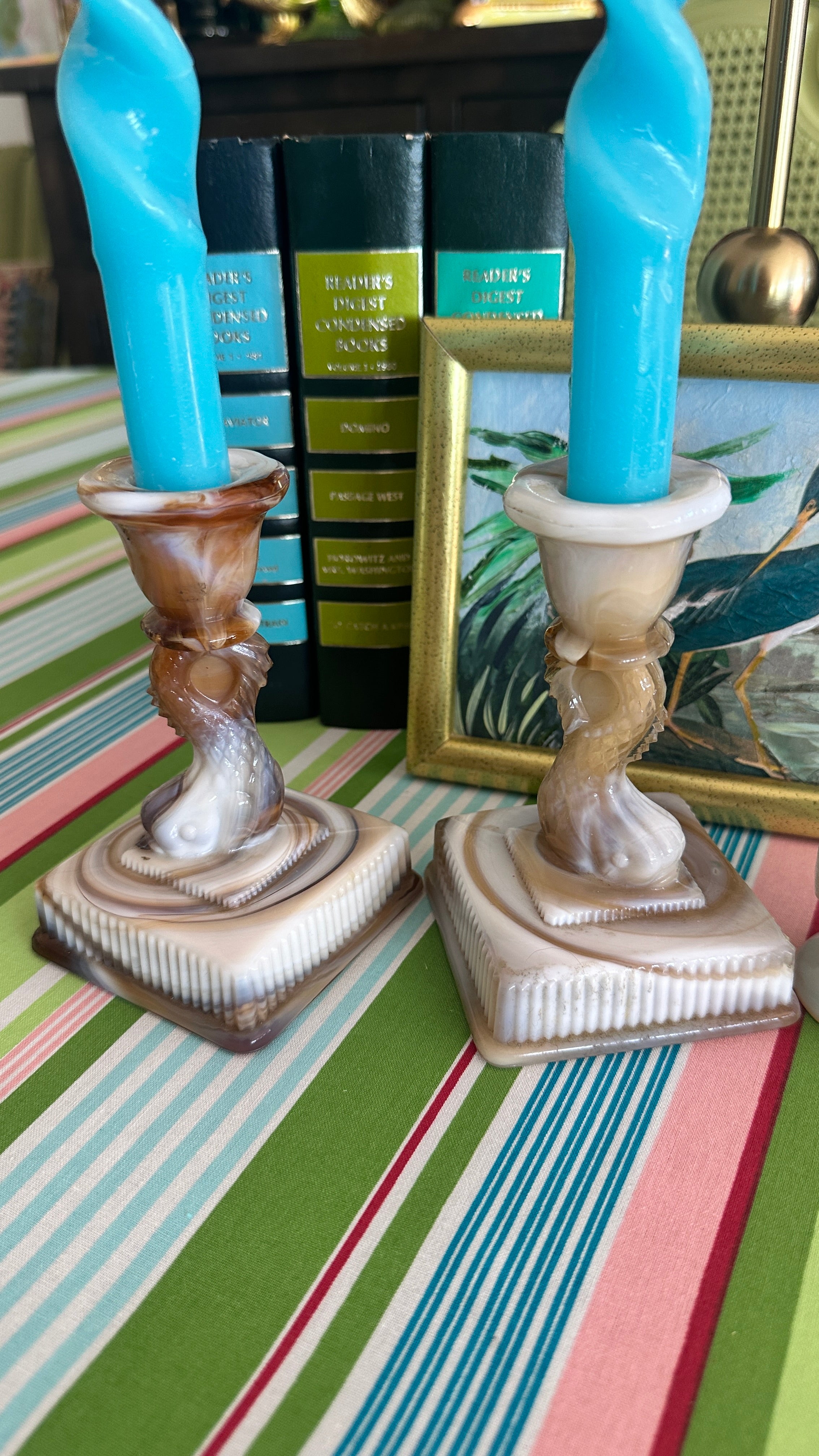 Love the look of Koi fish in your home decor? This rare slag glass pair of candle holders make the perfect addition to your home with an Asian flare. Brown and cream milk glass pattern are great for adding warmth to your home. Stamped on the bottom with the Imperial glass makers mark. Perfect condition no chips or cracks. Love the short style and beautiful detail. Add a colorful pair of candlesticks or go neutral with cream or white.