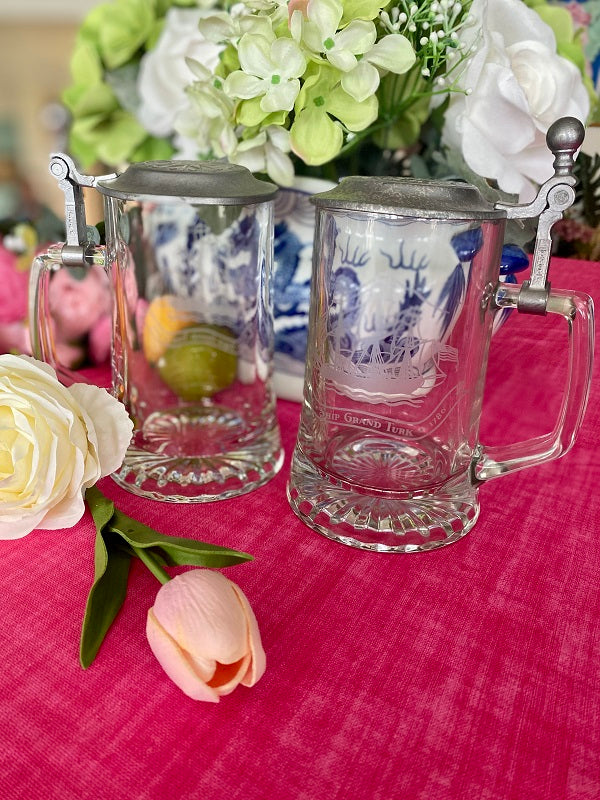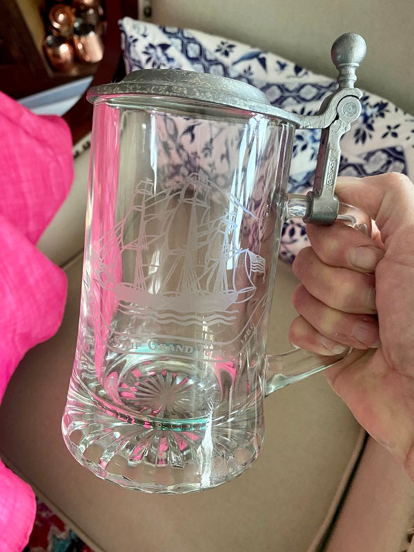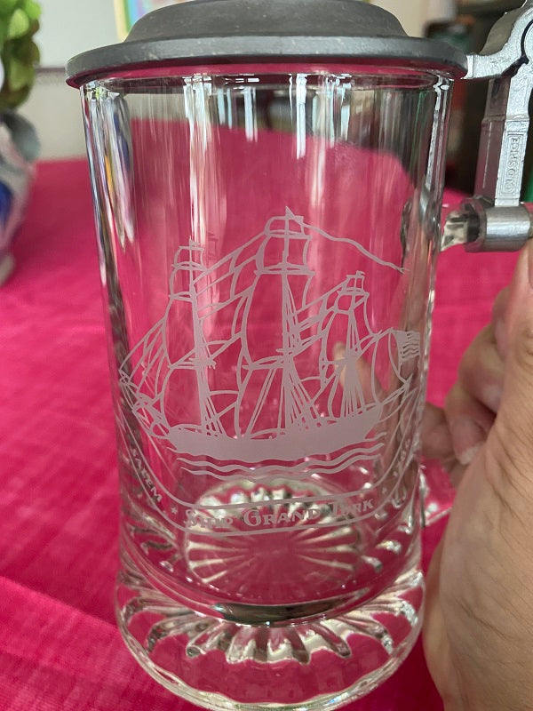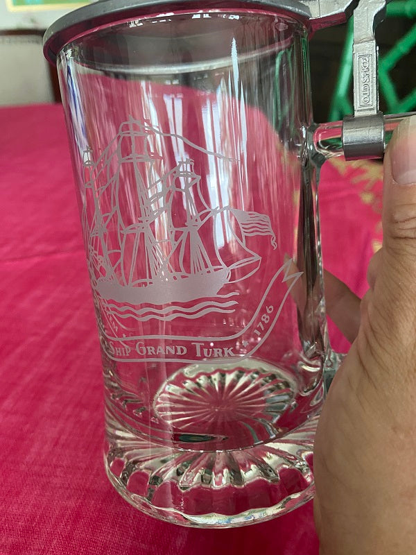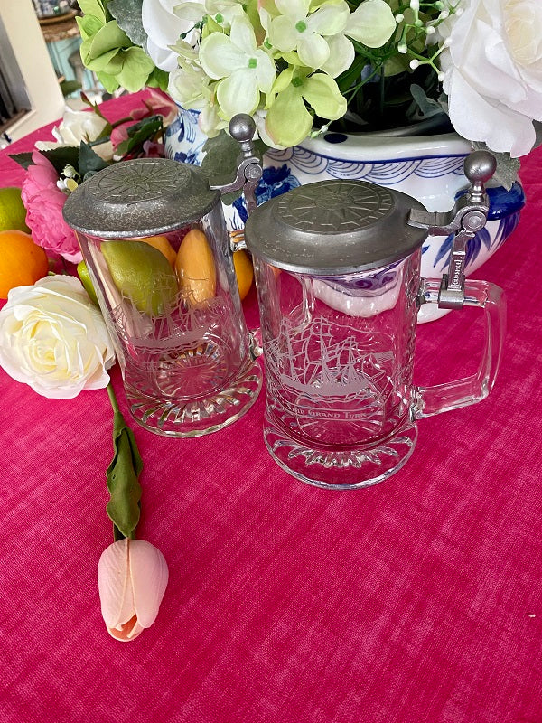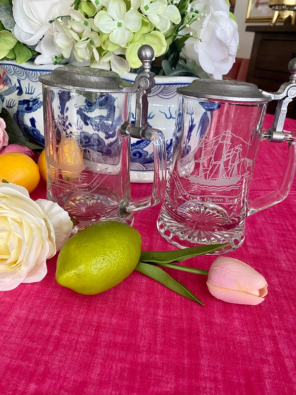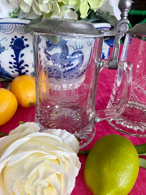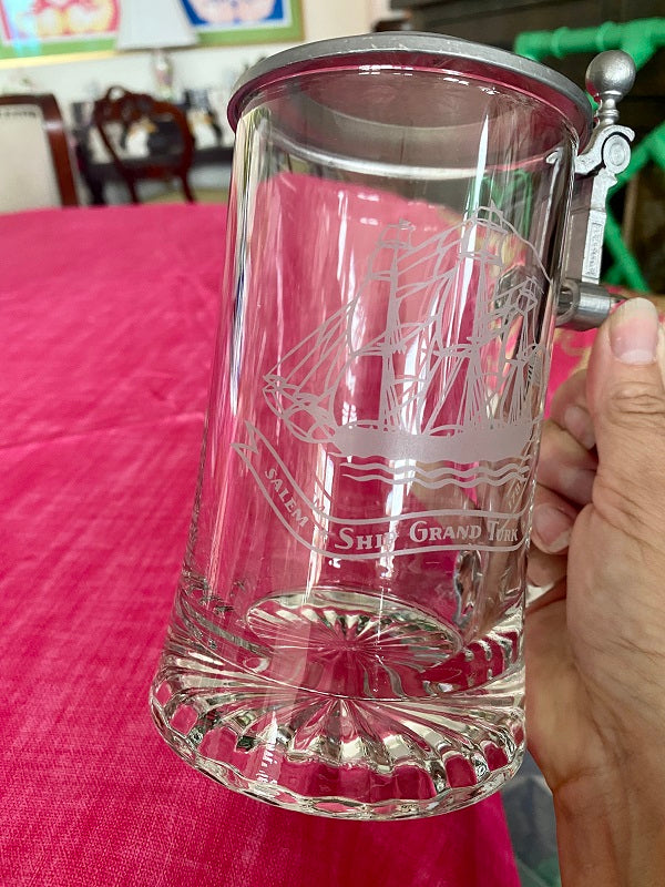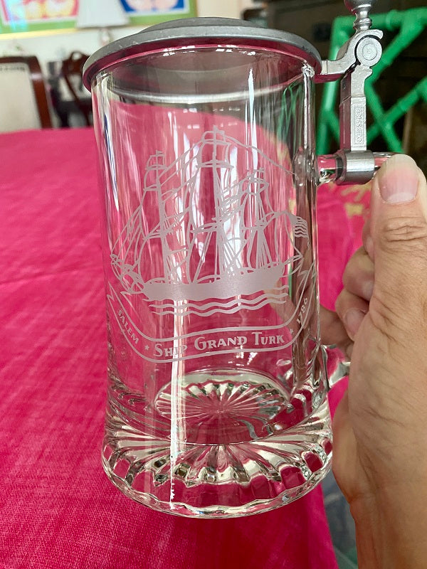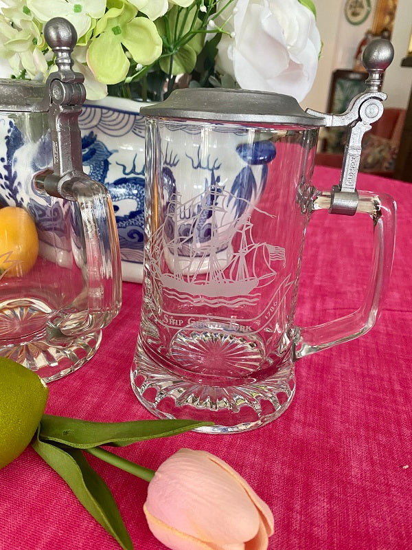 Etched Glass Pewter Steins Set of Salem Ship Grand Turk