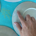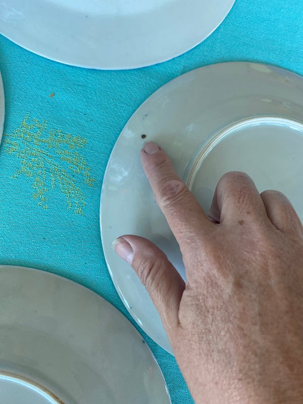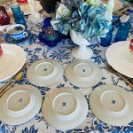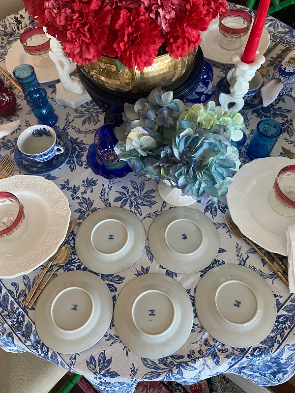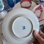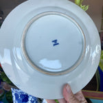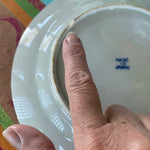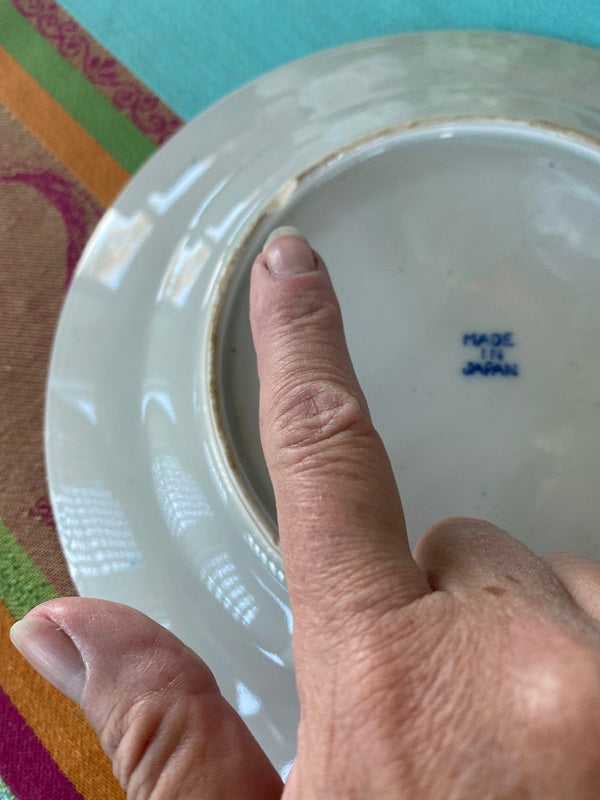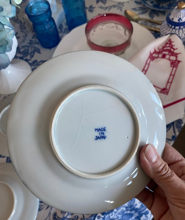 This lovely set of 5 dessert plates (1920s-1940s) are in the highly collectible Blue Willow pattern. Stamped "Made in Japan" on the bottom. Classic blue and white chinoiserie perfect to add to your china collection. Use them to serve your favorite sweets or display then in your china cabinet. One plate has a tiny chip on the back and there is a flea bite on the back of another one, otherwise no chips or cracks and in great vintage condition.