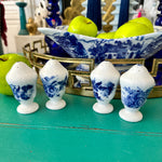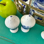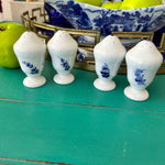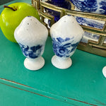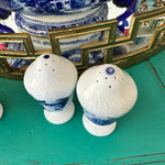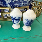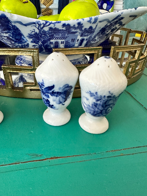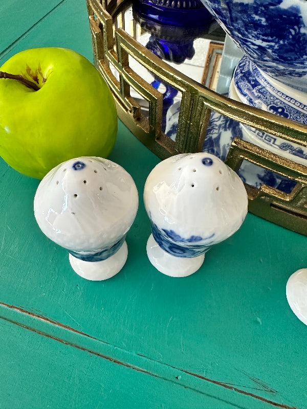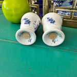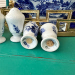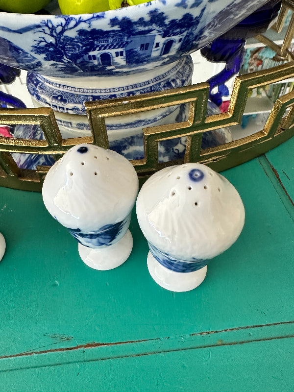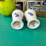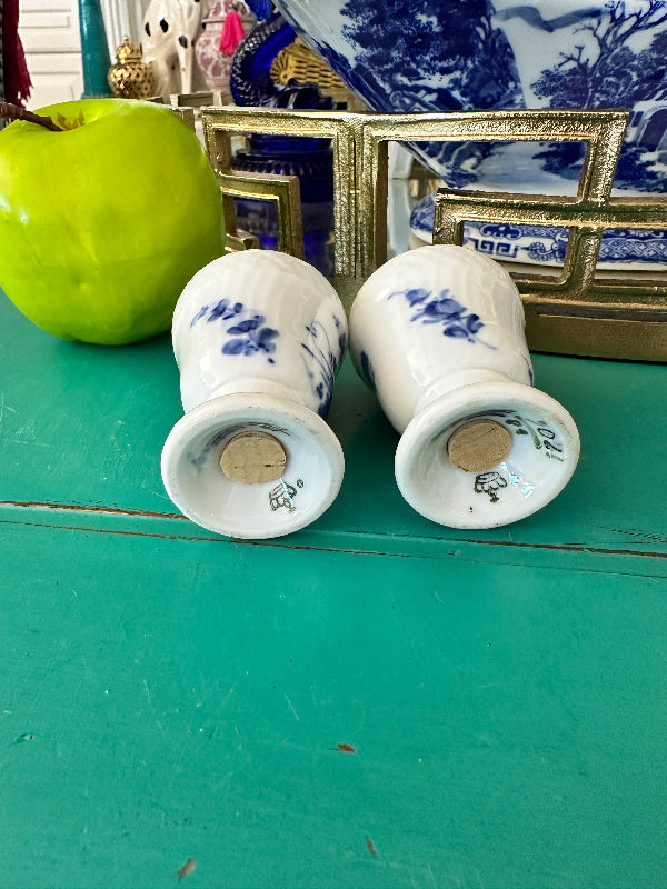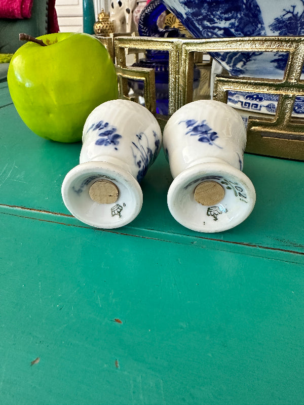 Add these antique blue and white salt and pepper shakers to your table for a chinoiserie accent. They are a beautiful curved shape that feel great in your hand. Painted blue floral design. Stamped and makers mark on the bottom. Each set has new corks added for stoppers. They are great to dress up your dining table or use everyday. Great vintage condition.