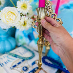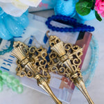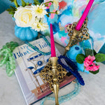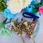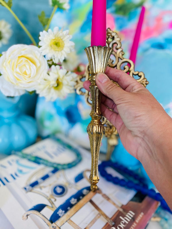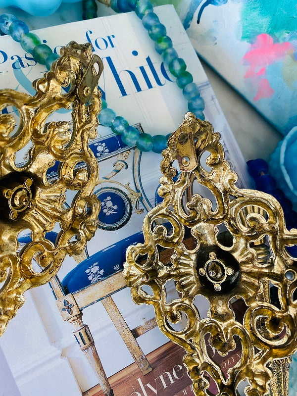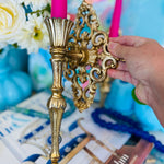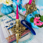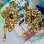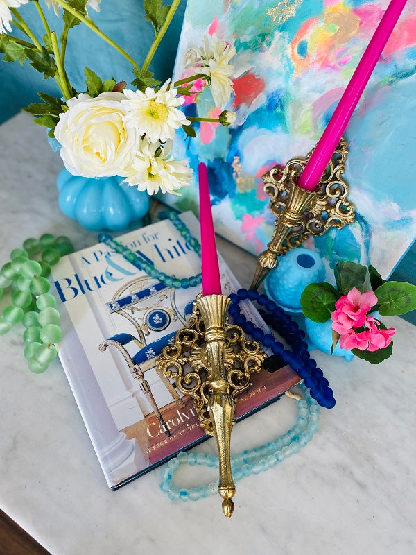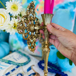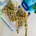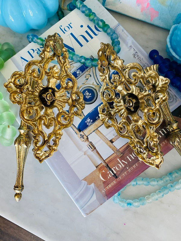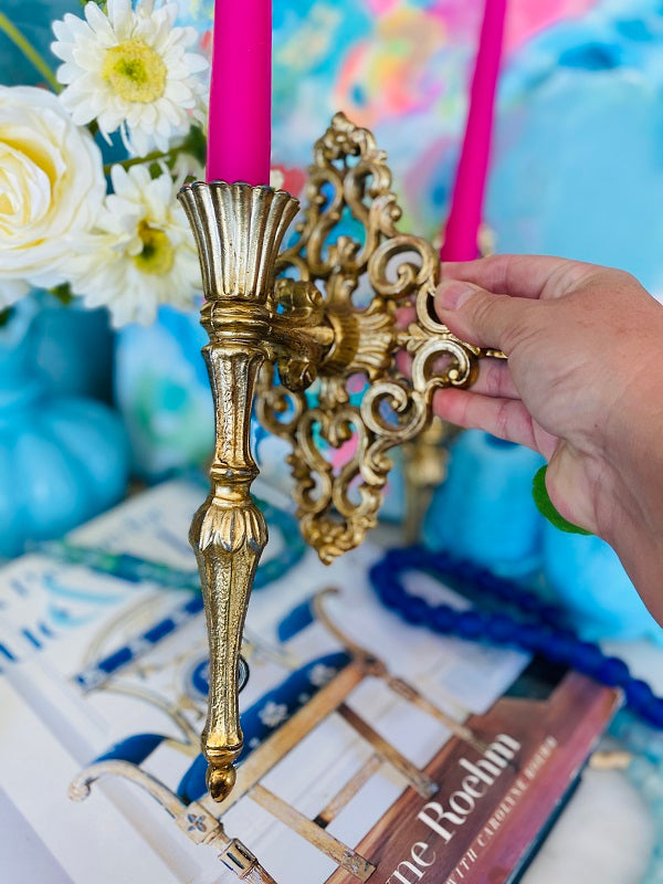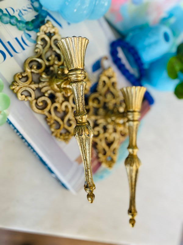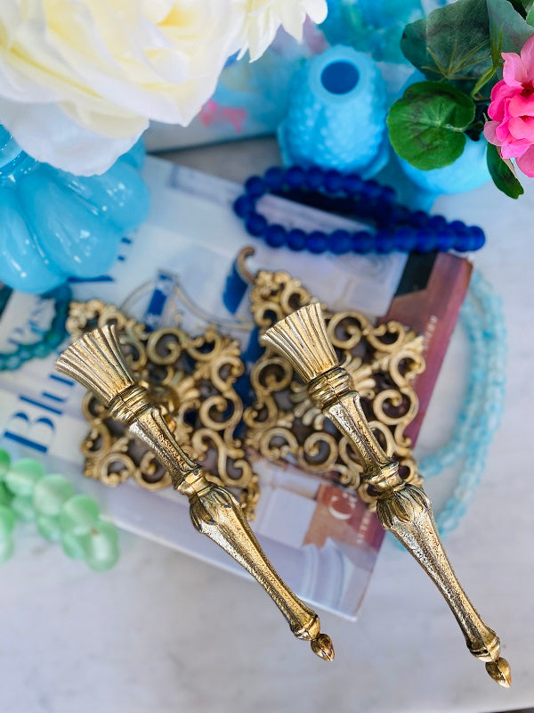 The amazing shape of these brass candle sconces make them the perfect statement piece. Elegant traditional meats Mid Century Modern. The scrollwork detail on the back plate mixes well with the sleek lines of the candle holders. Add these to either side of a great piece of art, a large mirror, or on either side of a larger piece of furniture. Mix them in with a vintage plate wall. Such a versatile pair.
