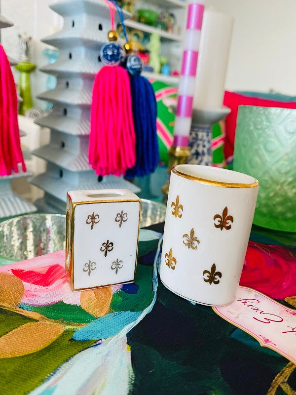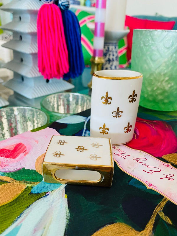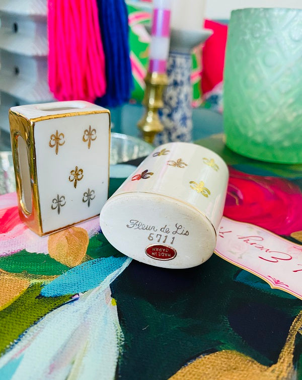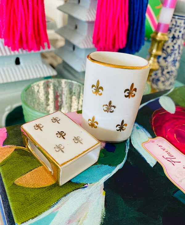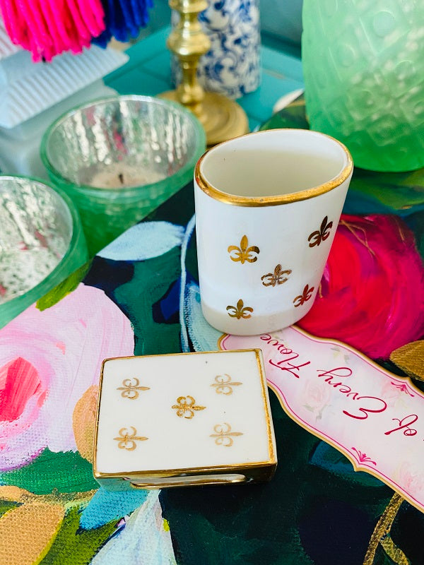 Vintage Fleur De Lis Porcelain Match Holder Set