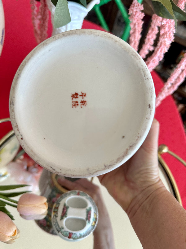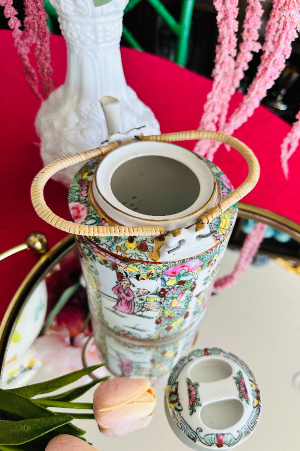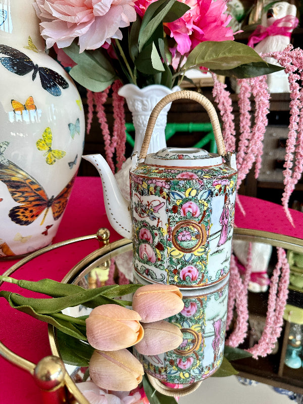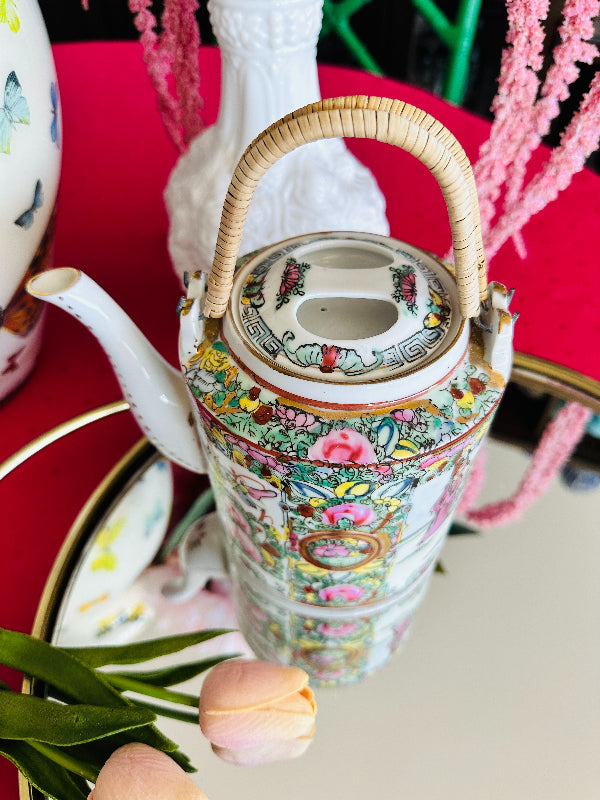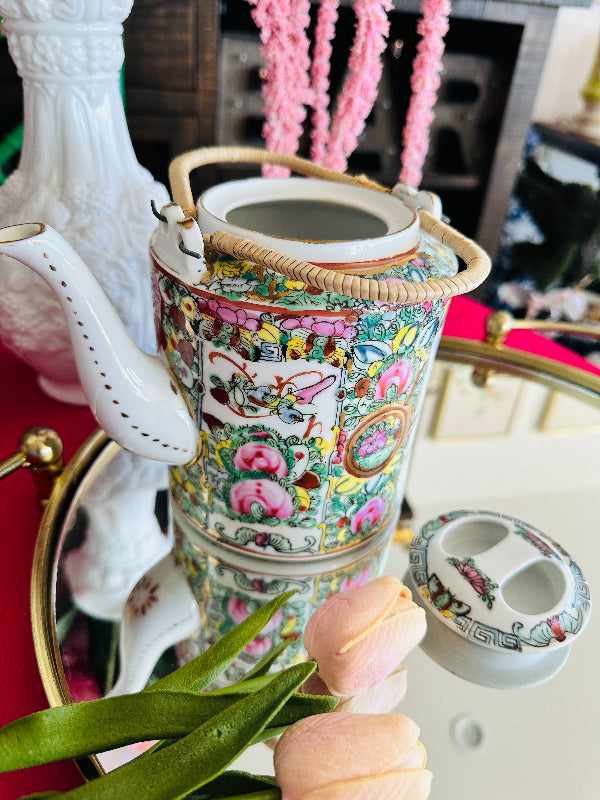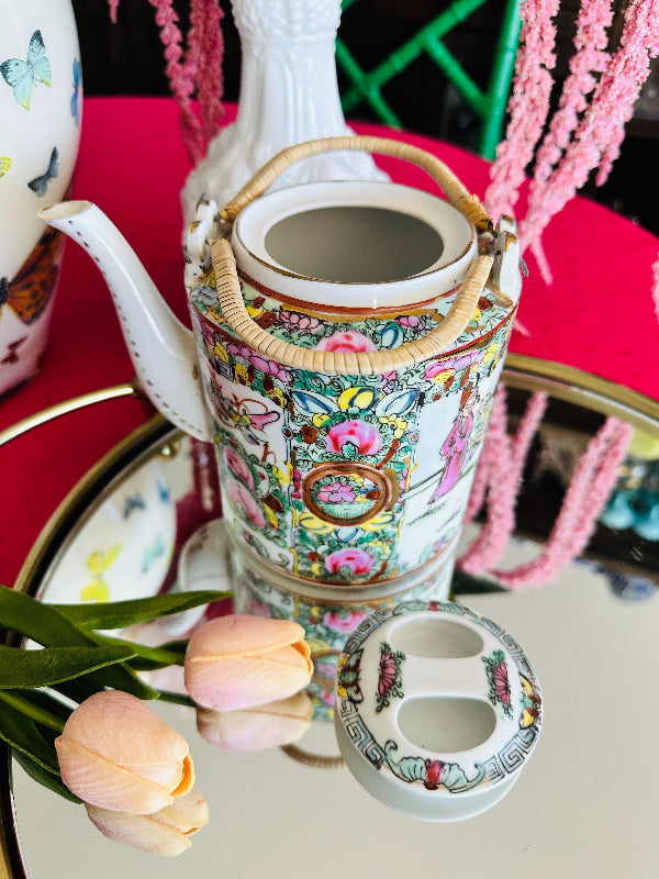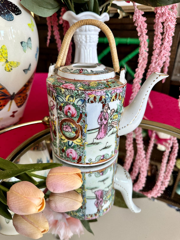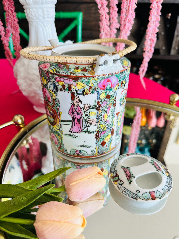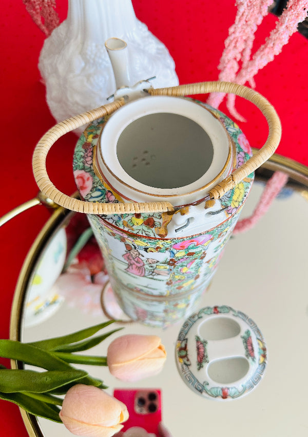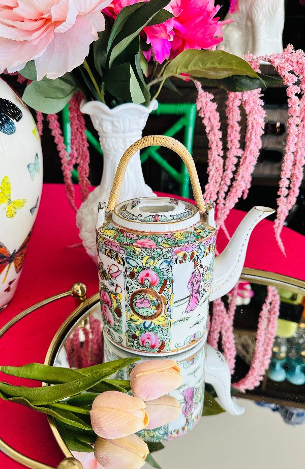 If you love collecting Rose Medallion china then you need this teapot. The colorful pattern boasts pinks and greens with pops of yellow and gold. Hand painted scenes of Asian life adorn the teapot. The handle is metal wrapped in bamboo. It comes with a lid. Delicate porcelain china, but sturdy enough to use as a flower vase or accent piece. Great vintage condition.