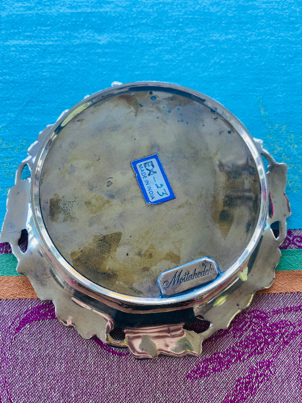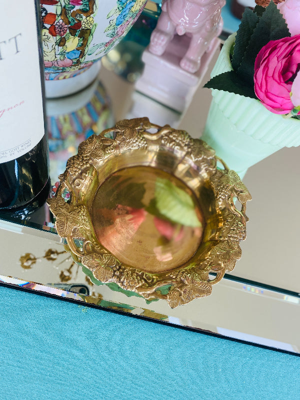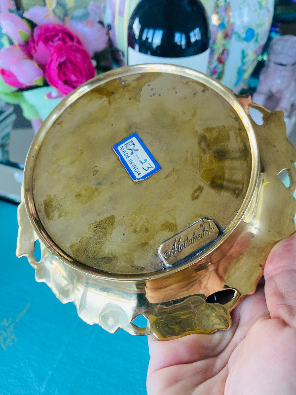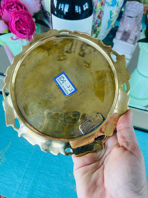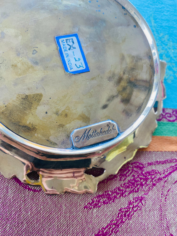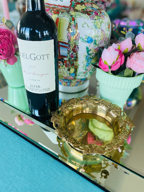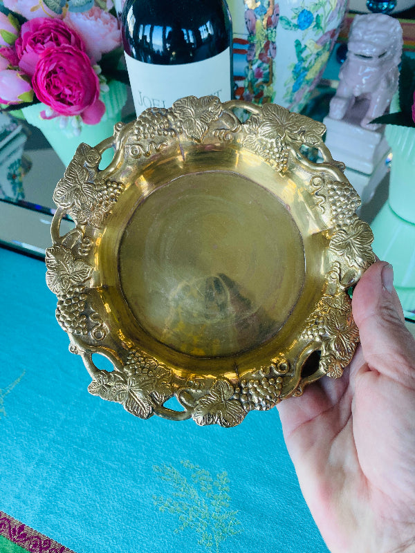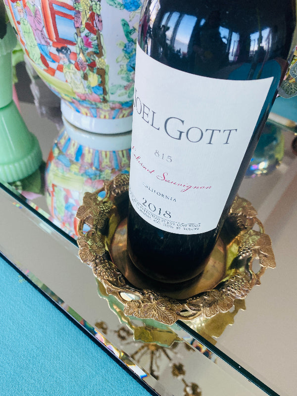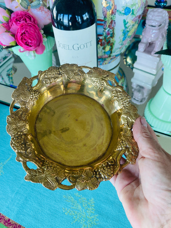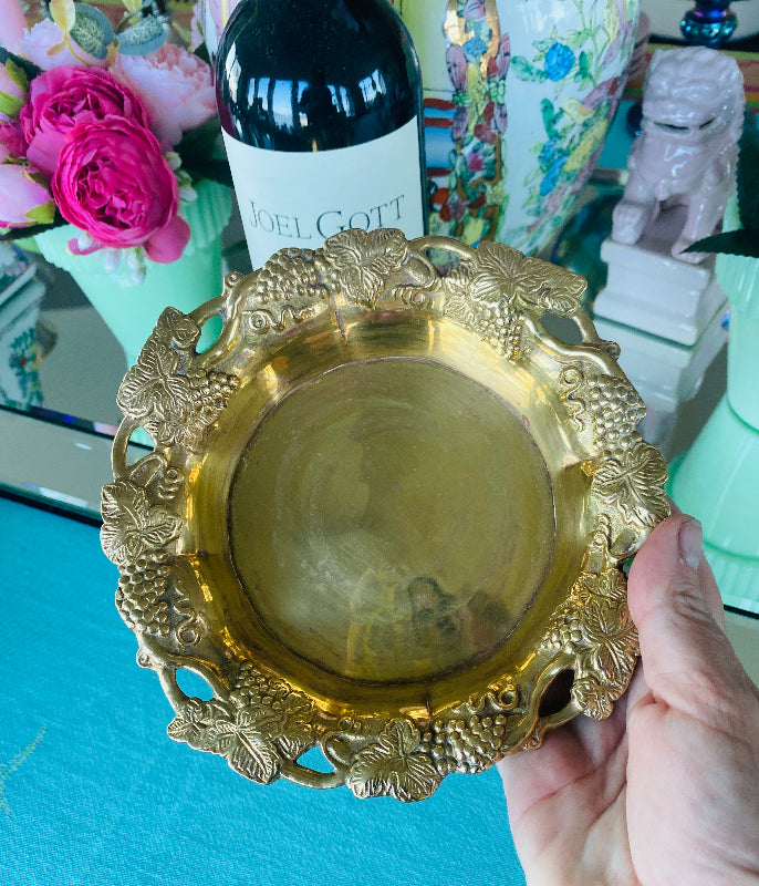 Display your Mottahedeh wine in style with this amazing wine coaster. Made of heavy brass with a beautiful raised grapevine pattern. Marked Mottahedeh on the bottom and in great vintage condition. Very light ring on the bottom but with extra polishing it will be gone.