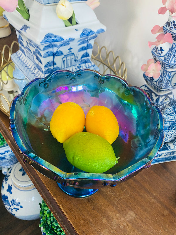 This is a lovely iridescent carnival glass that is highly collectible. A gorgeous scalloped edge with raised detail makes this a statement piece. The bold blue/green color looks like peacock feathers. Amazing vintage condition no chips or cracks.