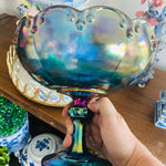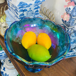 This is a lovely iridescent carnival glass that is highly collectible. A gorgeous scalloped edge with raised detail makes this a statement piece. The bold blue/green color looks like peacock feathers. Amazing vintage condition no chips or cracks.