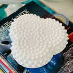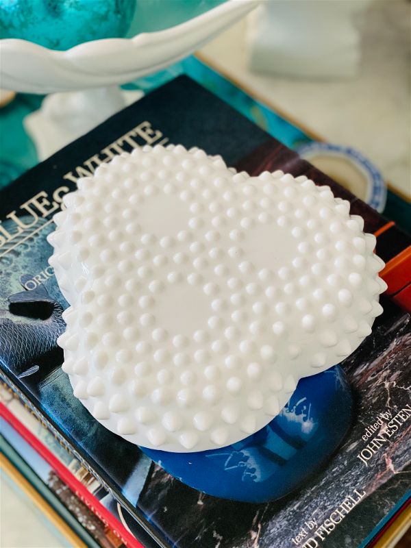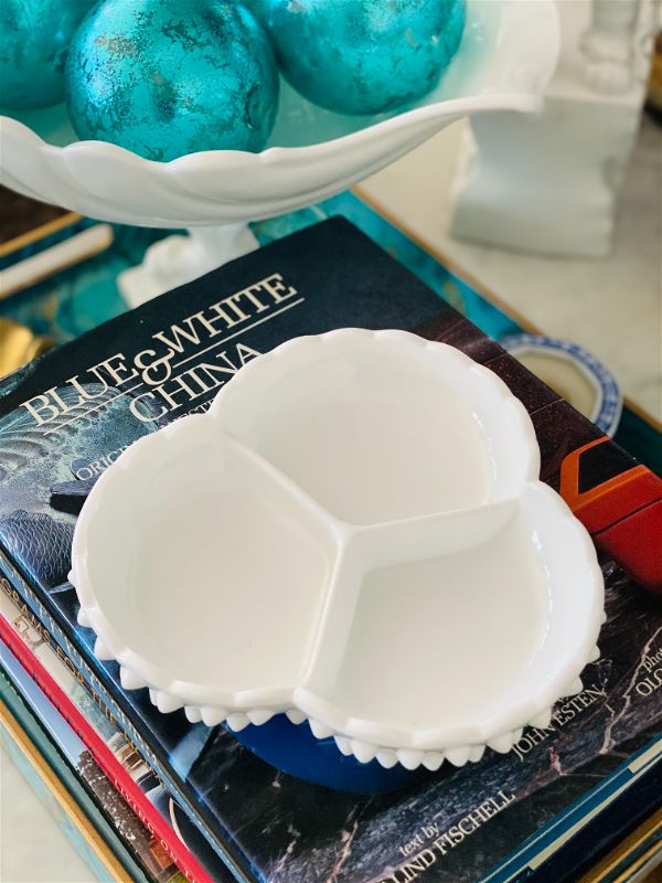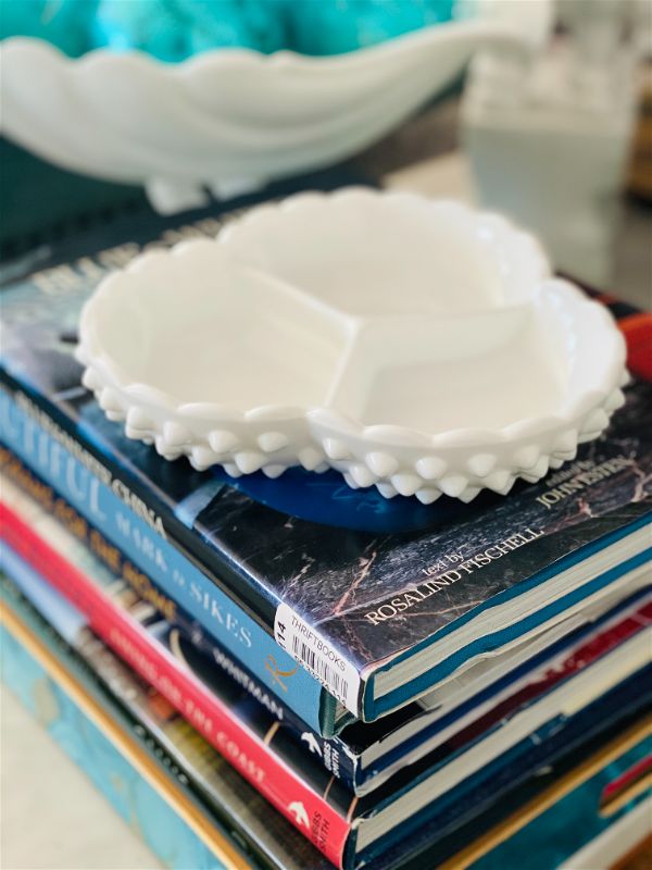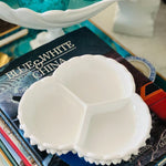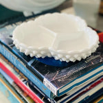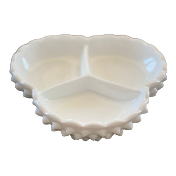 A gorgeous divided white milkglass hobnail dish perfect for loose change, jewelry, paperclips and desk supplies, separate dips for fruit or veggies.