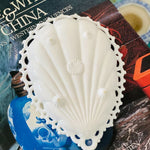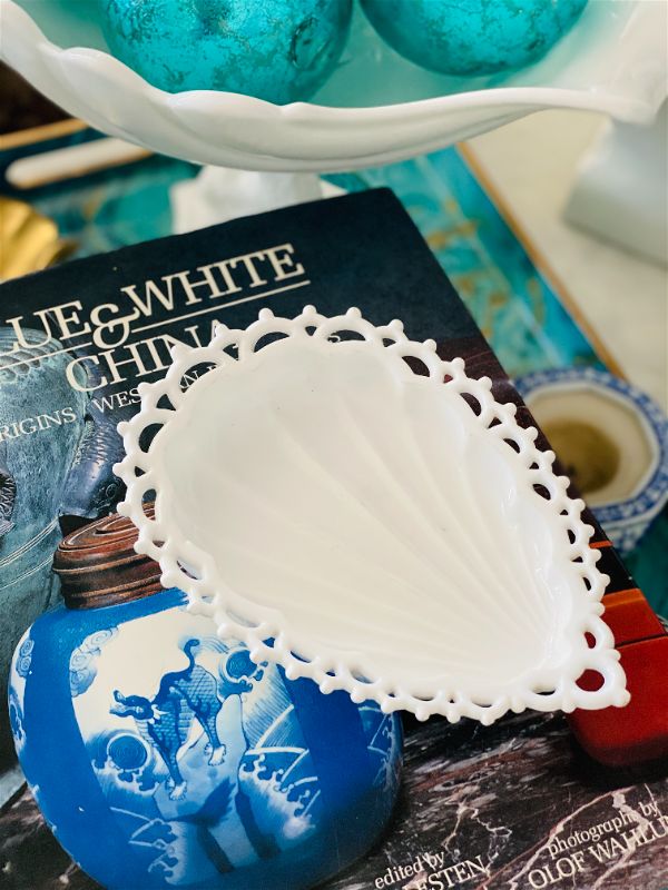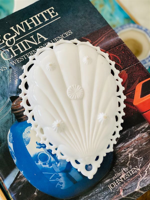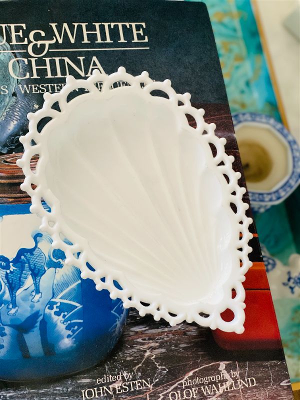 A lovely and feminine lace edged milk glass trinket dish ready for your vanity, night stand or office desk. Perfect for loose change, paperclips, jewelry. Teardrop shape. Great vintage condition no chips or cracks.
