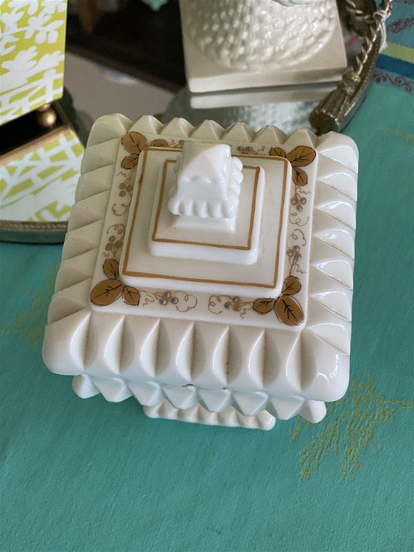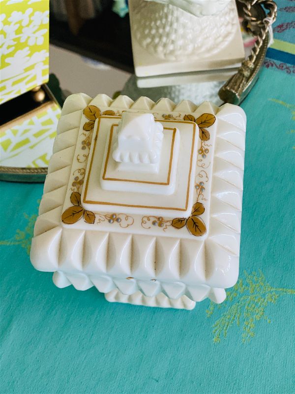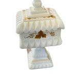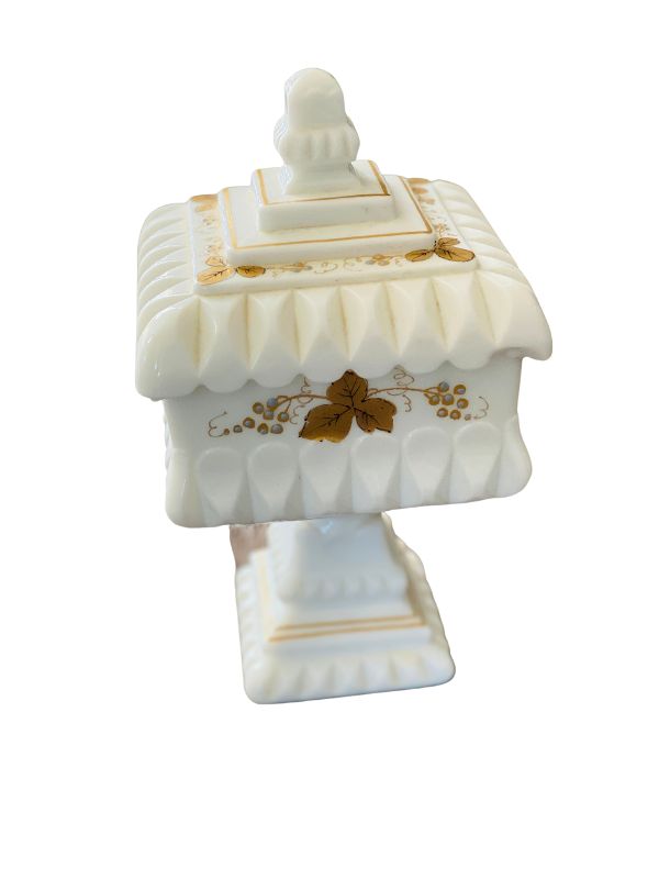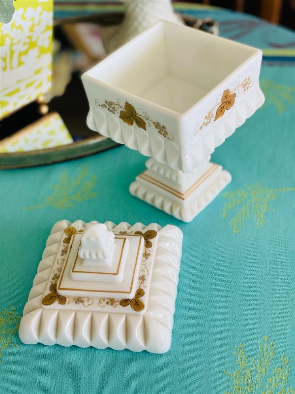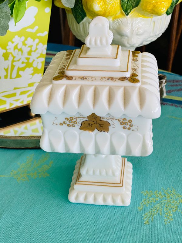 Discover vintage elegance with our Milk Glass Lidded Candy Dish, a true relic of the past. A lovely pewter leaf design adorns this gorgeous pedestal dish. This timeless piece features a captivating Wedding Cake design, making it a perfect addition to your collection of vintage decor. Explore its classic charm and add a touch of nostalgia to your home today.
