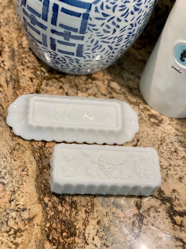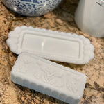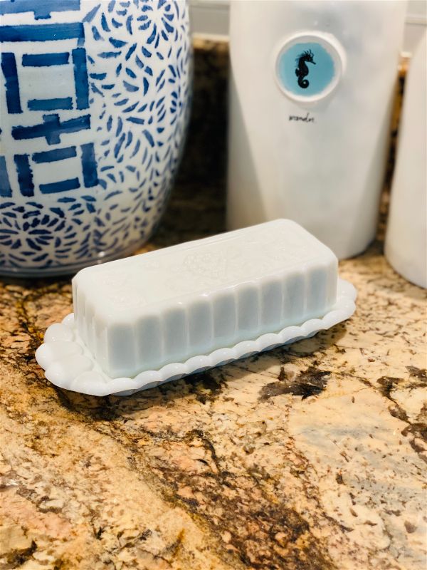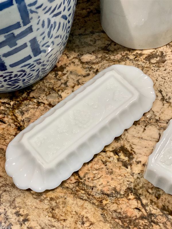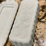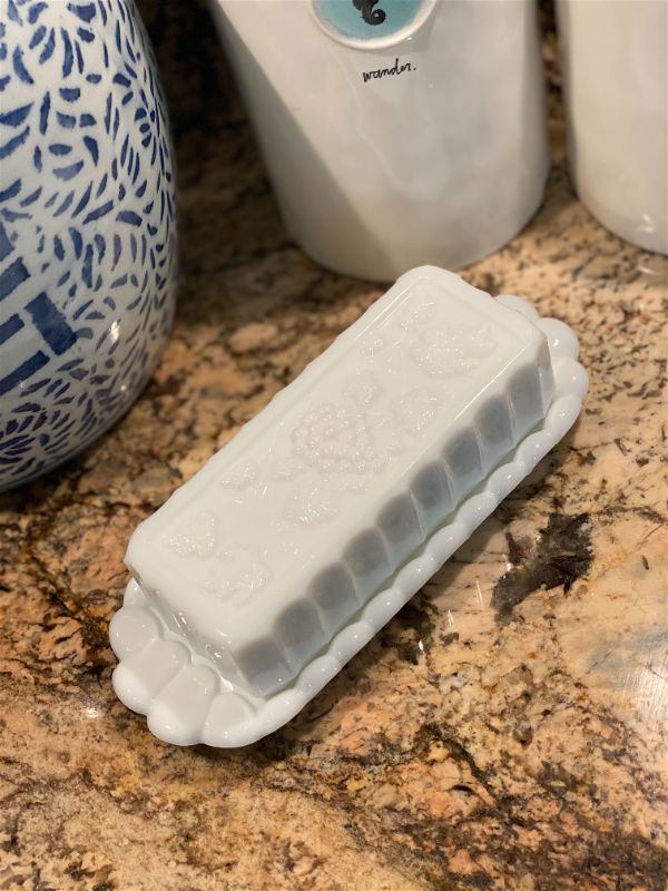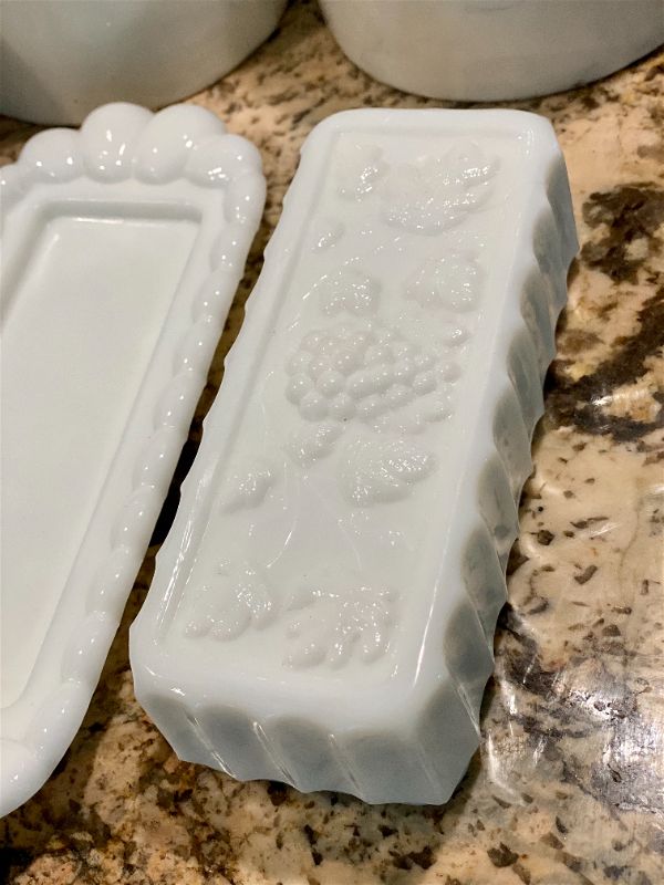 Milk glass vintage butter dish with grapevine motif. Decorative and functional for your tabletop. Milk glass mixes well with any decor and any china. Great for everyday use or special occasions.
