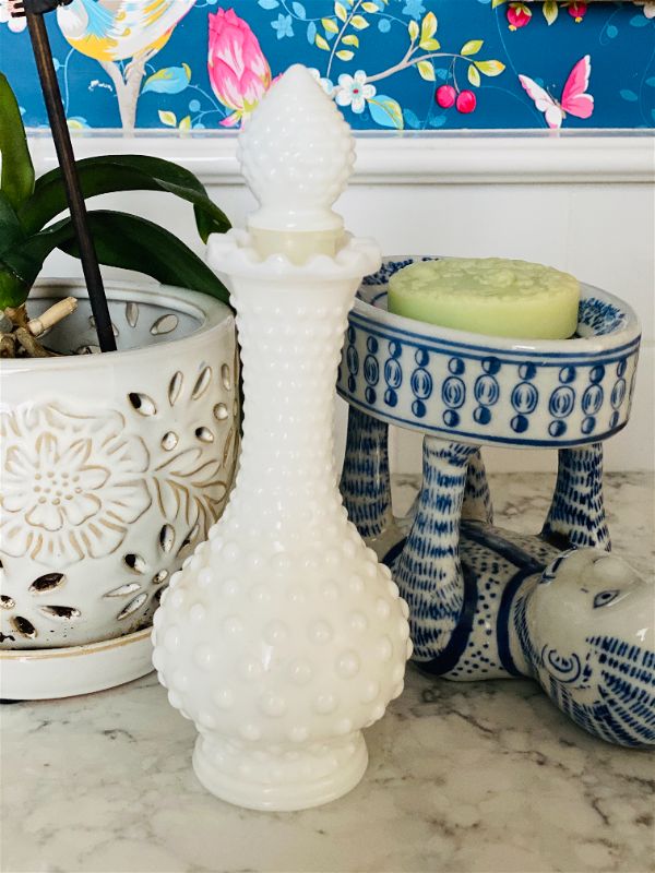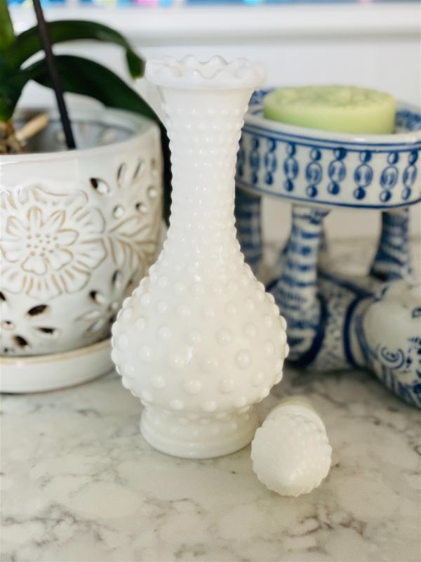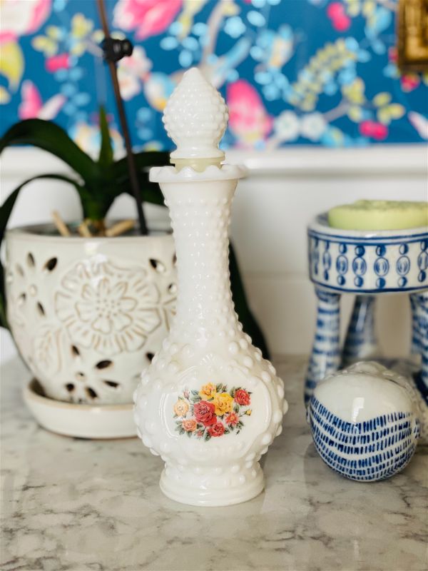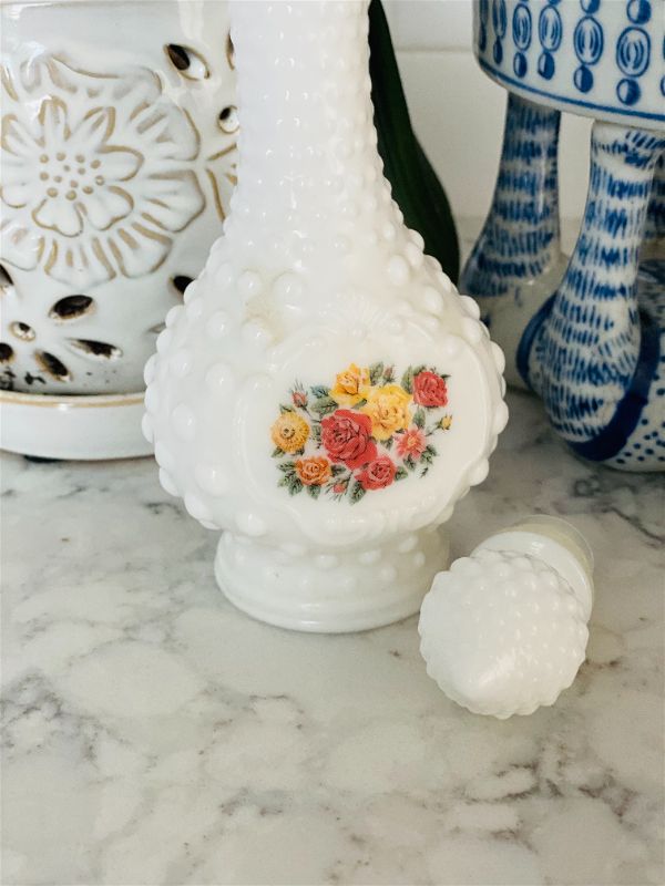 Milk glass hobnail floral perfume bottle/ decanter great vintage condition. Great to store on a vanity, or give as a gift. Add it to your milk glass collection. See picture details as they are part of the description.