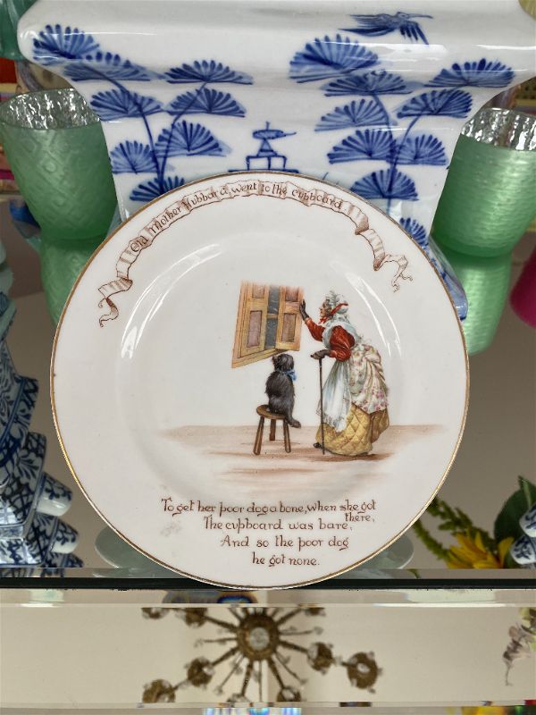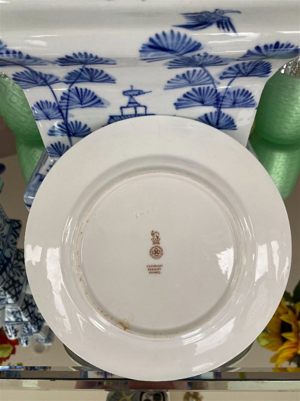 If you love Nursery Rhymes you will love this vintage plate. Mother hubbard is looking in her cupboard. Hand painted and stamped on the back with a rare makers mark. Great condition no chips or cracks. Perfect to display on a plate wall, shelf, or china cabinet. A fun, collectible piece.