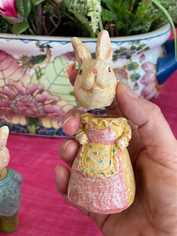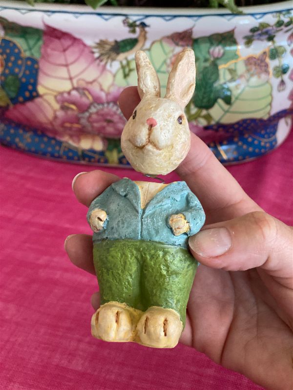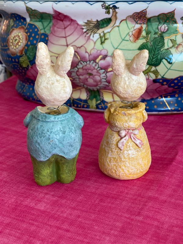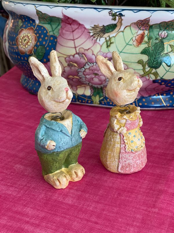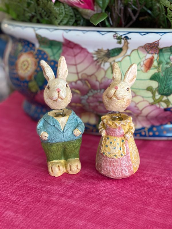 These fun bunny bobbleheads are a perfect addition to your Easter / Spring decor. Each is dresses in their Sunday best. Made of resin and painted in pastel colors. They will look great on a shelf, a stack of books, or in a vignette. The perfect addition to an Easter basket as well.