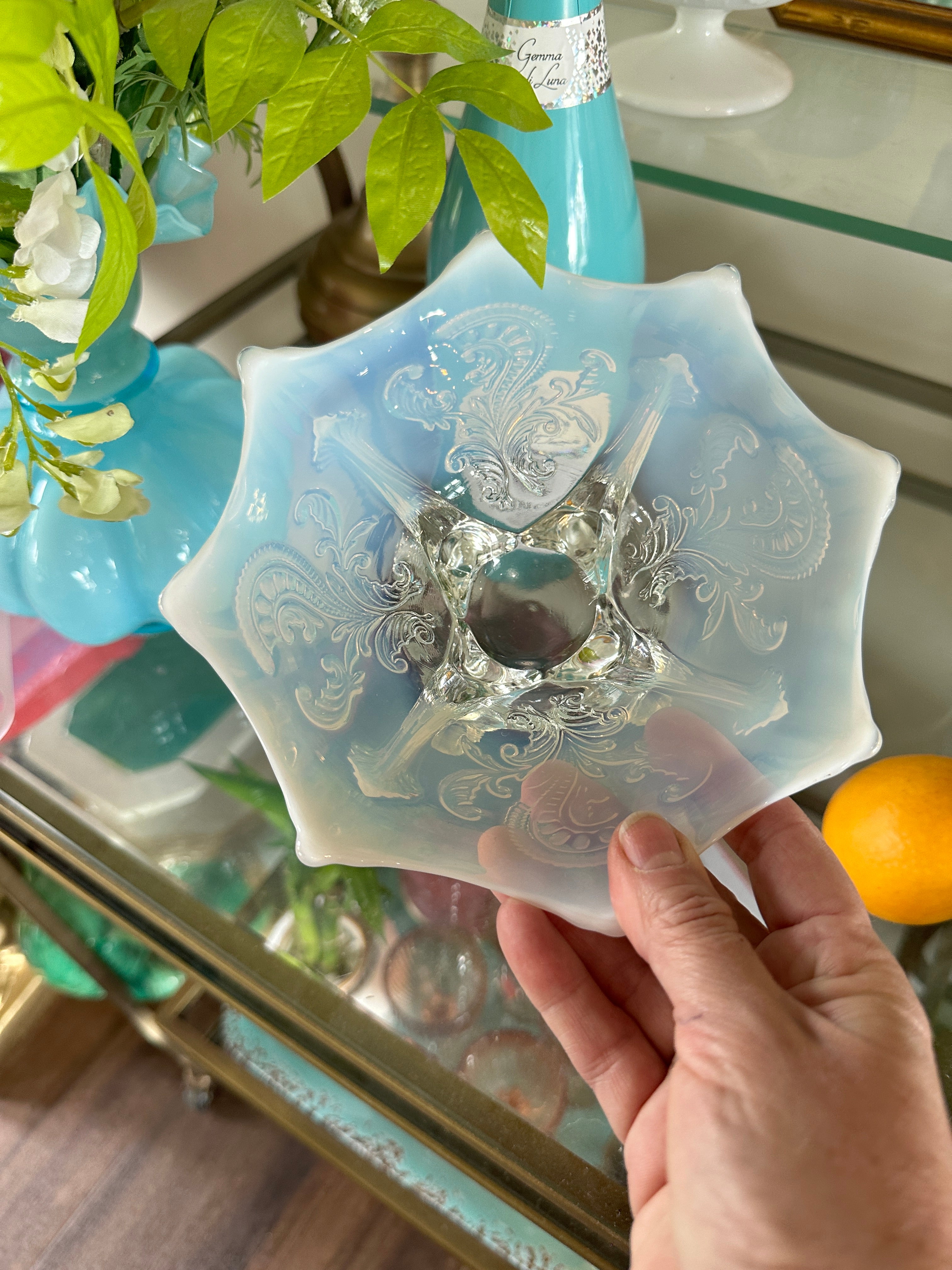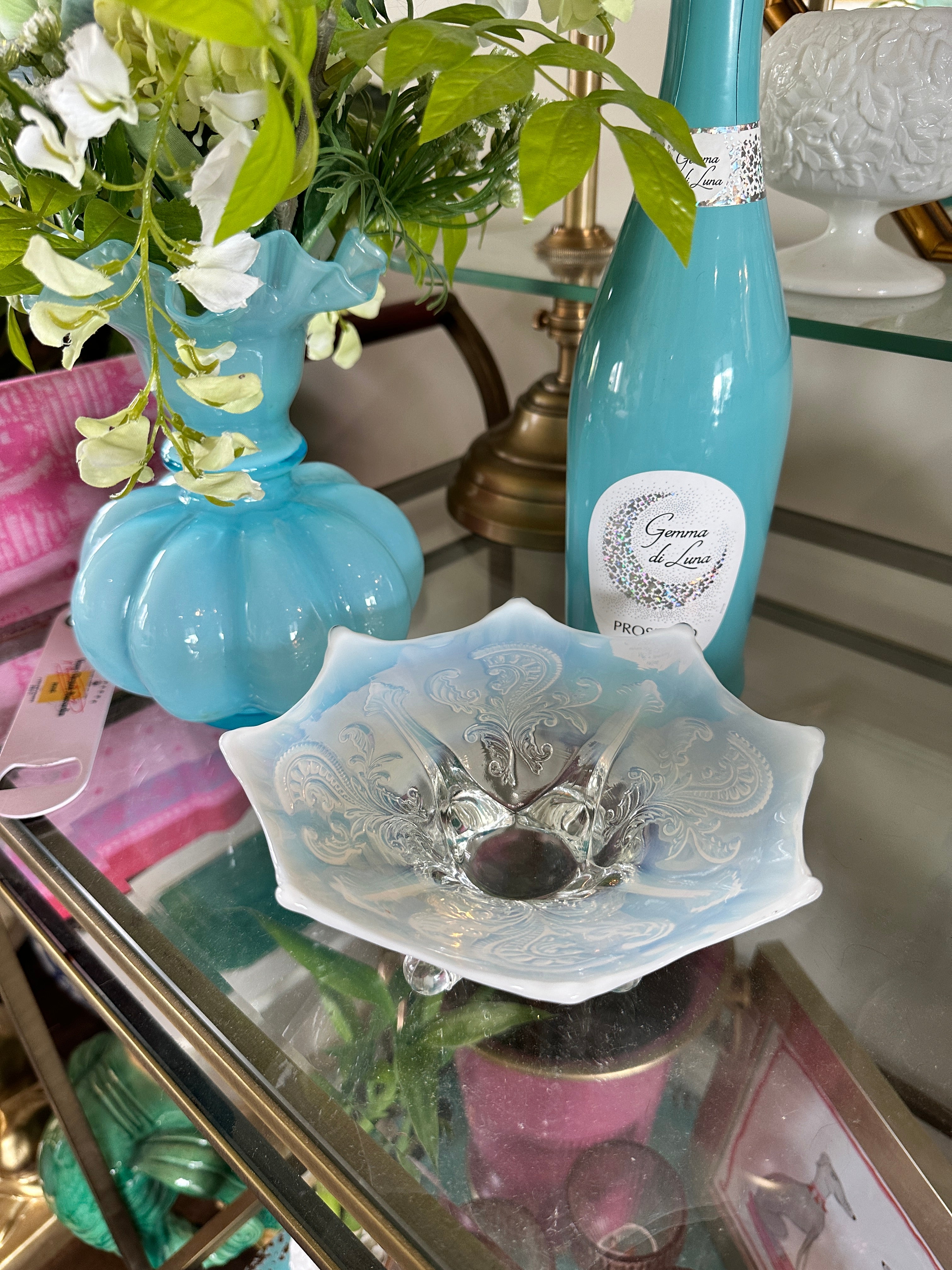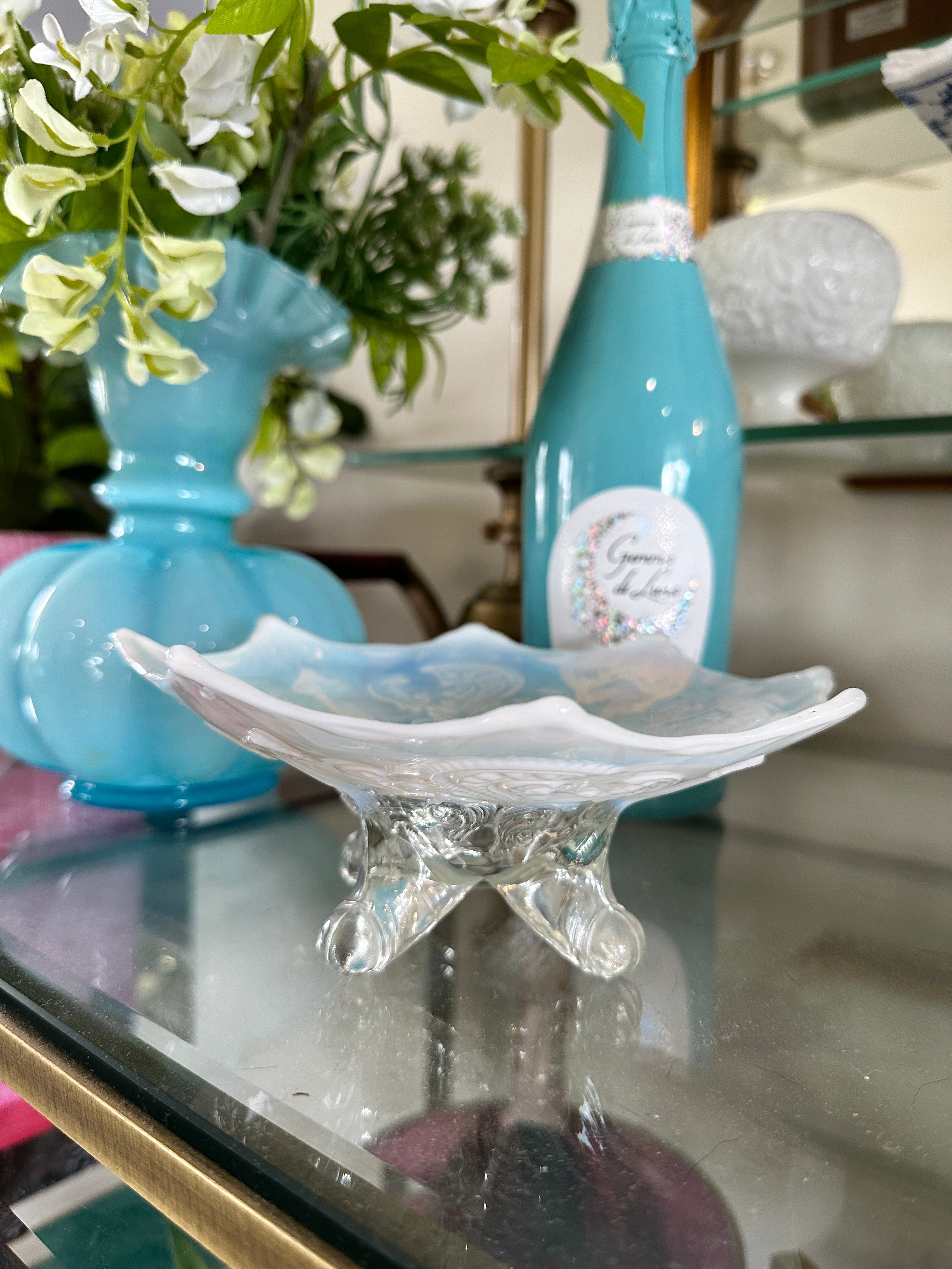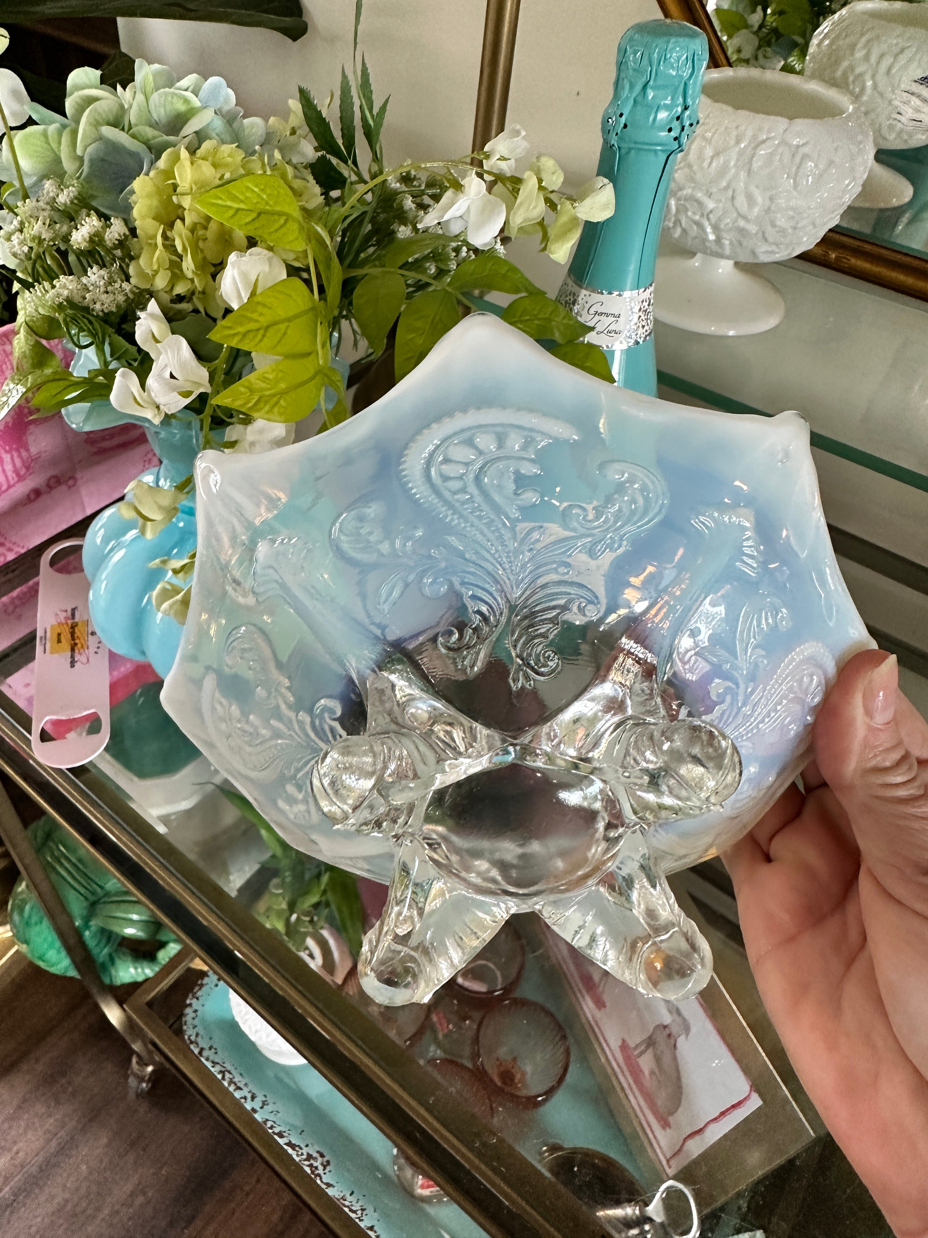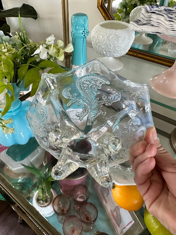 Antique glass bowls, Northwood Inverted Fan and Feather White Opalescent Footed Card Receiver