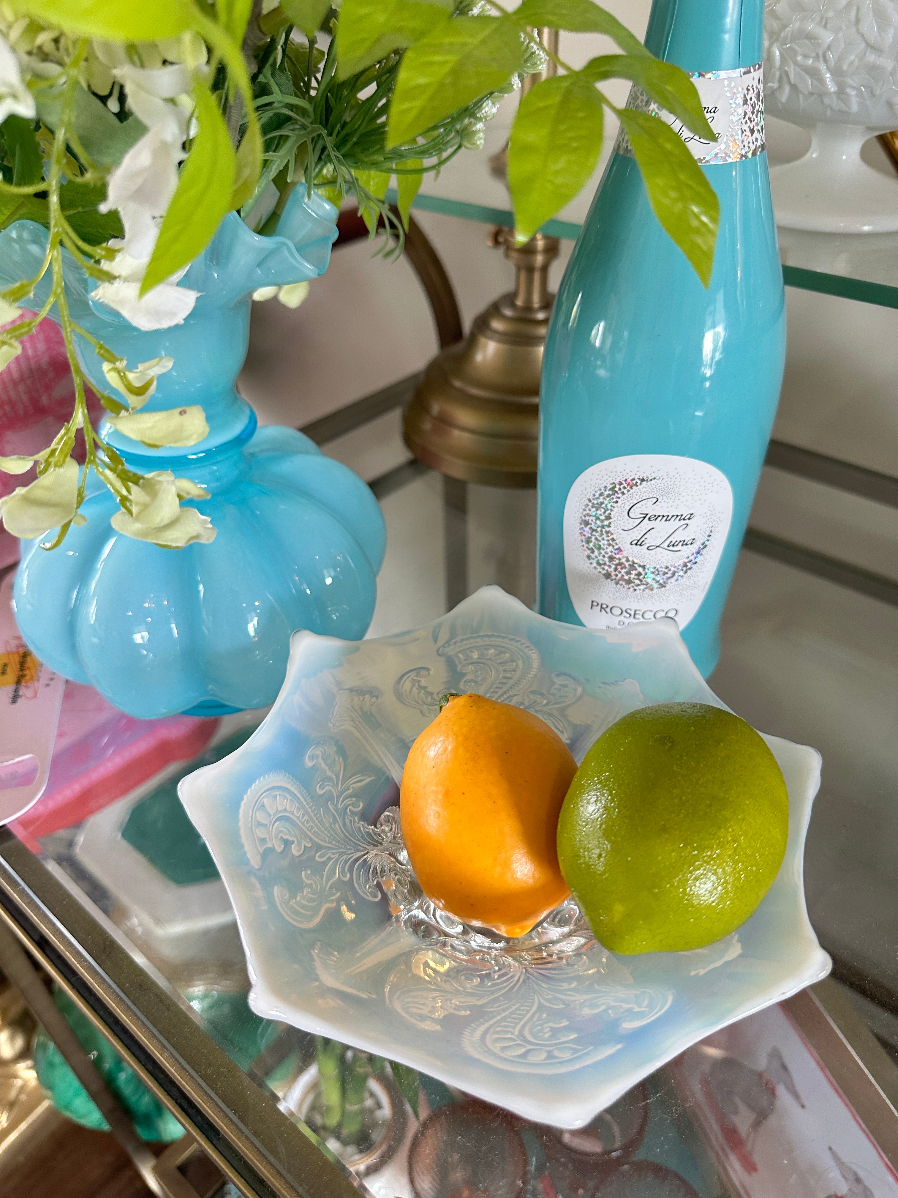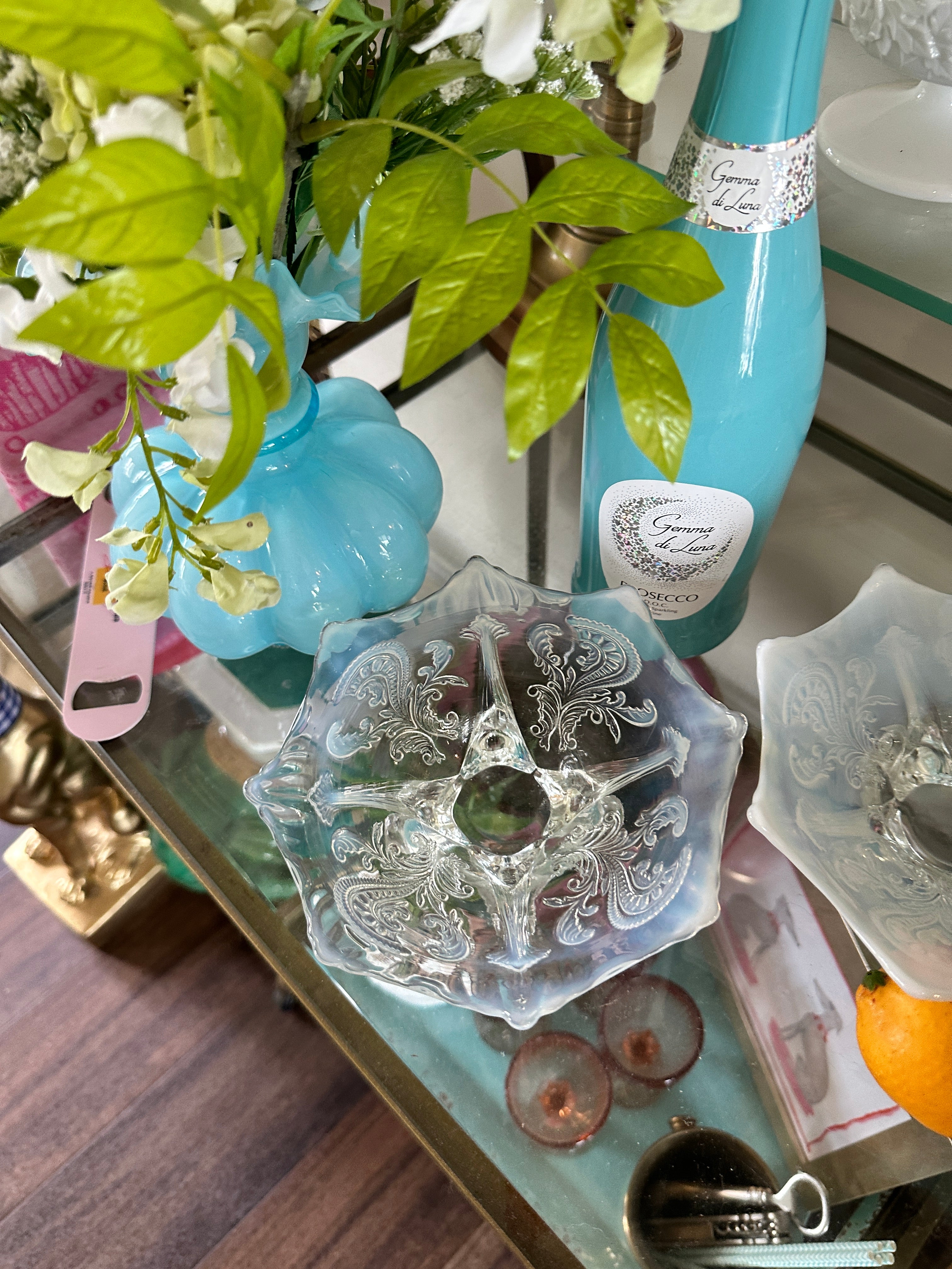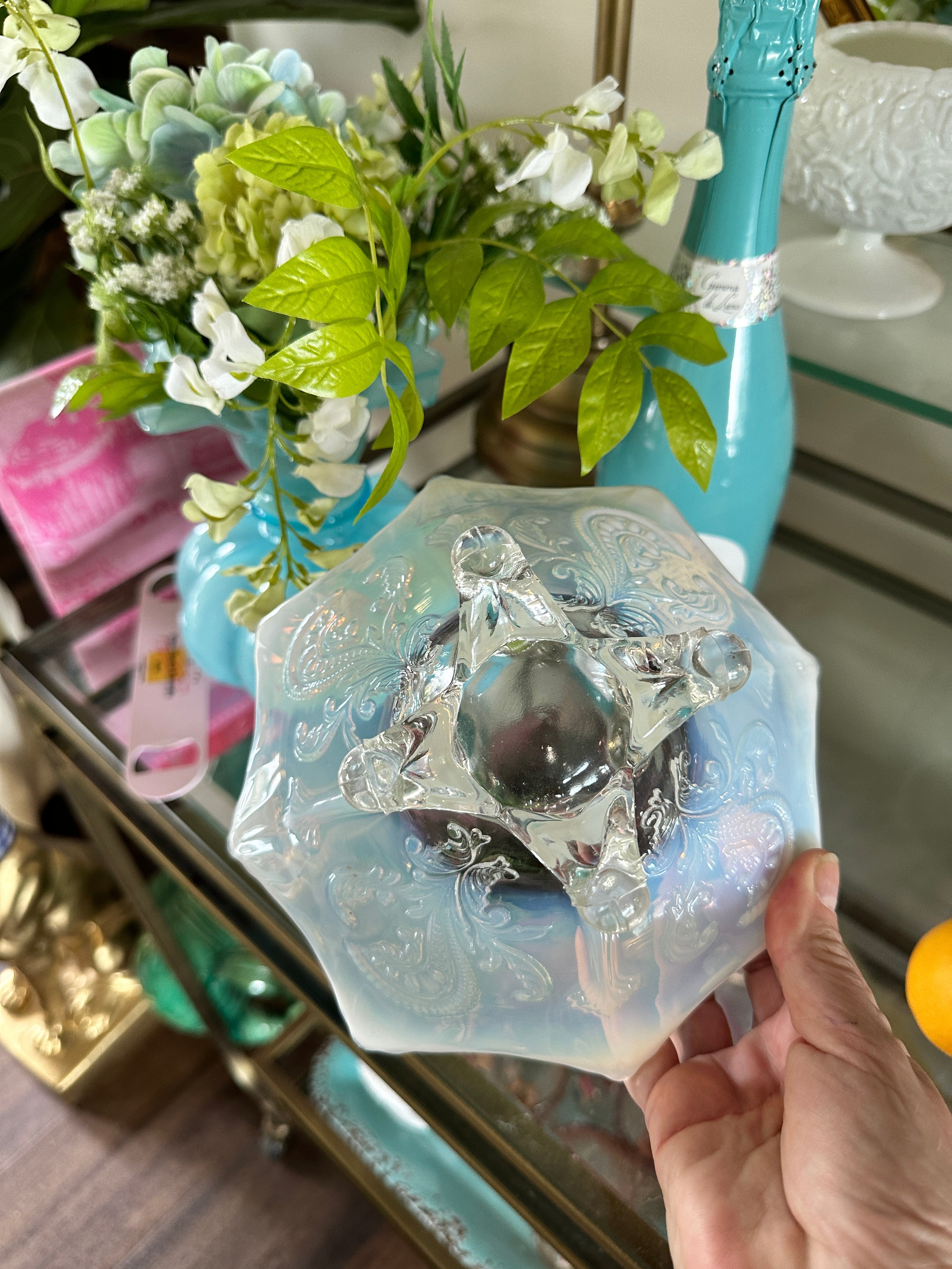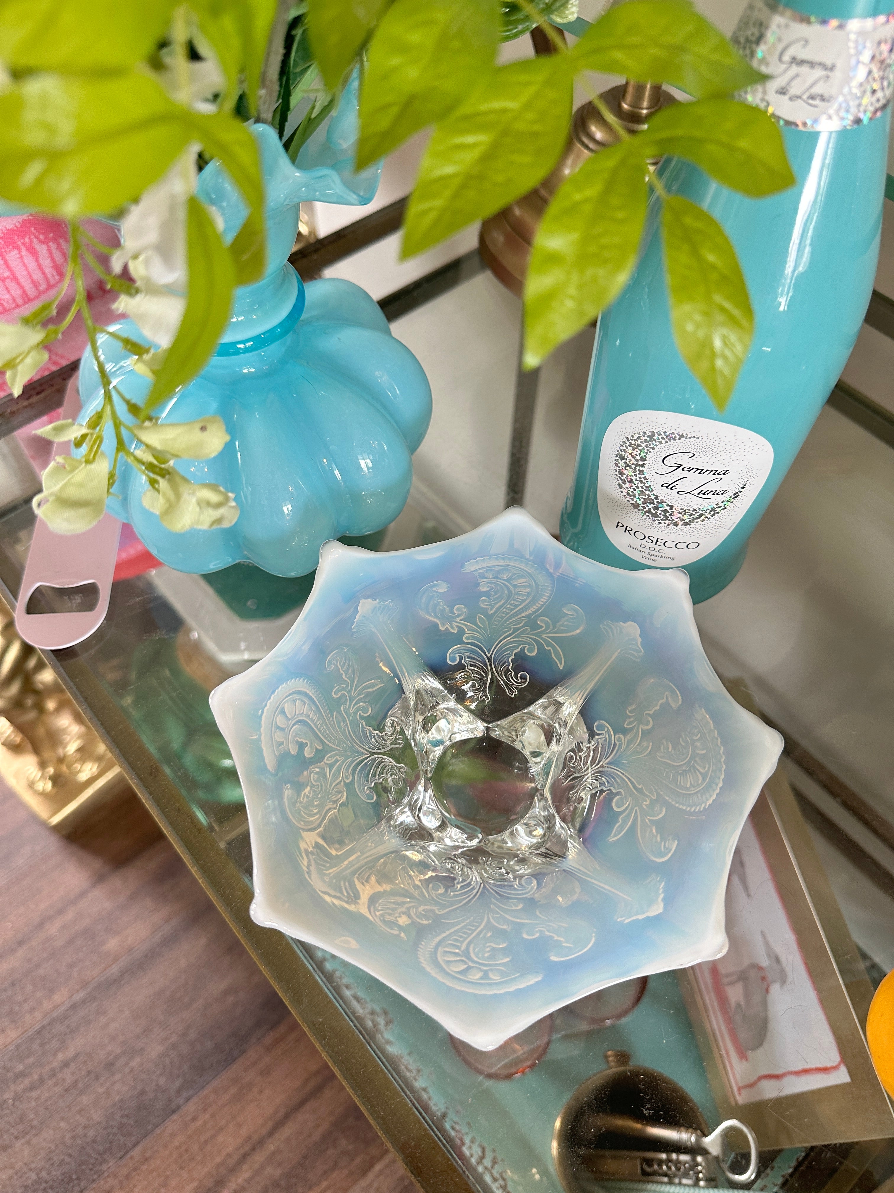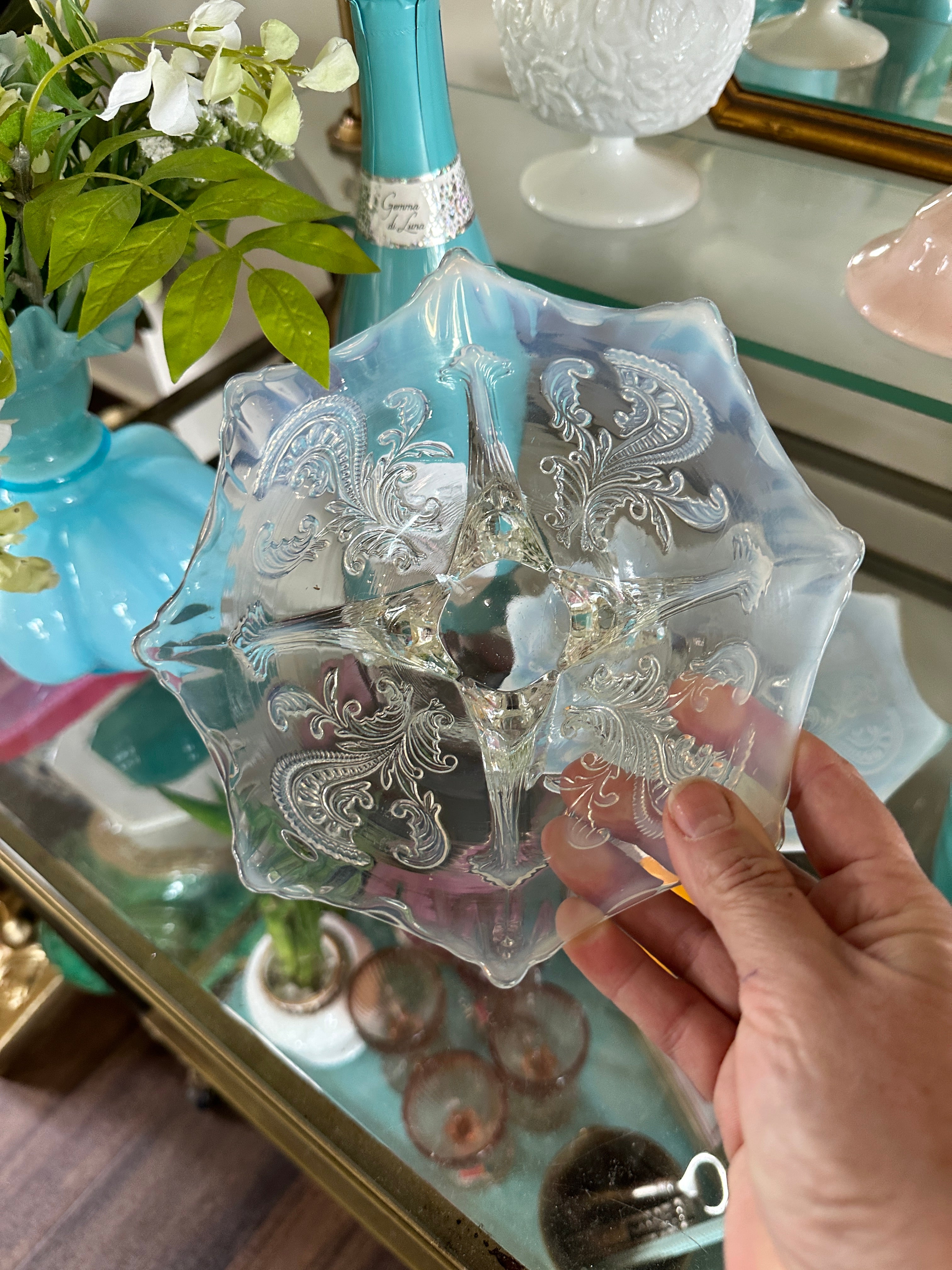 Antique glass bowls, Northwood Inverted Fan and Feather White Opalescent Footed Card Receiver