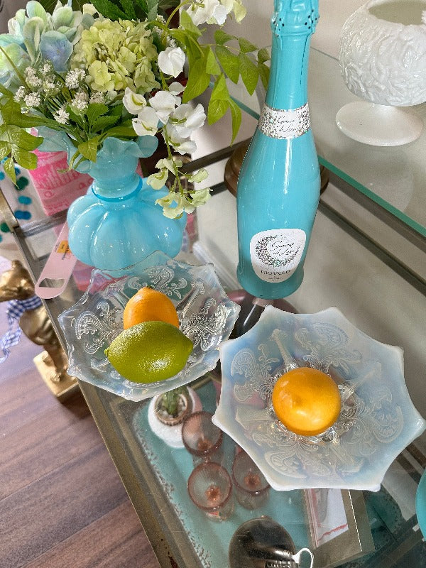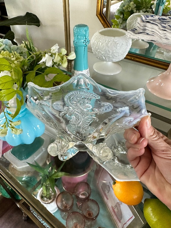 Here are two pretty items made by Northwood. Advertised as a white opalescent footed card receiver in 1901. The pattern is called inverted fan and feather. At well over 100 years old it's a true antique. They are in perfect condition with no chips or cracks, and no mineral deposits and it has very good Opalescence. The clear glass is clear and brilliant. Choose either one or both and use as decorative trinket dishes for jewelry, small desk supplies or candy.