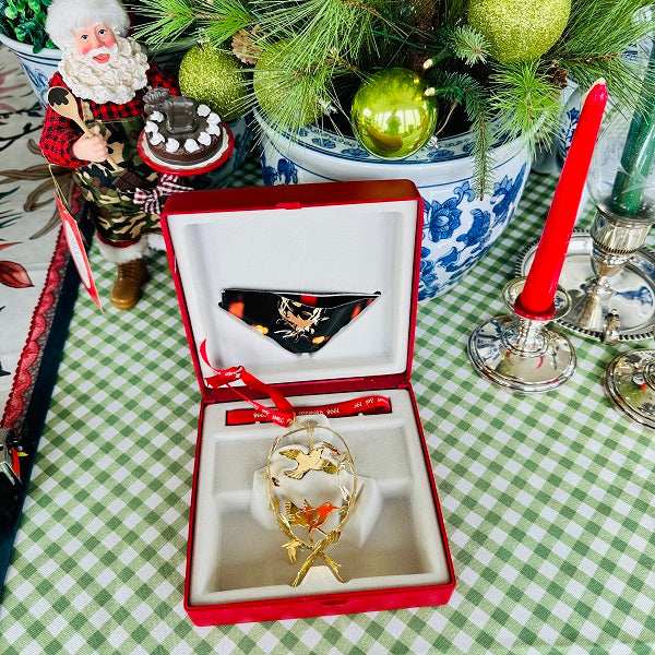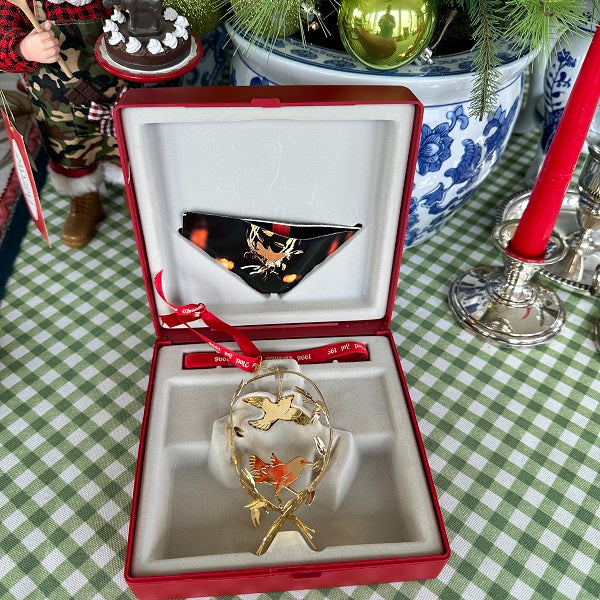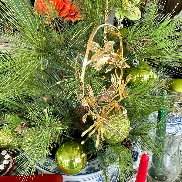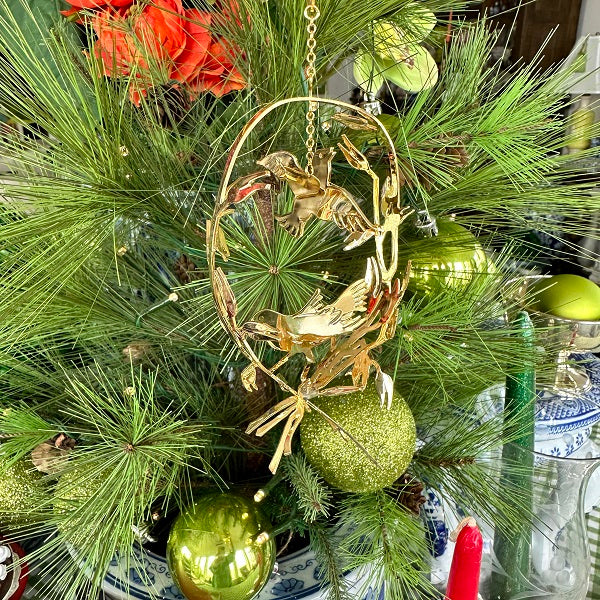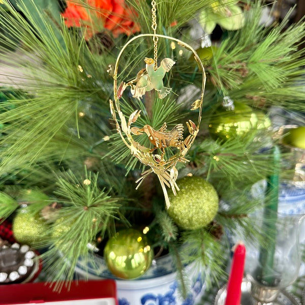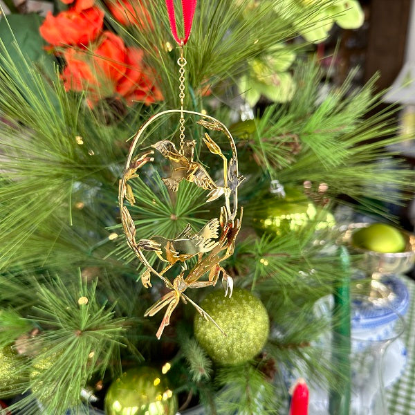 Each year a new artist helps to create the collection. Because of the movement of the ornaments they are usually described as mobiles. This one comes in it's original box with ribbon attached. This beautiful ornament has a gold sheen and the birds float as the ornament swings and turns on the Christmas tree.