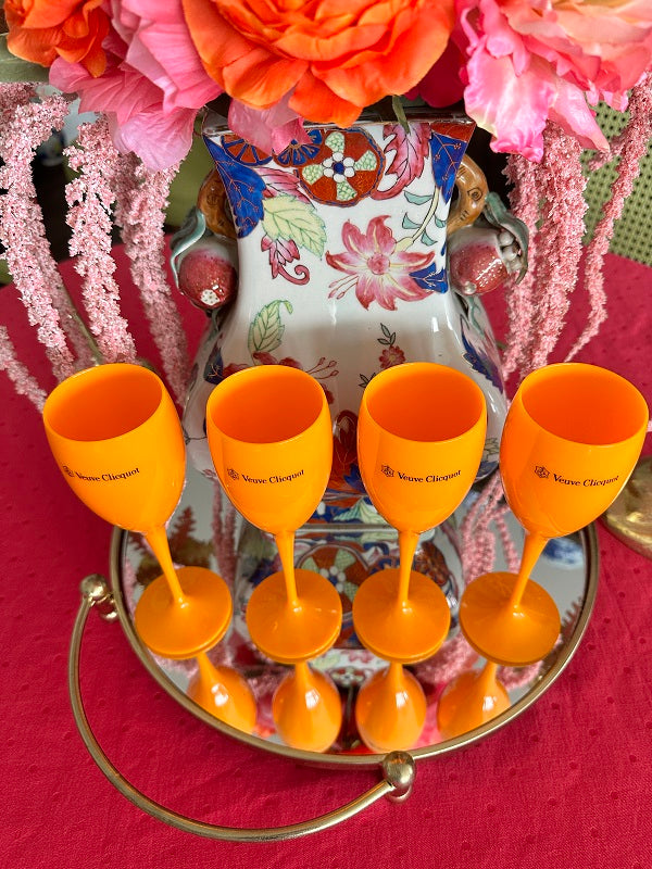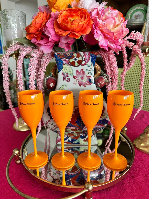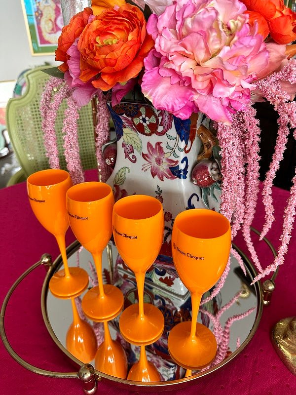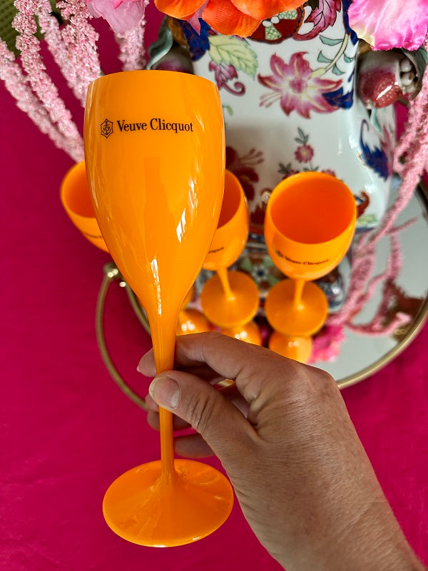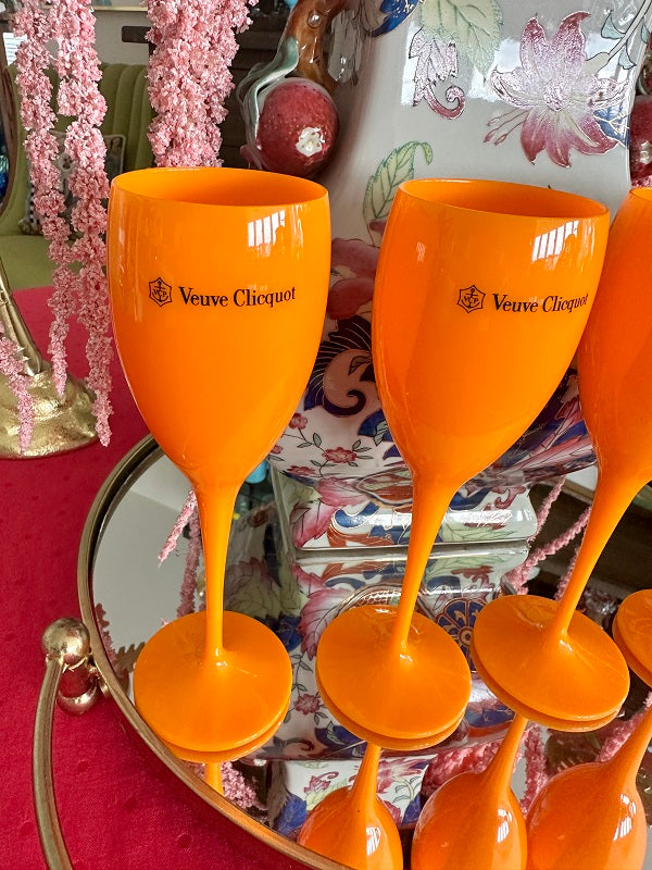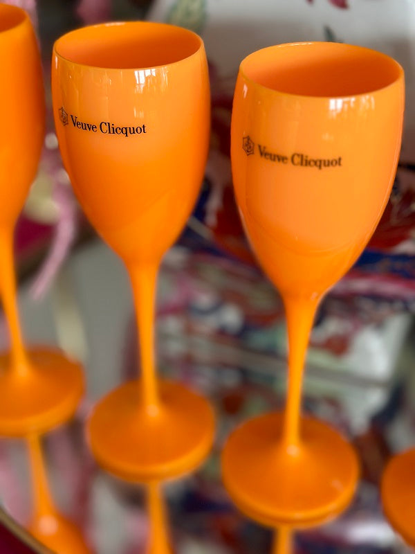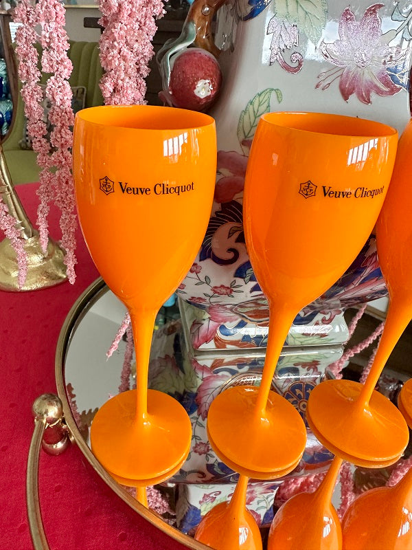 Add a pretty orange vibe to your bar with these champagne glasses. They are made of a hard plastic so they won't break. The signature high end champagne label "Veuve Clicquot" is displayed on each glass. Great for Valentine's Day, birthdays, New Years Eve, or any occasion you need to "Cheers"🥂. The bright orange adds a pop of color and the flute feels great in your hand. New item. Choose the number you wish to purchase...price is for one champagne flute.