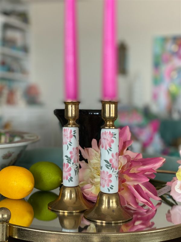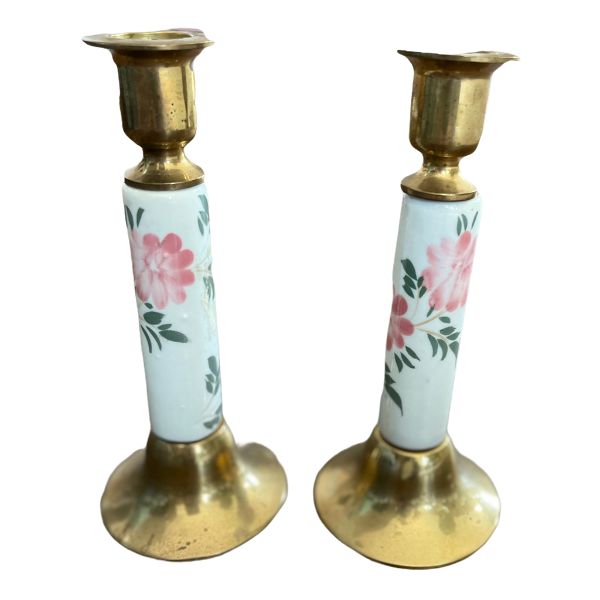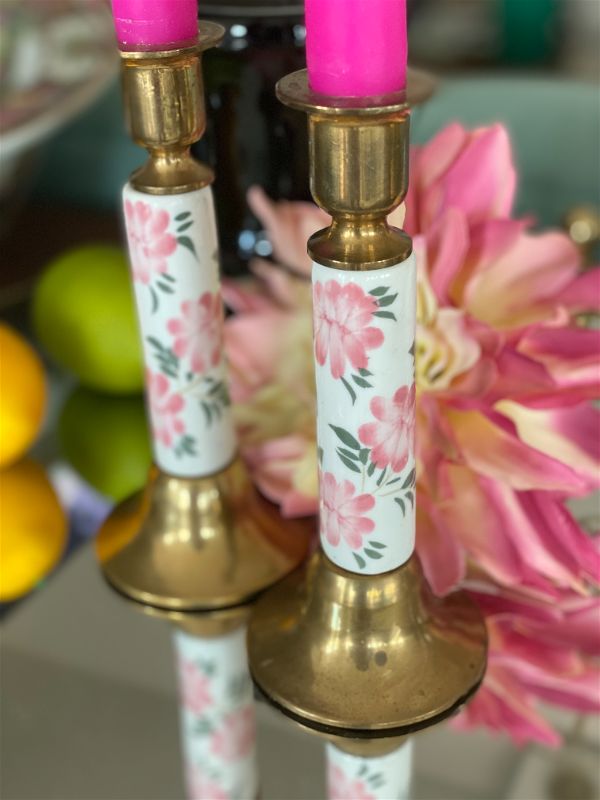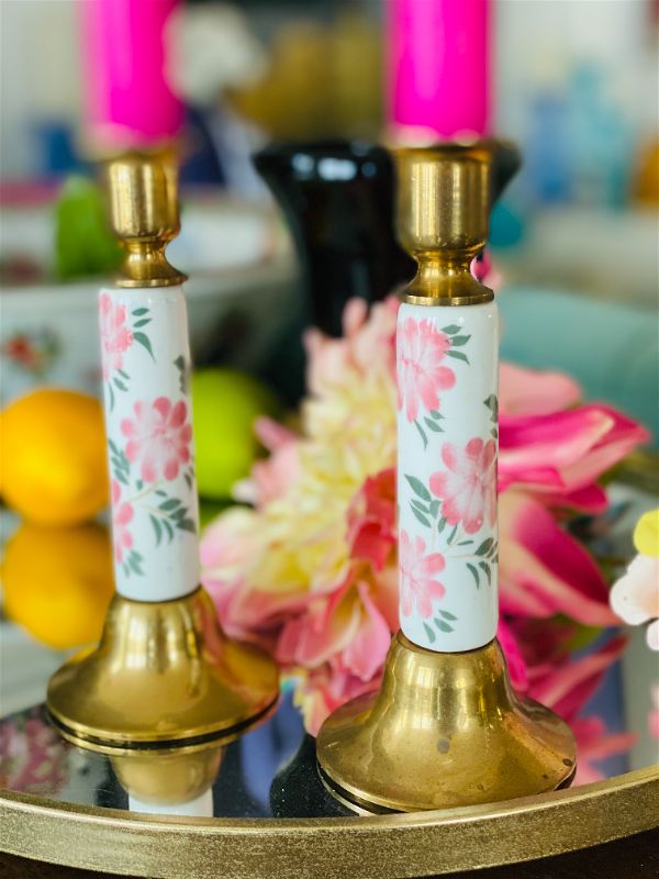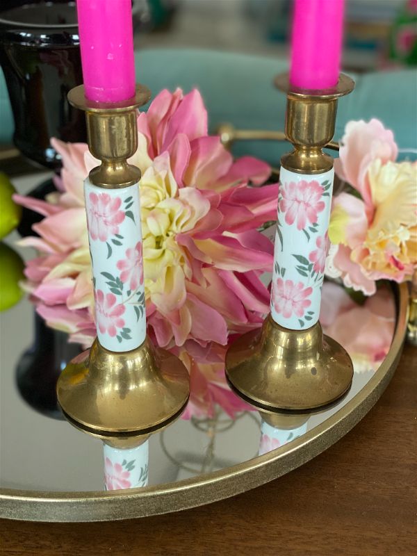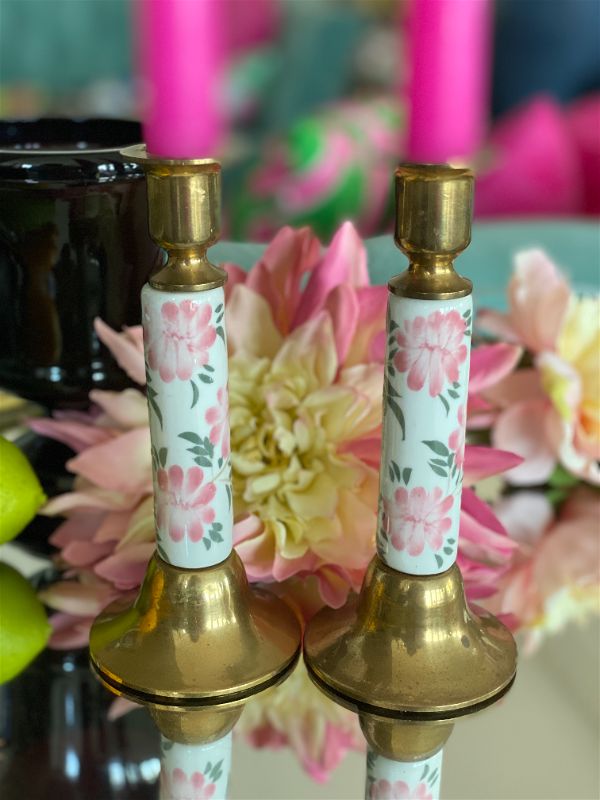 Vintage Brass and pink and green floral ceramic candle holders are always a fan favorite!