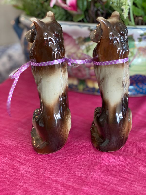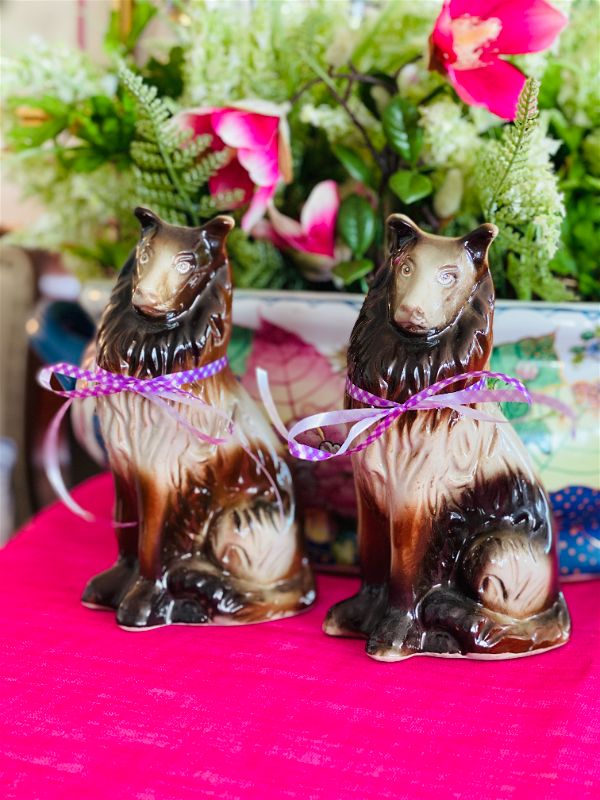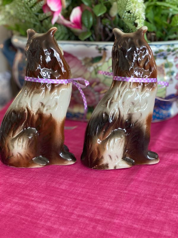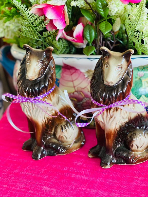This sweet pair of pups are great to display on a shelf, table, or vignette. Add them to a mantel or china cabinet grouped with other vintage hand painted dogs for a fun look. Do you have a friend who loves Collies.. maybe they have a collie. These would be a great gift. Made by handcrafted collectibles and stamped on the bottom. Fully hand painted and glazed.