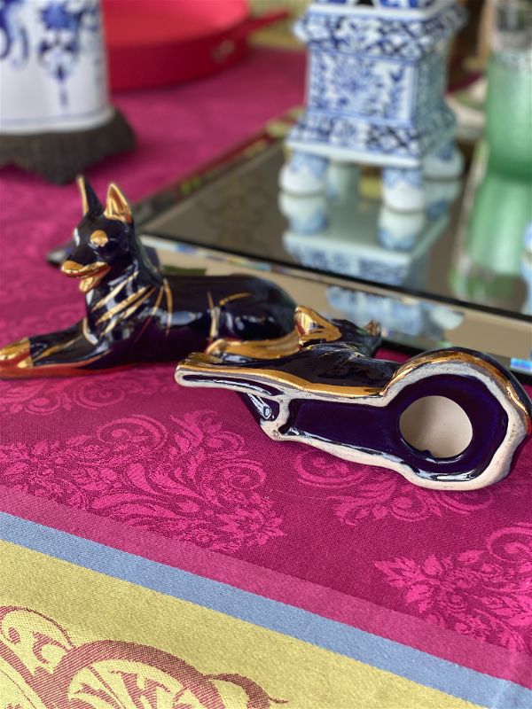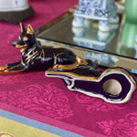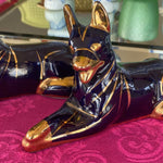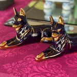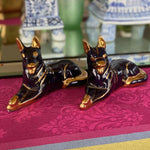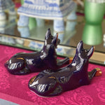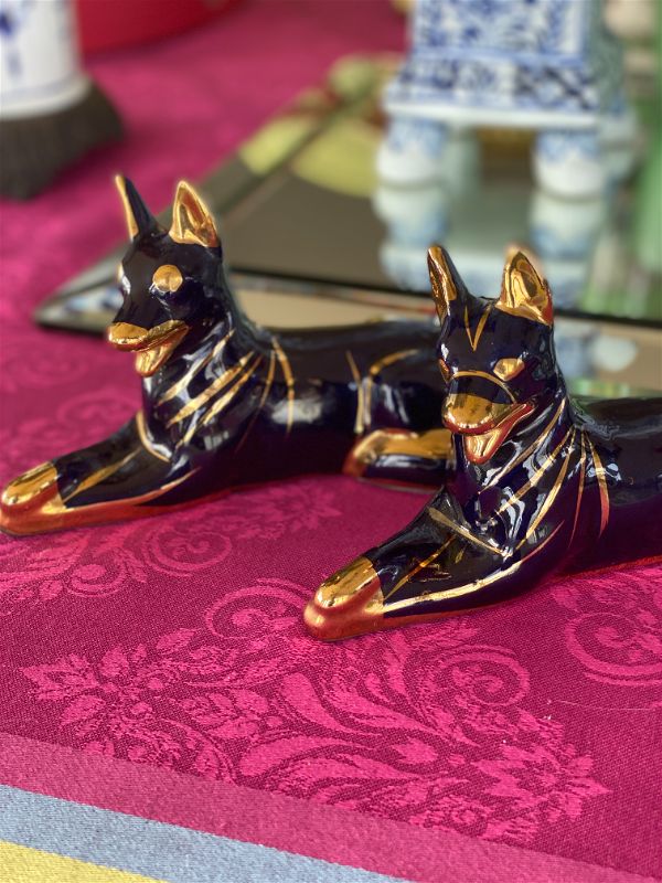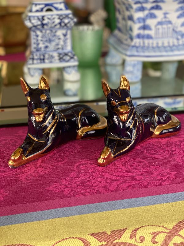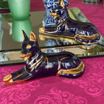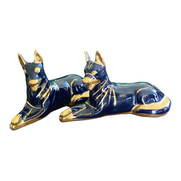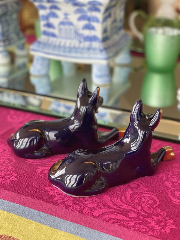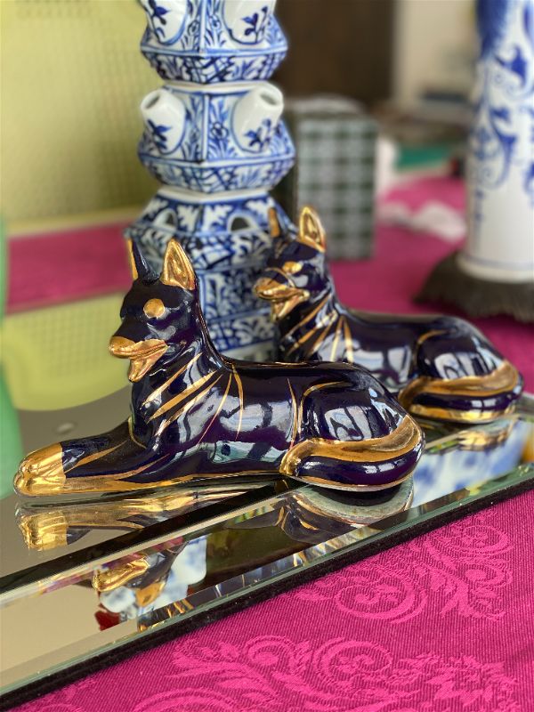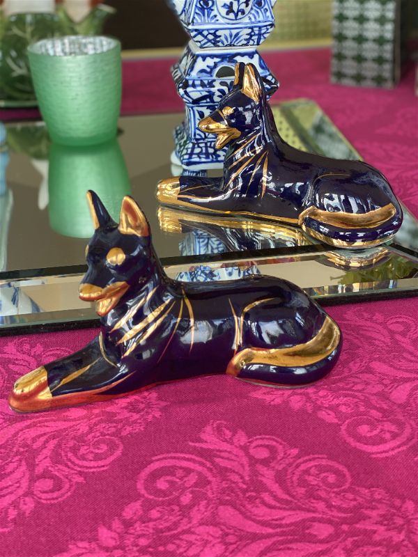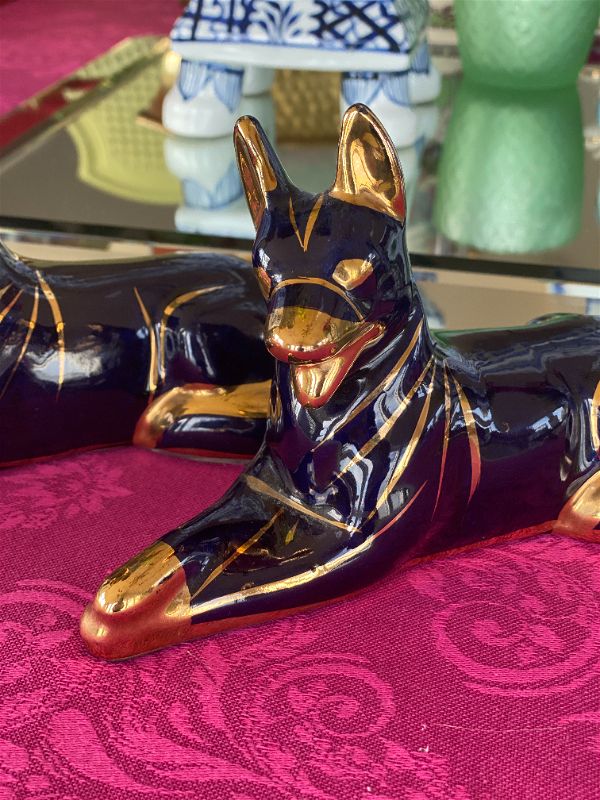 These pointy eared ceramic pups are glazed in shiny navy blue and gold. A Great addition to your blue and white chinoiserie. They are sitting with paws together and alert. Great condition. Made from a mold. No chips or cracks. Fun figurines to display on a shelf or table. See pictures as they are part of the description.