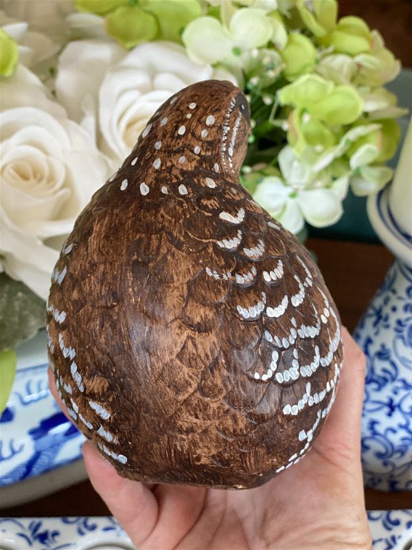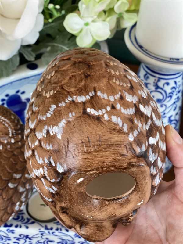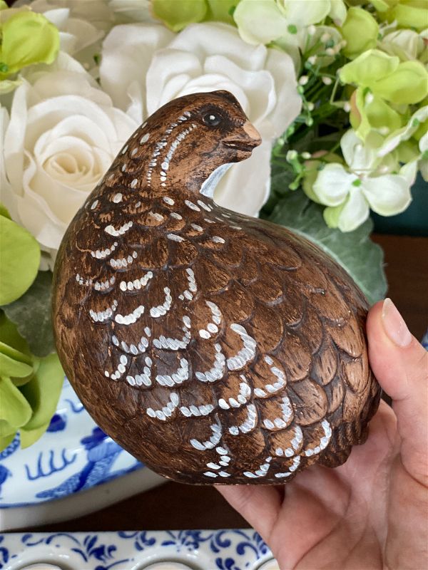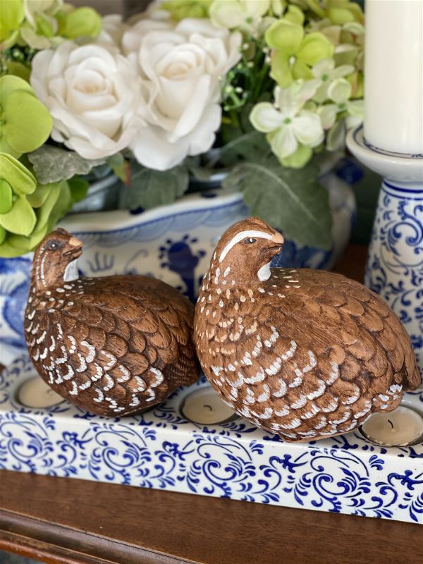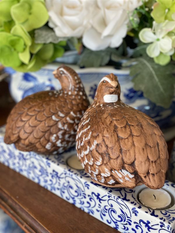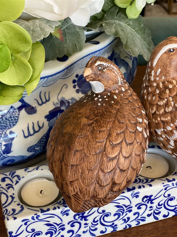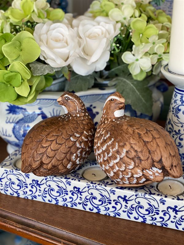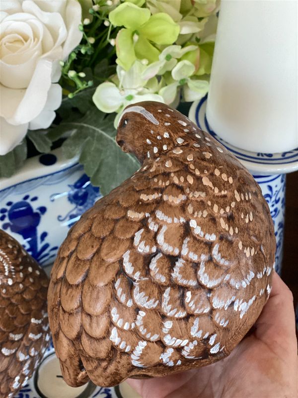 It's never too late to start thinking about Fall decor. This sweet pair of hand painted quail are signed by the artist. They are a rich brown color with white accents and detailed feathers. Perfect for your Fall table setting or Thanksgiving decor. Great condition no chips or cracks. Ready to display.