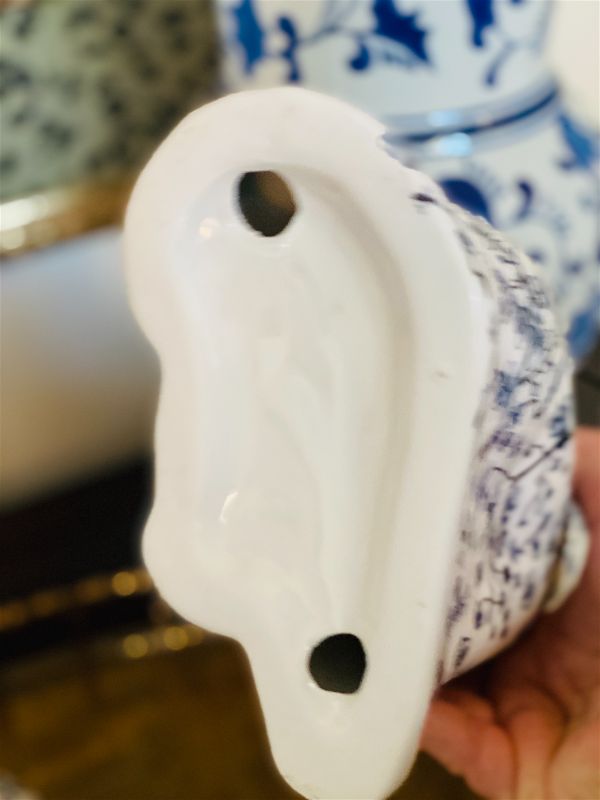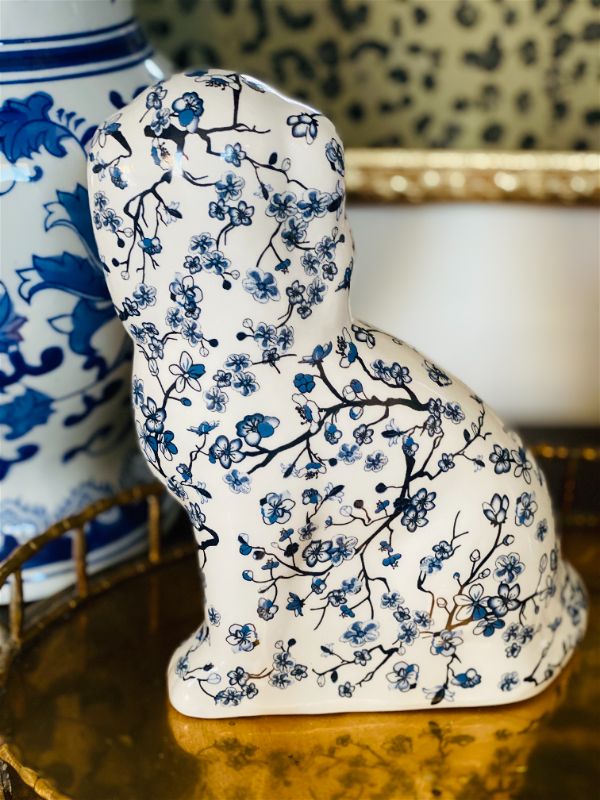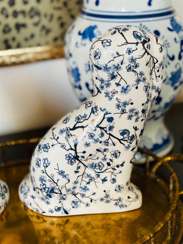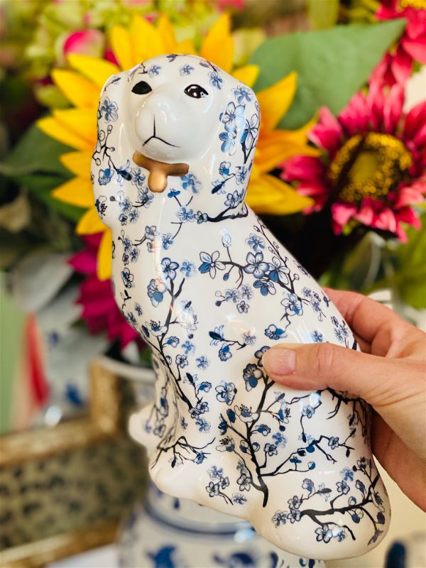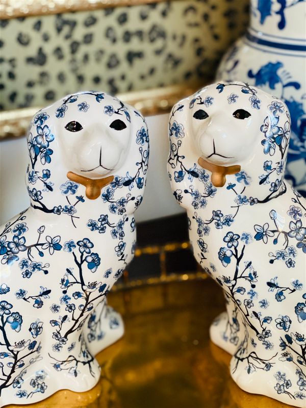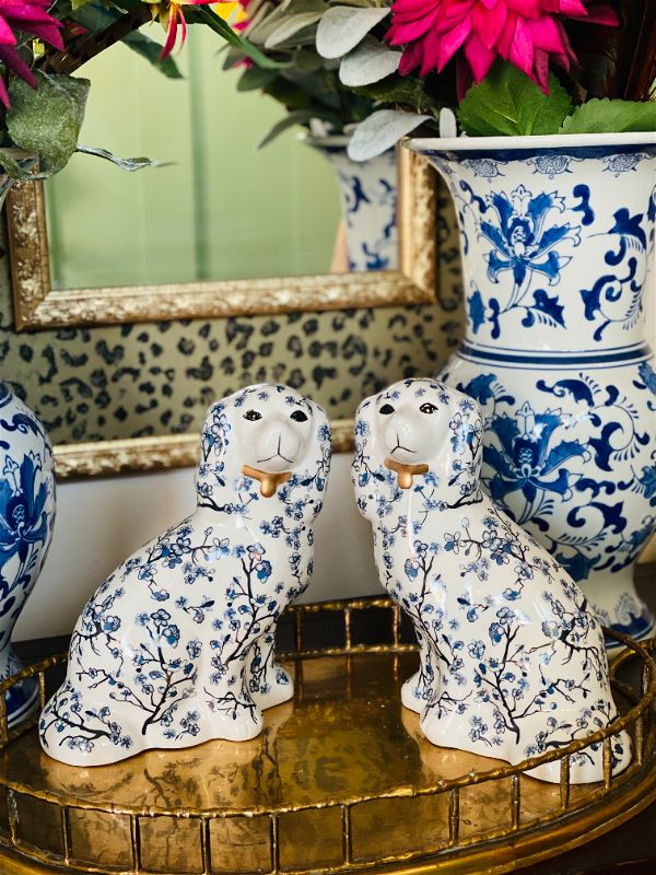 Cherry Blossoms are blooming and showing signs of Spring.. and so are these fun floral Staffordshire Style dogs. Blue and white motif goes perfect with most any decor. These pups have black eyes and gold accent collars. Great to add to a shelf, table, entranceway or vignette.