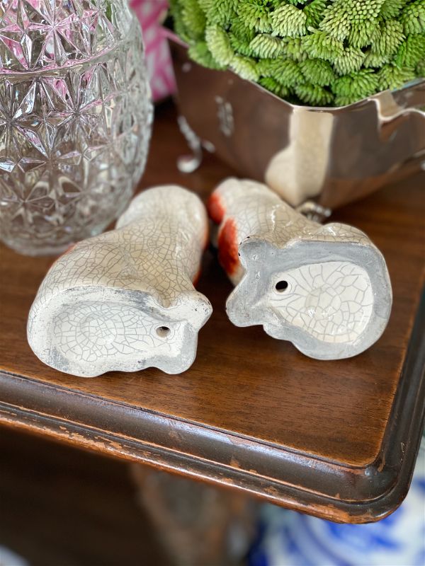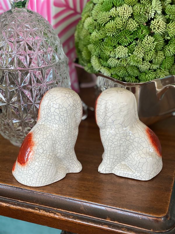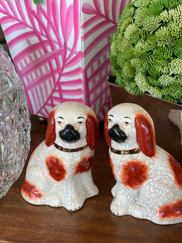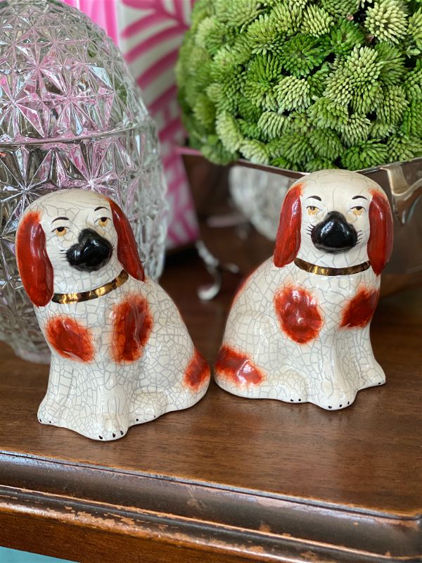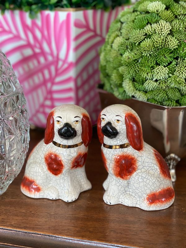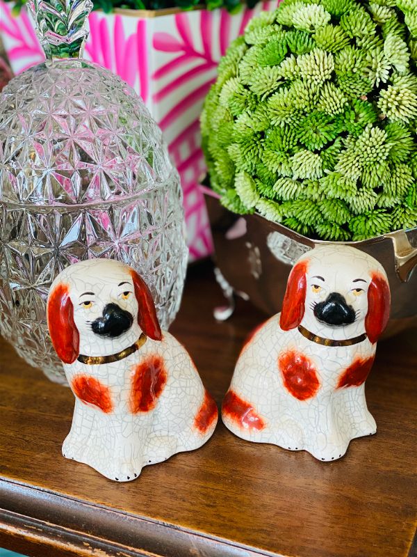 This cute Pair of Staffordshire reproduction dog figurines make a nice addition to a shelf or window sill. In perfect vintage condition and ready to display. Add them to a coffee table vignette or group them with your vintage collection. I have an entire shelving unit dedicated to dogs and cats.