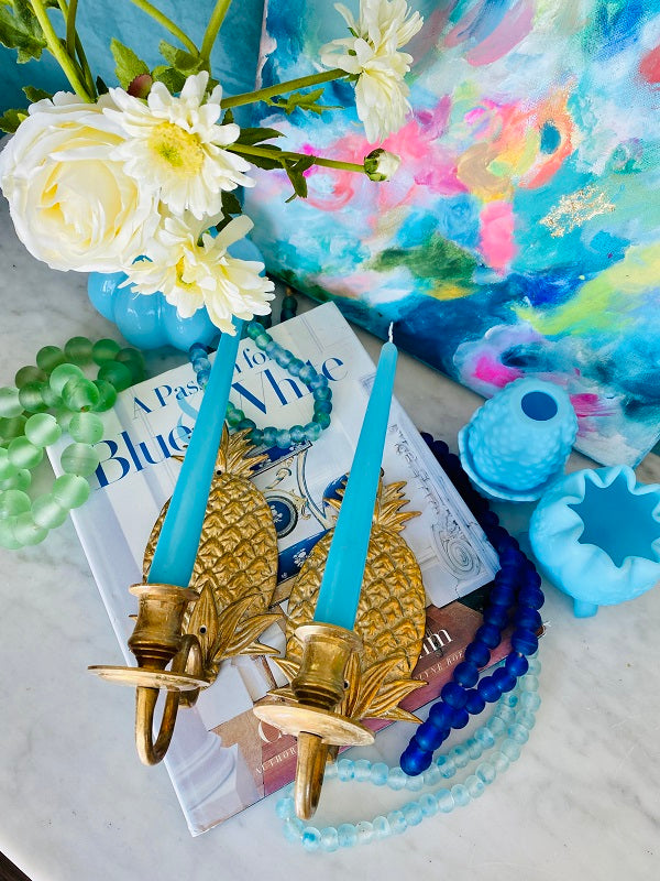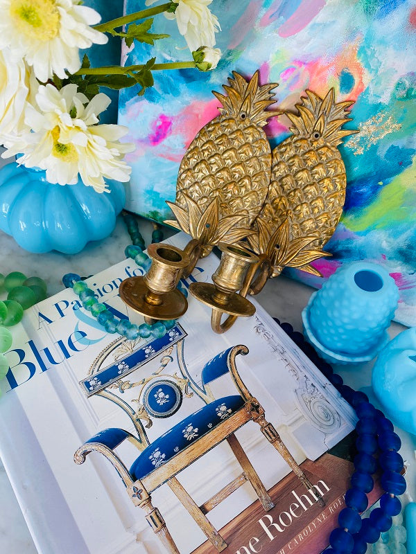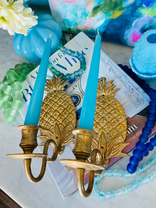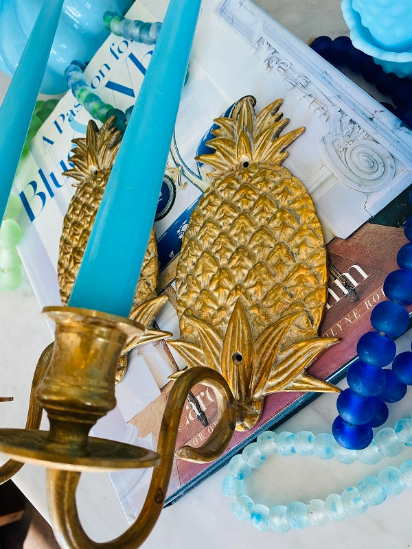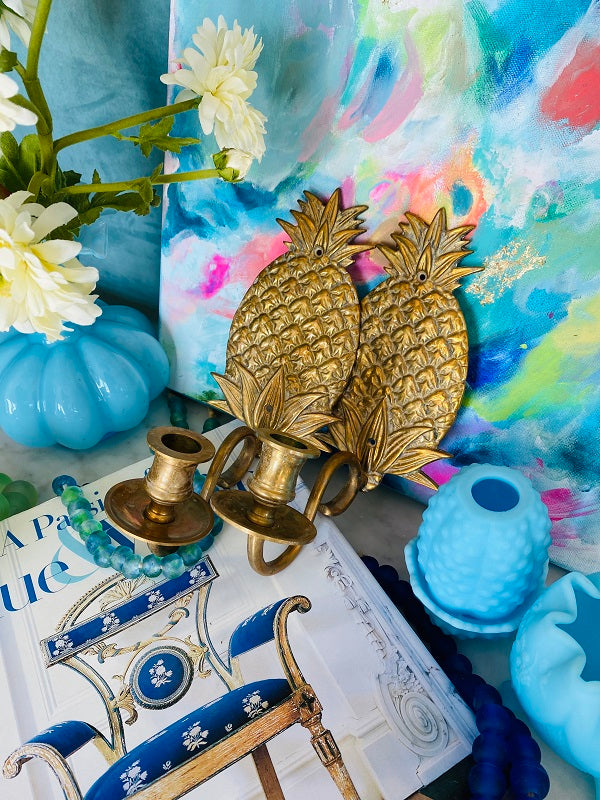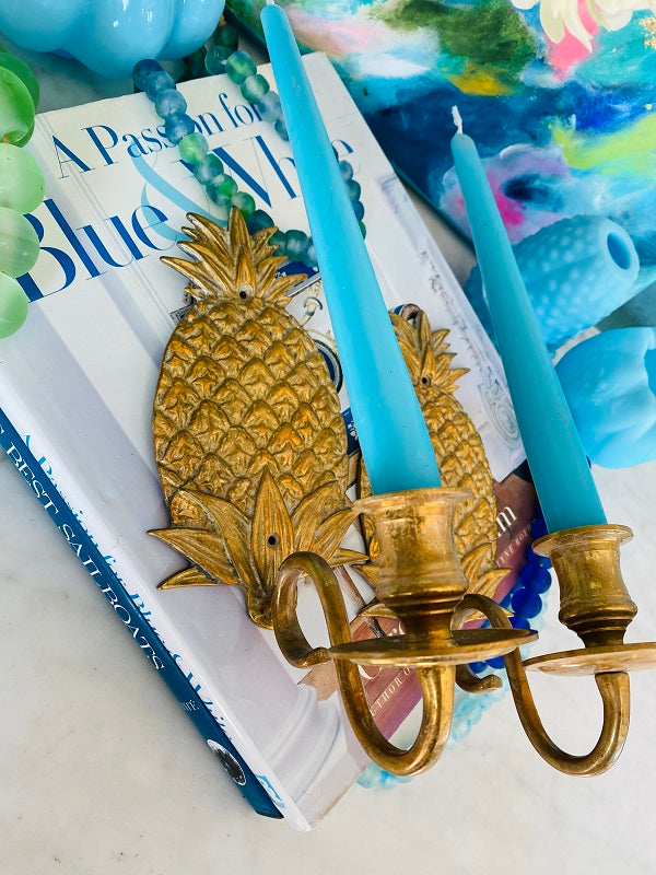 The pineapple represents hospitality and welcomes guests to your home. Add these beautiful pineapple brass sconces to accent a a large painting or mirror. Add them to either side of a doorway, or piece of furniture. They add a touch of sparkle and are perfect for a colorful space with a bold colored tapers, or a neutral space with white or cream candles.