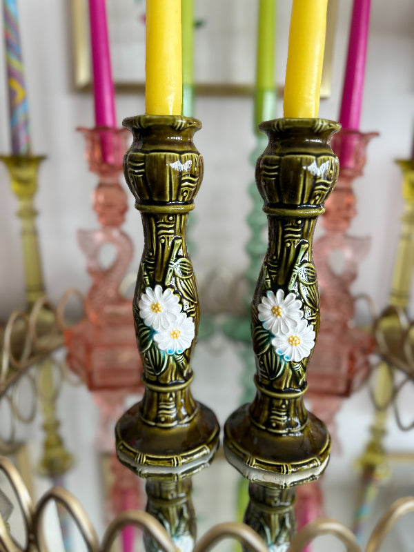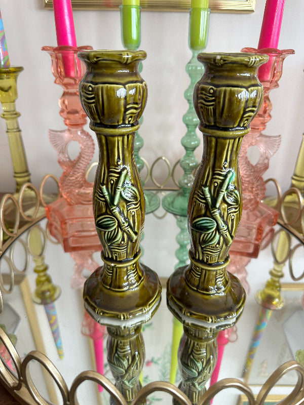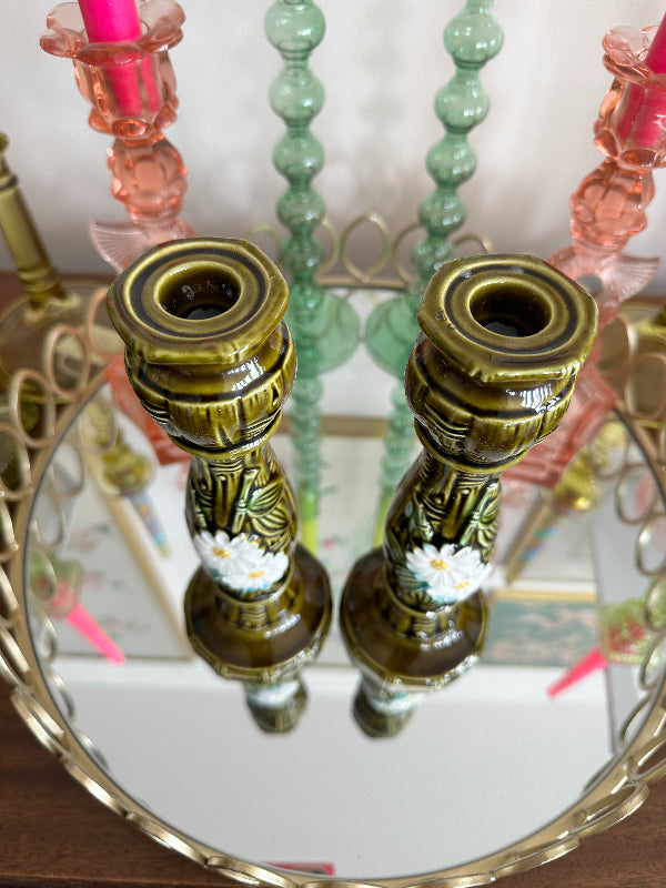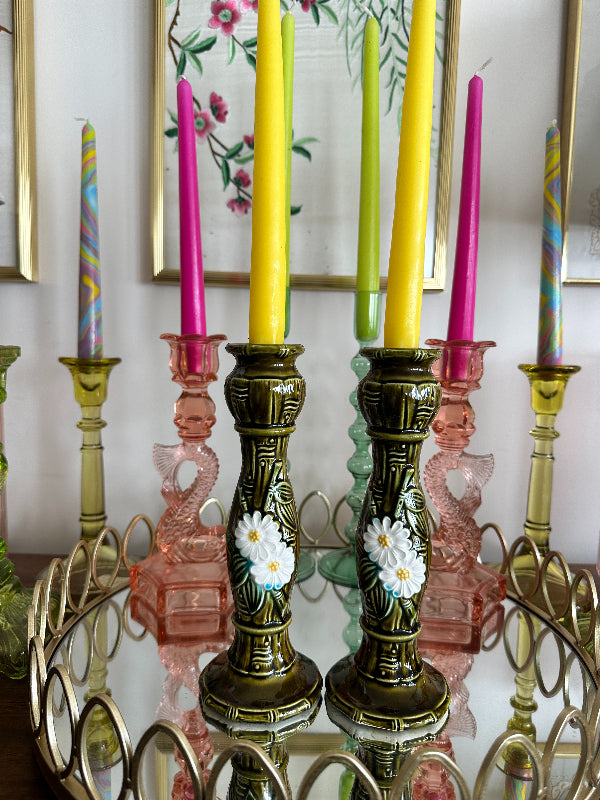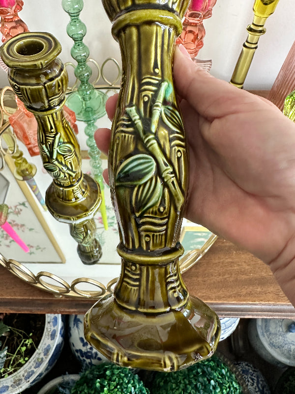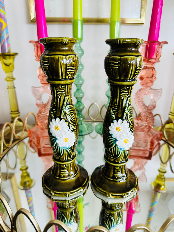 Vintage Candle Holders, Majolica Style Green Bamboo and Daisy, Mid Century Modern, Pair