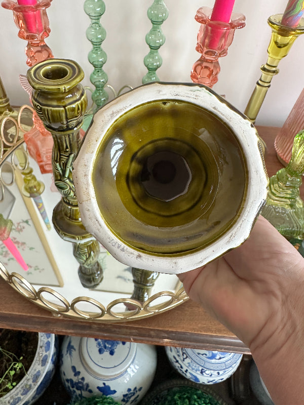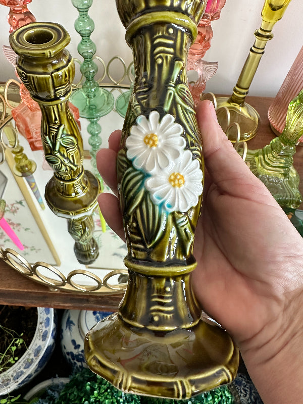 Vintage Candle Holders, Majolica Style Green Bamboo and Daisy, Mid Century Modern