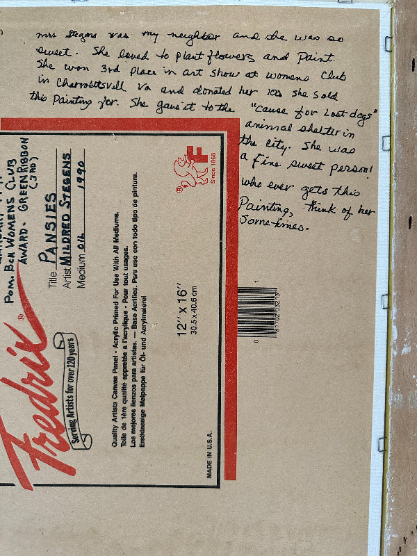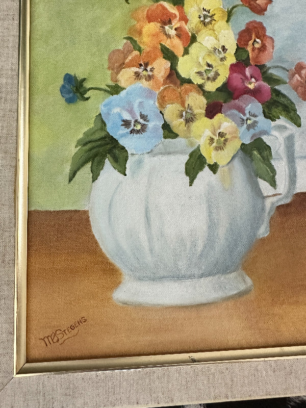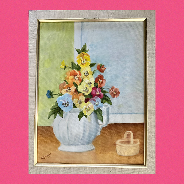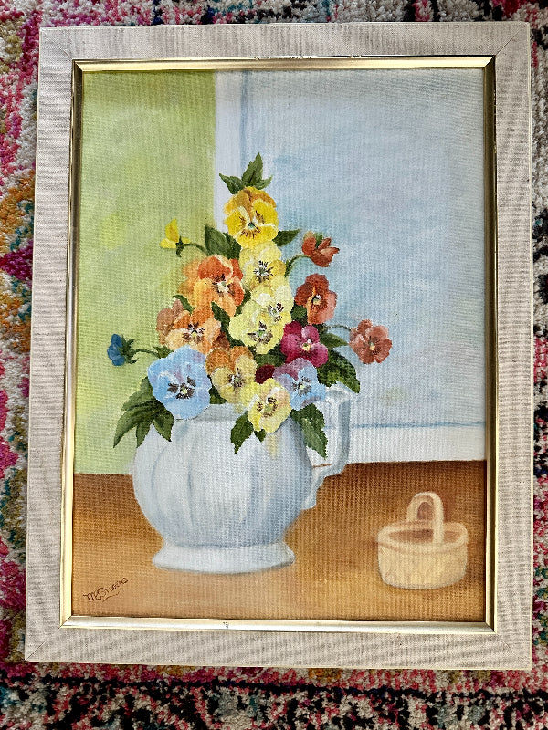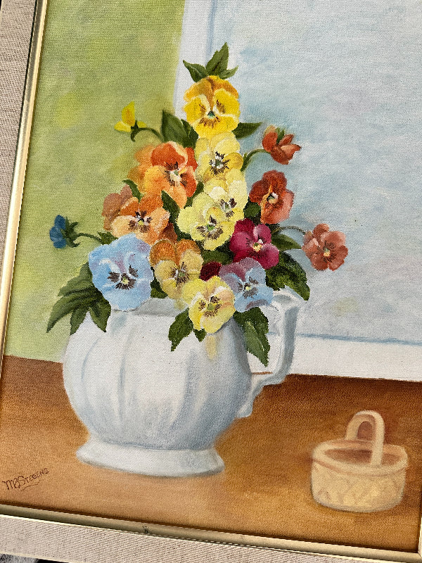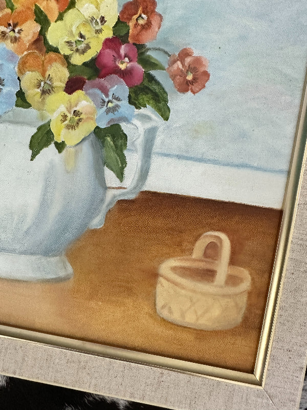 This colorful painting has a secret! There is an inscription on the back about the artist that is so sweet. Lovely bright colored pansies in a handled pitcher with a small basket next to it. The frame has a gold insert with a linen like border. Perfect for a bedroom or a gallery wall.