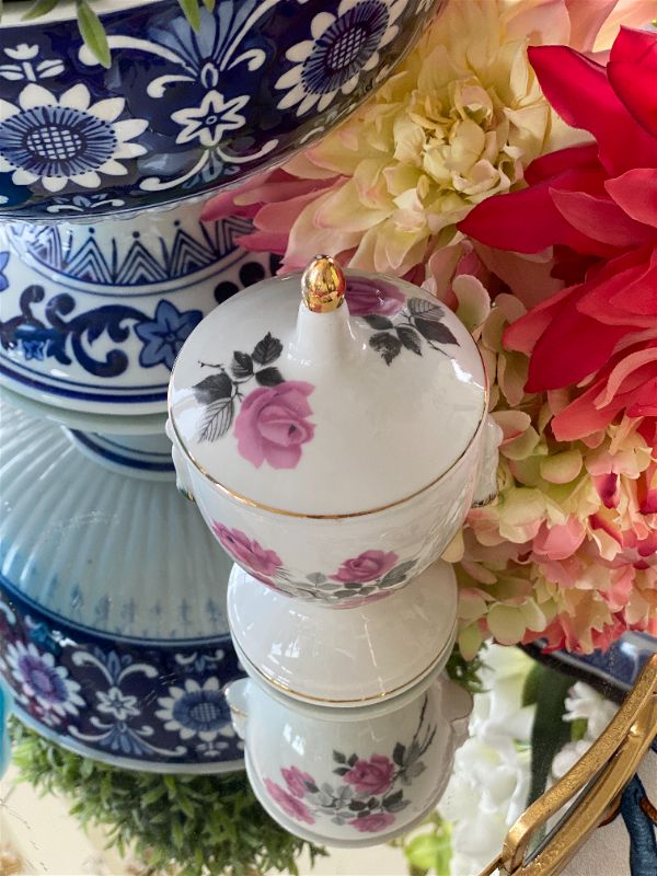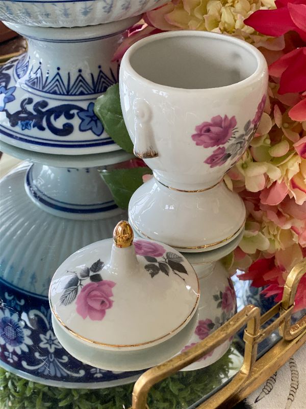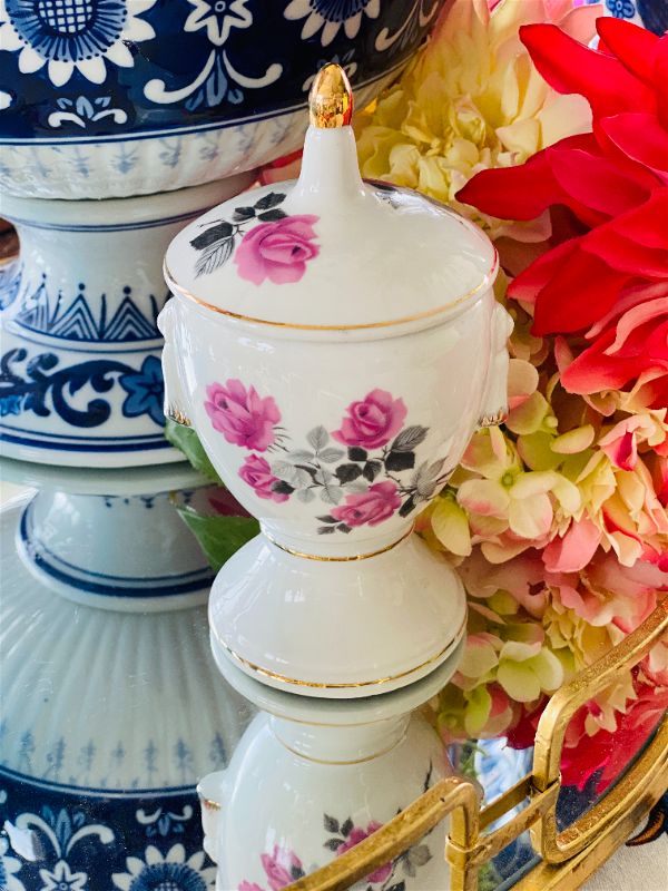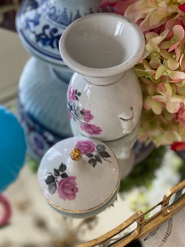 This Pedestal white with pink rose gold trim apothecary jar is a perfect fit. Cotton balls, makeup remover pads, or even small jewelry would fit nicely inside. Melt wax and make it into a candle. These jars are so sweet with function... the best combination with our vintage finds!