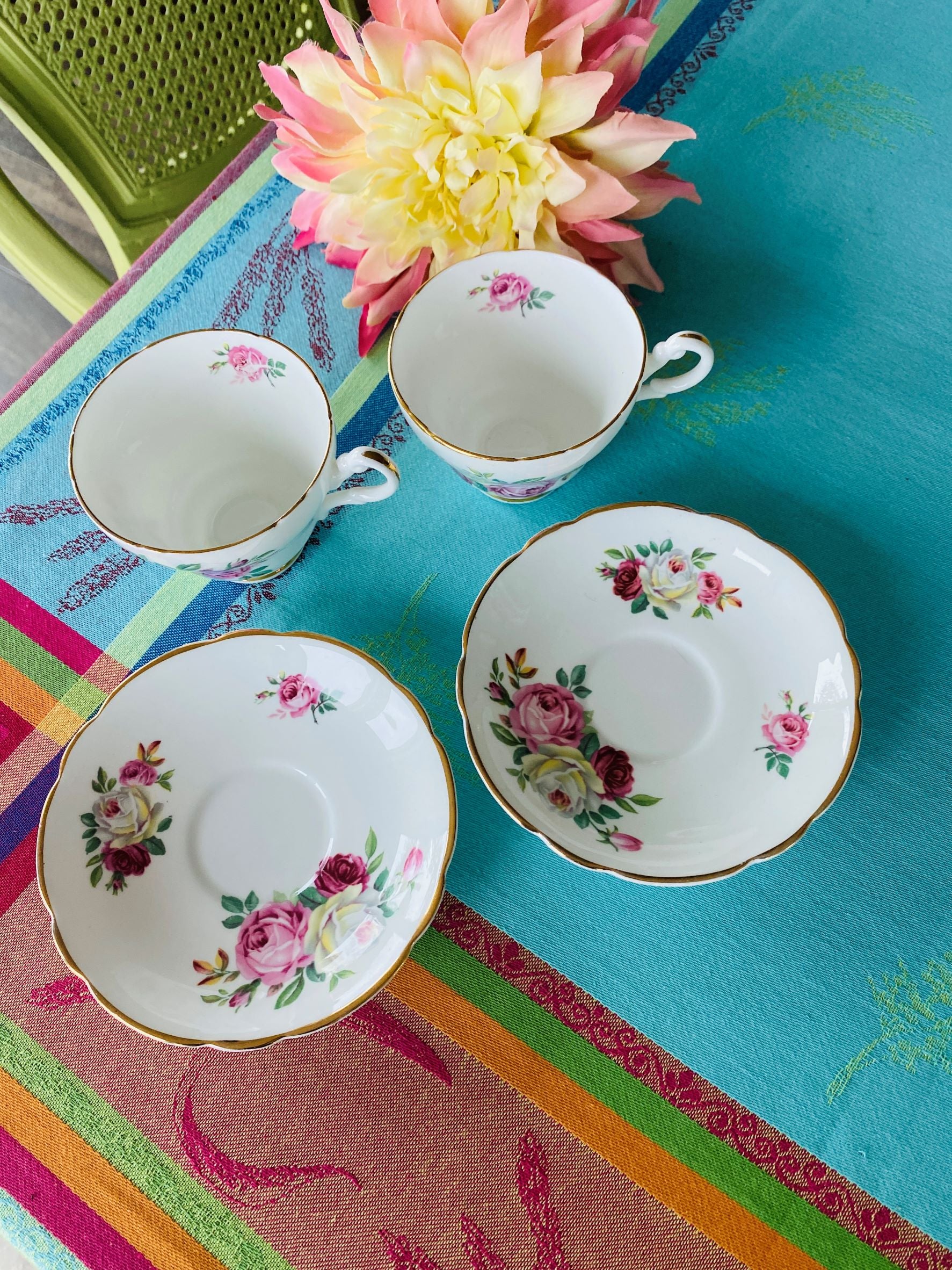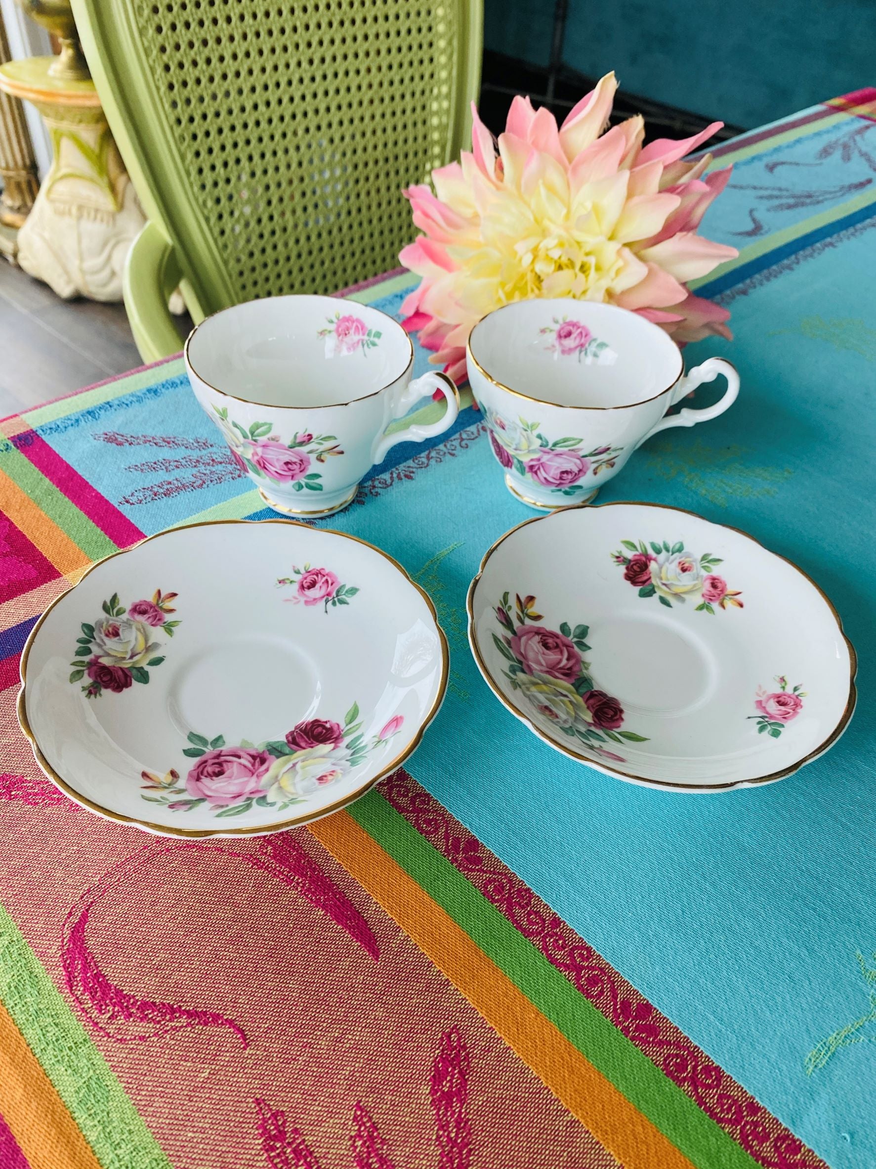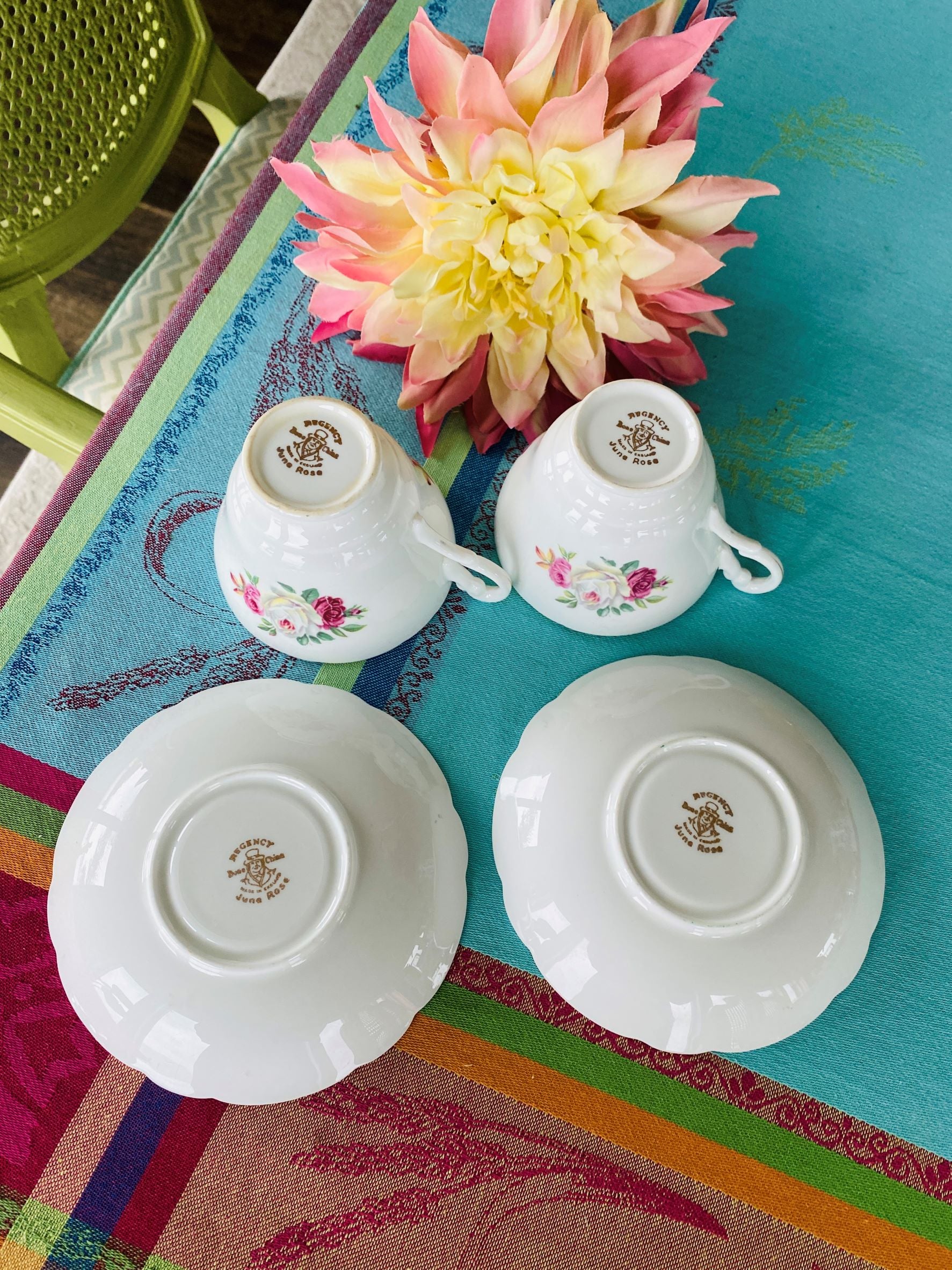 Regency Bone China Teacups and Saucers, Pair, June Rose Pattern - England