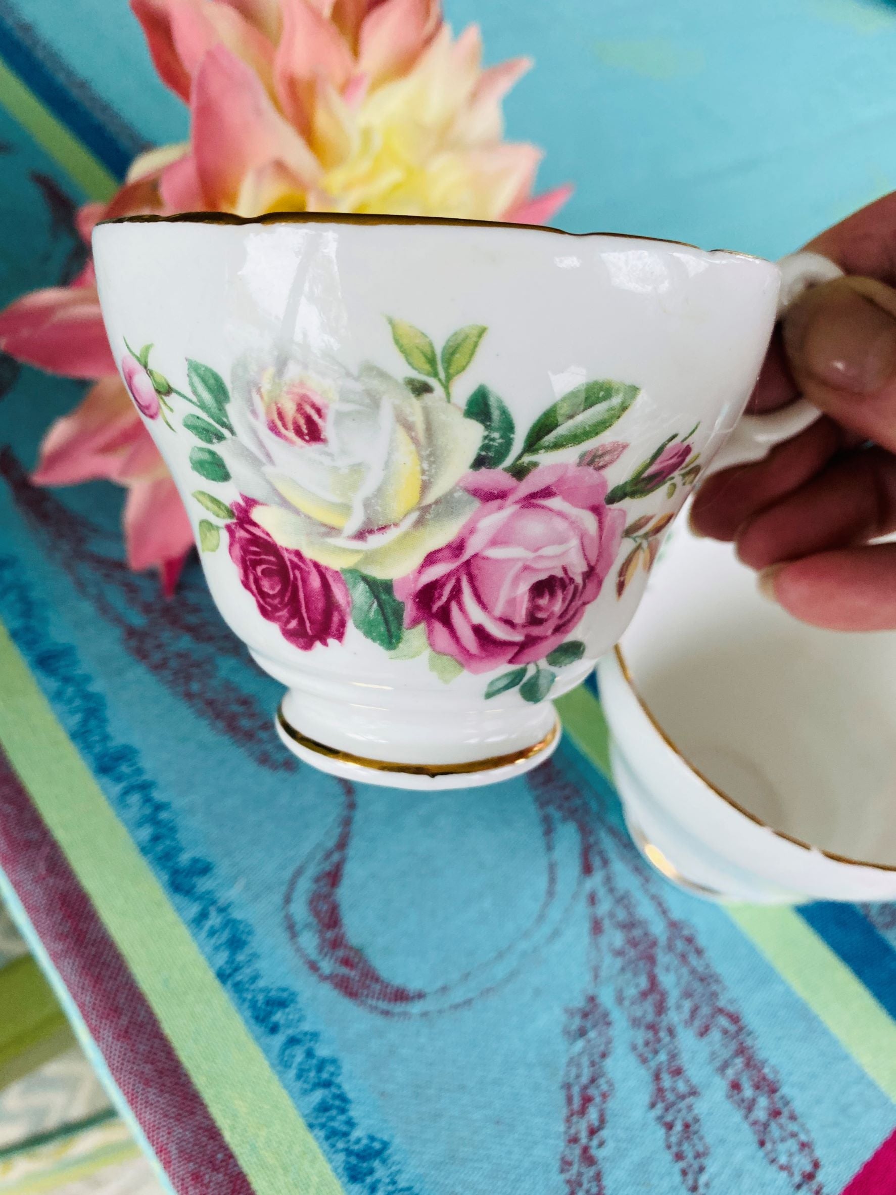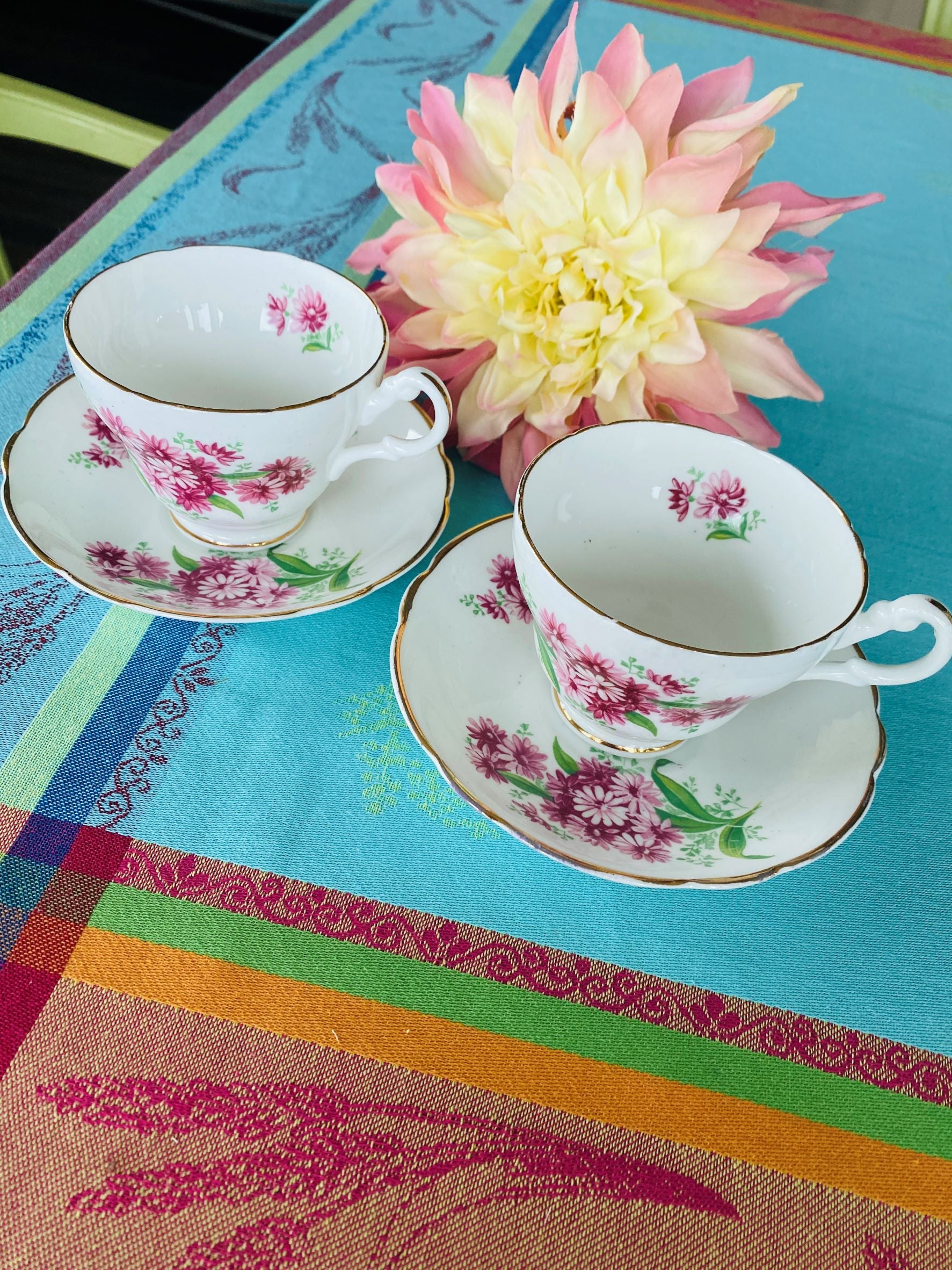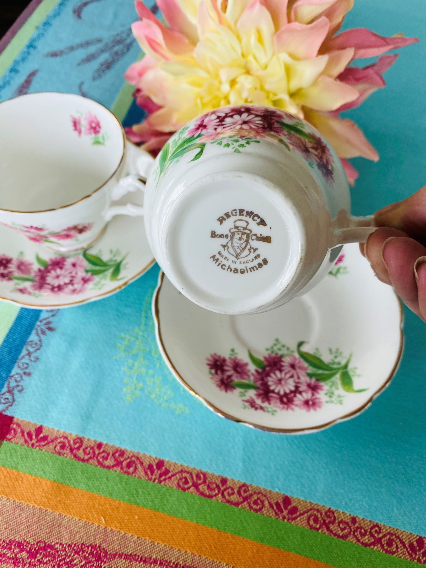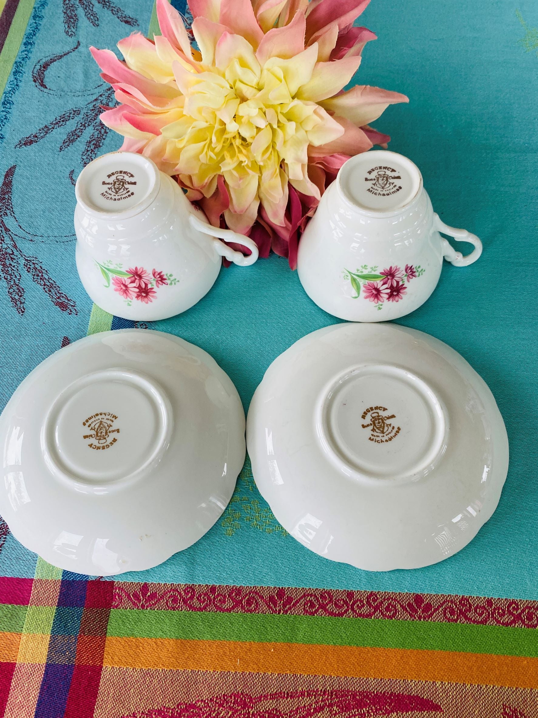Regency Bone China Teacups and Saucers, Pair, June Rose Pattern - England