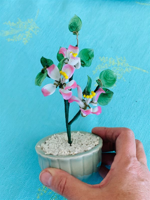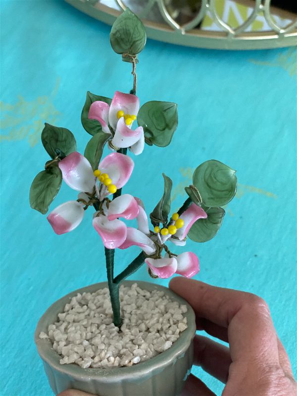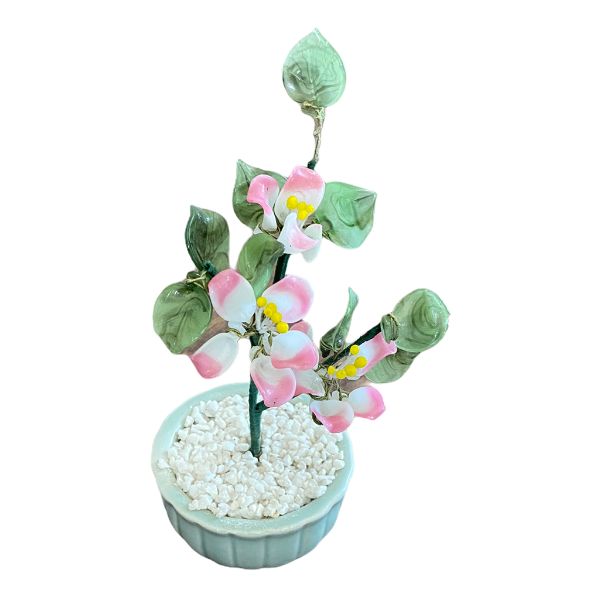 The leaves and flowers are made of Jade stone. They are potted in a ceramic planter with small white stones cemented into the base. Grab this little tree and spread positive, healing energy.