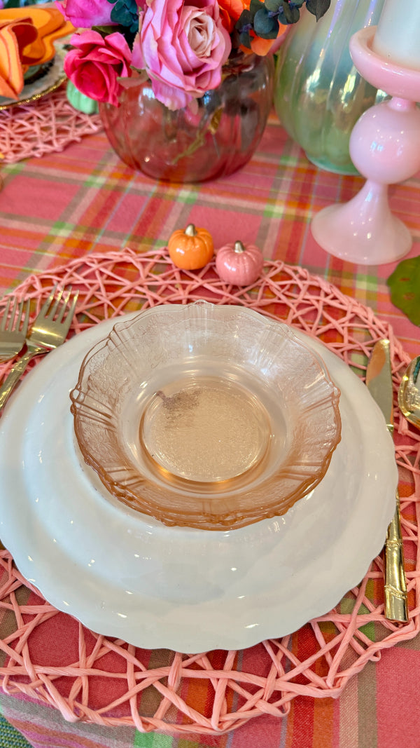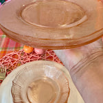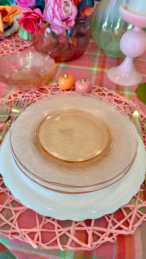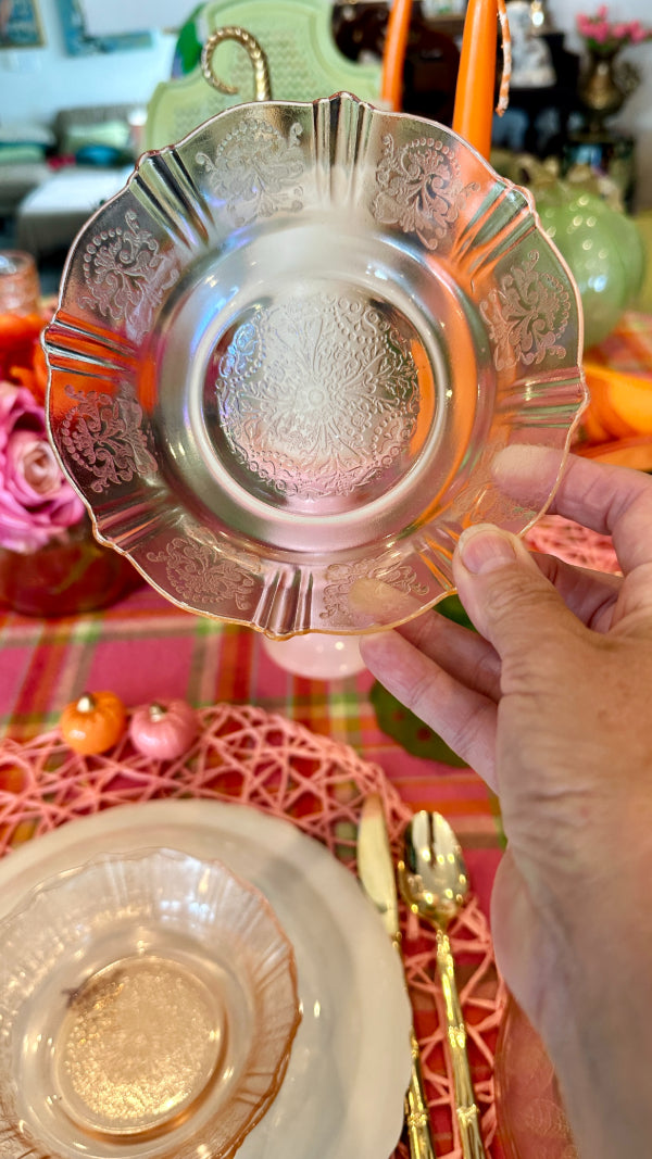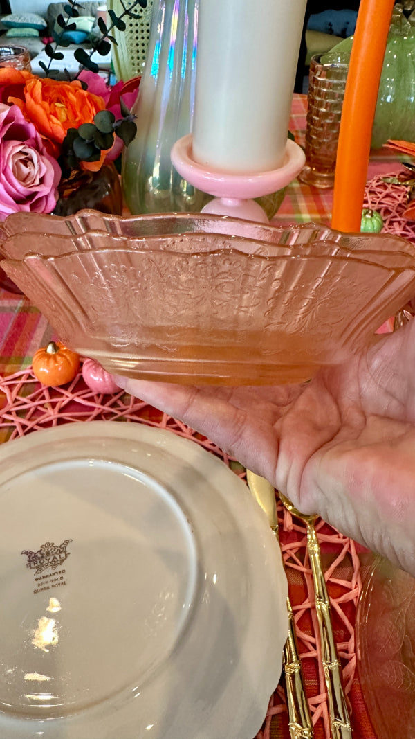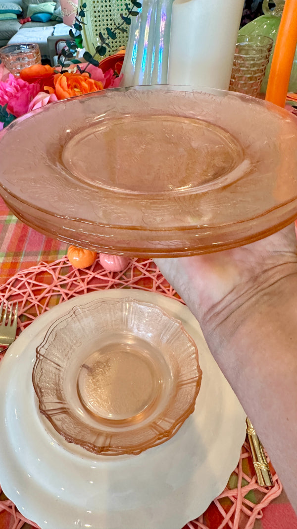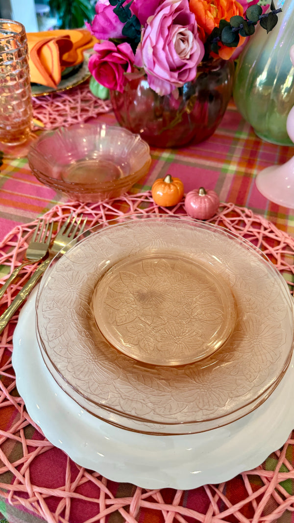 Bring vintage elegance to your table with this charming set of pink Depression glass, featuring 3 bowls and 3 salad plates. Delicately crafted with a soft pink hue, these pieces add a touch of timeless beauty to everyday meals or special occasions. Perfect for collectors or anyone looking to enhance their table setting with classic mid-century style. Durable, collectible, and utterly delightful, this set is a lovely addition to any glassware collection.