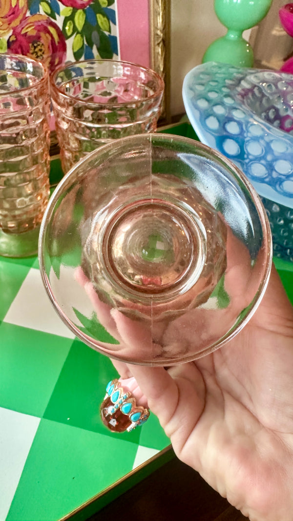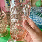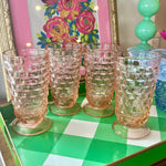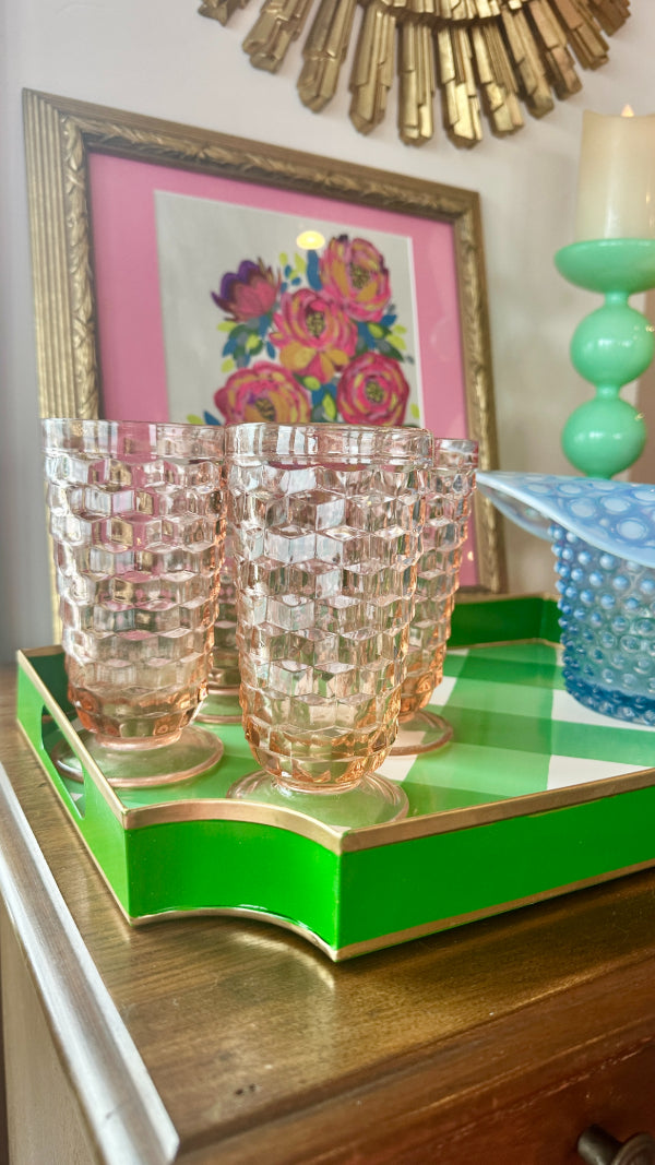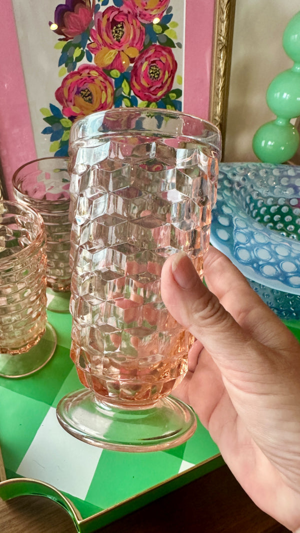Add a touch of vintage charm to your table with this beautiful set of 4 Pink Indiana Depression Glass iced tea tumblers. Crafted with classic 1930s elegance, these tall, luminous glasses feature the signature soft pink hue that makes Depression Glass so beloved among collectors.