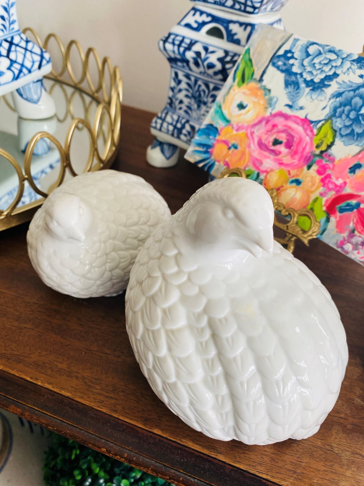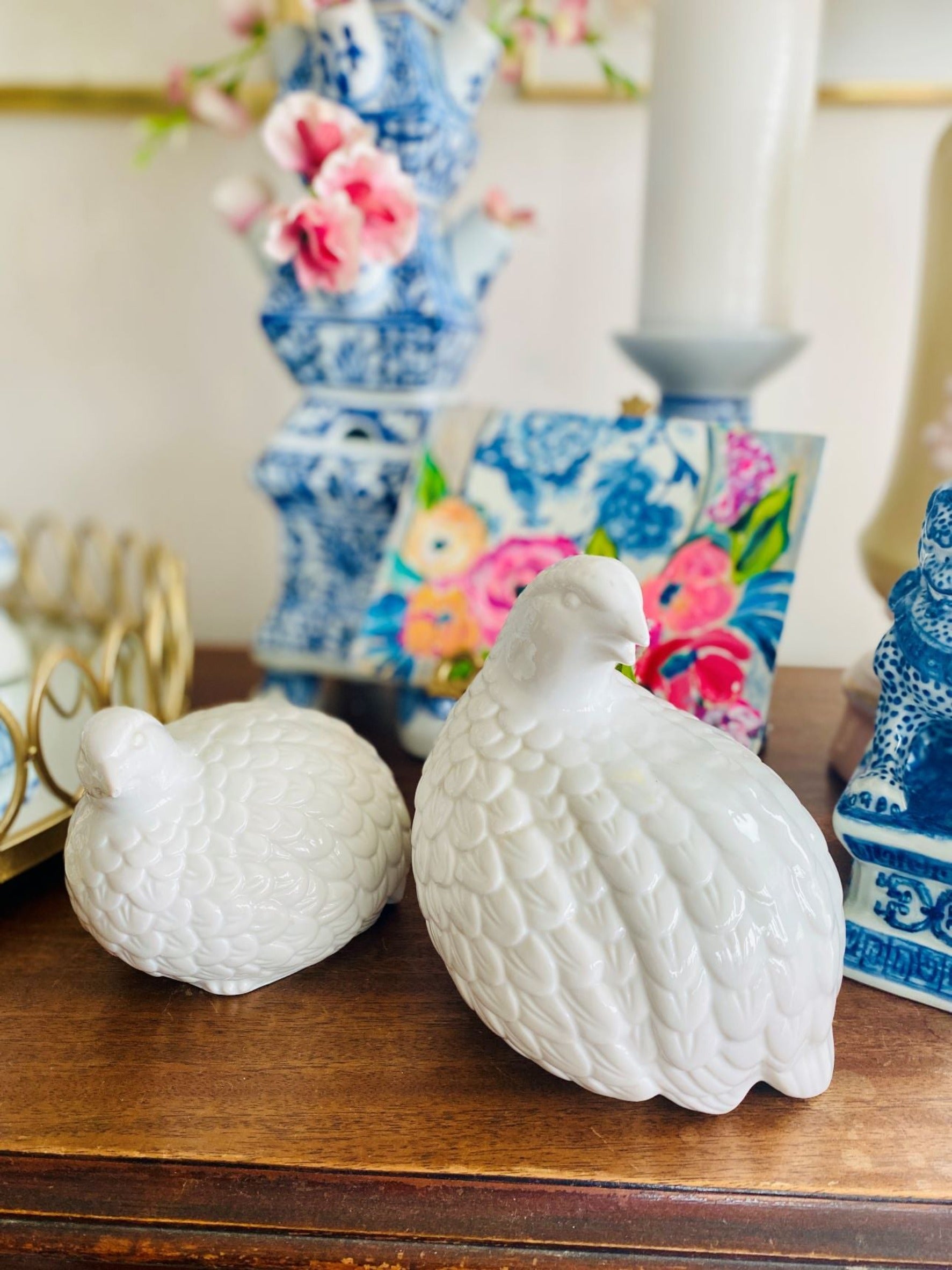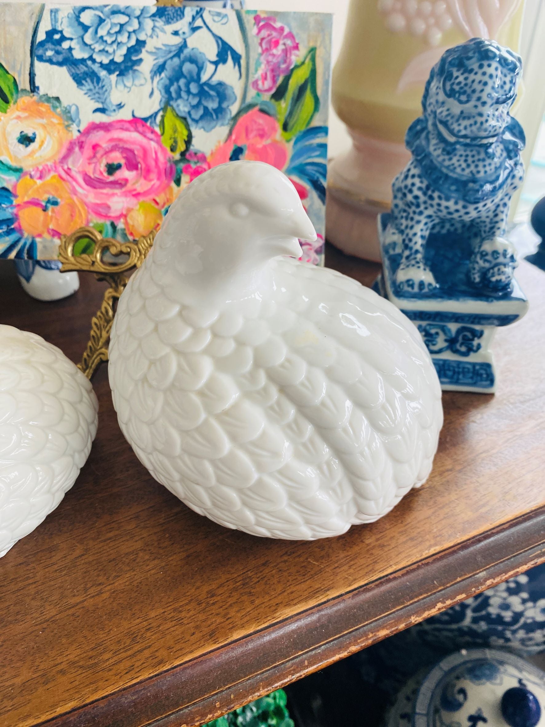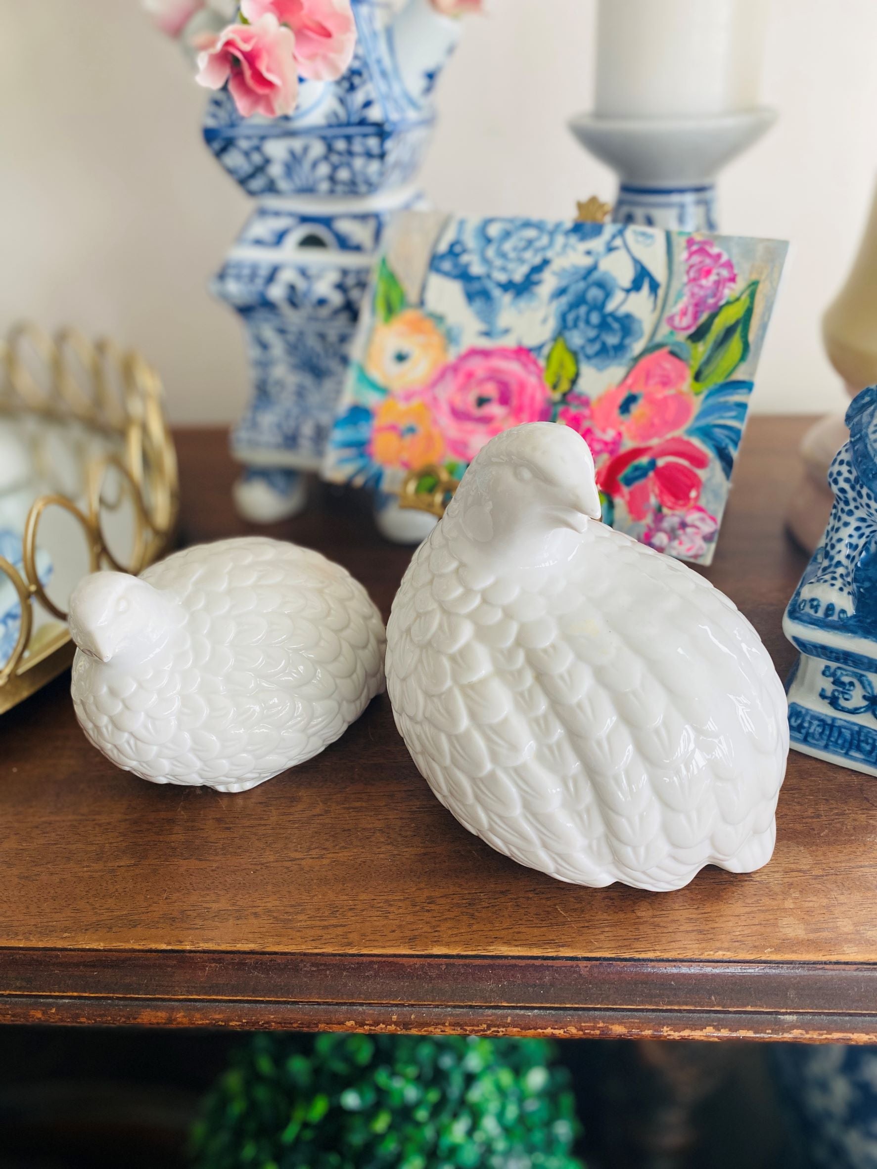 A perfect pair of quail figurines in white porcelain that will dress up your Fall decor. Delicate feathers birds with turned heads will look great on a mantle or table centerpiece display. These work well for truly any decor with their neutral white coloring. Great vintage condition no chips or cracks.