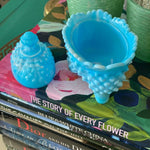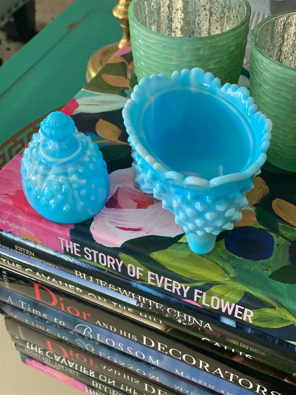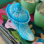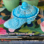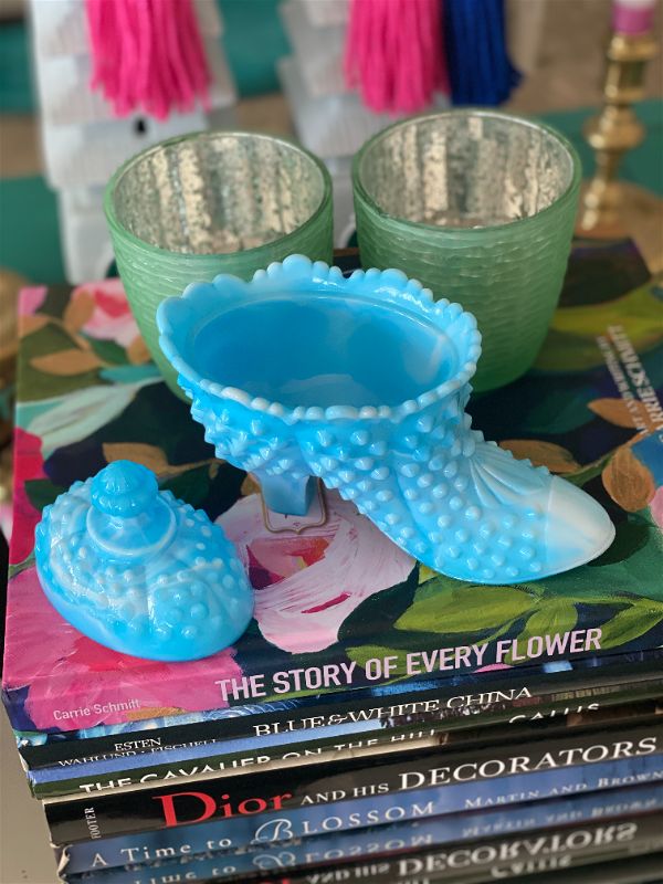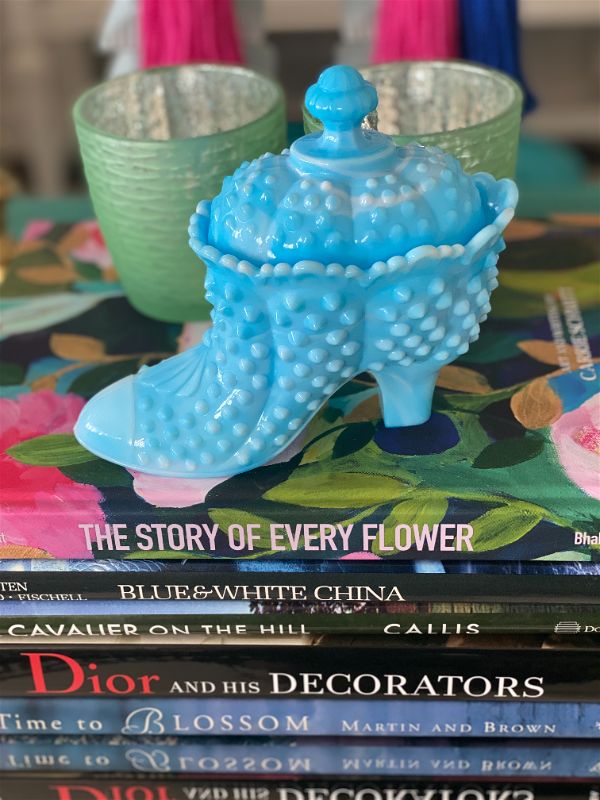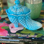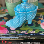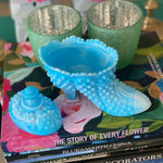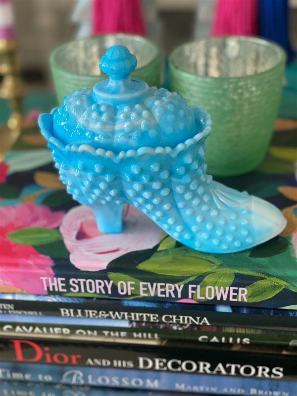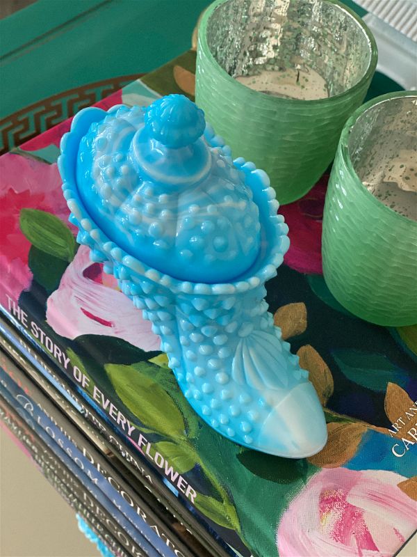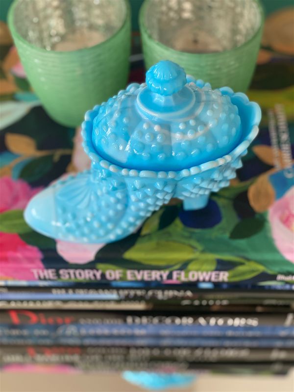 If you love collecting Fenton glass this vintage shoe is for you. Beautifully crafted milk glass with that slag blue and white swirl. Hobnail design with ruffle edge and pretty lid.Perfect to hold any of your small keepsakes on a desk, dresser, or vanity. Perfct as a shelf accent or a great addition to a milk glass collection.